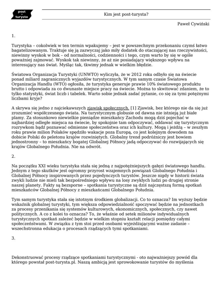 Kim jest post-turysta? Paweł Cywiński 1. Turystyka – cokolwiek w ten termin wpakujemy – jest w powszechnym przekonaniu czymś łatwo bagatelizowanym. Traktuje się ją zazwyczaj jako miły dodatek do otaczającej nas rzeczywistości, niewinny wyskok w bok – od normalności, codzienności i tego, czym warto by się w ogóle poważniej zajmować. Wyskok tak niewinny, że aż nie posiadający większego wpływu na interesujący nas świat. Myśląc tak, tkwimy jednak w wielkim błędzie. Światowa Organizacja Turystyki (UNWTO) wyliczyła, że w 2012 roku odbyło się na świecie ponad miliard zagranicznych wyjazdów turystycznych. W tym samym czasie Światowa Organizacja Handlu (WTO) ogłosiła, że turystyka generuje prawie 10% światowego produktu brutto i odpowiada za co dwunaste miejsce pracy na świecie. Można to skwitować zdaniem, że to tylko statystyki, świat liczb i tabelek. Warto sobie jednak zadać pytanie, co się za tymi potężnymi liczbami kryje? A skrywa się jedno z najciekawszych zjawisk społecznych. [1] Zjawisk, bez którego nie da się już zrozumieć współczesnego świata. Na turystycznym globusie od dawna nie istnieją już białe plamy. Za stosunkowo niewielkie pieniądze mieszkańcy Zachodu mogą dziś pojechać w najbardziej odległe miejsca na świecie, by spokojnie tam odpoczywać, oddawać się turystycznym rozrywkom bądź poznawać odmienne społeczeństwa oraz ich kultury. Mogą i jeżdżą – w zeszłym roku prawie milion Polaków spędziło wakacje poza Europą, co jest kolejnym dowodem na dobicie Polski do peletonu krajów rozwiniętych. Globalny trend podróżniczy jest bowiem jednostronny – to mieszkańcy bogatej Globalnej Północy jadą odpoczywać do rozwijających się krajów Globalnego Południa. Nie na odwrót. 2. Na początku XXI wieku turystyka stała się jedną z najpotężniejszych gałęzi światowego handlu. Jednym z tego skutków jest ogromny przyrost wzajemnych powiązań Globalnego Południa i Globalnej Północy inspirowanych przez pojedynczych turystów. Jeszcze nigdy w historii świata zwykli ludzie nie mieli tak bezpośredniego wpływu na losy zwykłych ludzi po drugiej stronie naszej planety. Fakty są bezsporne – spotkania turystyczne są dziś najczęstszą formą spotkań mieszkańców Globalnej Północy z mieszkańcami Globalnego Południa. Tym samym turystyka stała się istotnym środkiem globalizacji. Co to oznacza? Im wyższy będzie wskaźnik globalnej turystyki, tym większa odpowiedzialność spoczywać będzie na jednostkach za procesy przenikania się systemów kulturowych, ekonomicznych, społecznych, czy nawet politycznych. A co z kolei to oznacza? To, że właśnie od setek milionów indywidualnych turystycznych spotkań zależeć będzie w wielkim stopniu kształt relacji pomiędzy całymi społeczeństwami. W związku z tym stoi przed osobami wyjeżdżającymi ważne zadanie – wszechstronna edukacja o procesach rządzących tymi spotkaniami. 3. Dekonstruować procesy rządzące spotkaniami turystycznymi - oto najważniejszy powód dla którego powstał post-turysta.pl. Naszą ambicją jest sprowokowanie turystów do myślenia krytycznego, dociekania przeróżnych mechanizmów społecznych w tym co robią, poszukiwania etycznych sposobów podróży. Dlaczego nazwaliśmy projekt post-turysta? [2] Bo uważamy, że post-turystę od zwykłego turysty odróżnia świadomość globalnych współzależności, przyczyn i konsekwencji turystycznych zachowań oraz samoświadomość podlegania procesom psychologicznym, komercyjnym i ideologicznym. Jednakże przede wszystkim chodzi o innych ludzi i ich świat. Wyszliśmy z założenia, że tylko świadomy turysta, może podróżować prawdziwie odpowiedzialnie i etycznie. Dlatego dla post-turysty mieszkańcy odwiedzanych miejsc powinni być partnerami, podmiotami spotkania – nie wakacyjną obsługą lub krajobrazem. A jeżeli będą partnerami, to znaczy, że turysta ponosi również część odpowiedzialności za kształt i charakter owego spotkania turystycznego. Odpowiedzialności, która nie jest prosta niczym bułka z masłem. 4. Od pewnego czasu w wiodących amerykańskich i europejskich ośrodkach naukowych diametralnie zmienia się postrzeganie turystyki. Nikt już nie uważa, że jest ona jedynie zbiorem czysto komercyjnych działań, ujmowanych w kontekście społecznych wzorców konsumpcji i spędzania czasu wolnego. W kręgach nowej humanistyki coraz częściej zwraca się uwagę za Deanem MacCannellem, [3] że "turystyka to także rama ideologiczna dla historii, natury i tradycji, rama mająca moc przekształcania kultury i natury stosownie do swych potrzeb." Oto przykład: Coraz częściej zwraca się uwagę, że współczesna praktyka turystyczna jest głęboko osadzona w kolonialnym dyskursie. I tak jak powieści z dziewiętnastego i pierwszych lat dwudziestego wieku posiadały tendencje wzmacniające europocentryczny imperializm w umysłach społeczeństw kolonizatorów, tak przemysł turystyczny z drugiej połowy dwudziestego wieku i początków XXI wieku może wspierać ustalony strukturalnie imperialny i neokolonialny porządek w umysłach turystów. Porządek, który z założenia wydaje się być korzystniejszy dla turystów. A jeżeli tak jest – to niewątpliwie wikła nas to etycznie. Jest to zaledwie jeden z ponad trzydziestu problemów o których chcielibyśmy tutaj napisać. 5. To, co tutaj prezentujemy, jest niewątpliwie wschodzącym nurtem myślenia o współczesnej turystyce. Nurtem łączącym w sobie najpoważniejsze i najnowsze trendy w światowej myśli o podróżowaniu, turystyce, wakacjach. Zależy nam, aby przedstawić w naszej wirtualnej publikacji interdyscyplinarne spojrzenie na całe to zjawisko. Interesują nas przeróżne perspektywy: ekonomiczna, socjologiczna, postkolonialna, postmodernistyczna, poststrukturalna, ekologiczna, związana ze zrównoważonymi i odpowiedzialnymi formami turystyki, filozofią dial