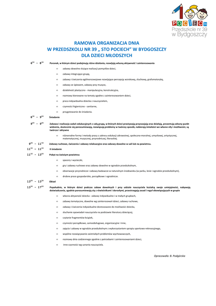 ramowa organizacja dnia w przedszkolu nr 39 „ sto pociech”