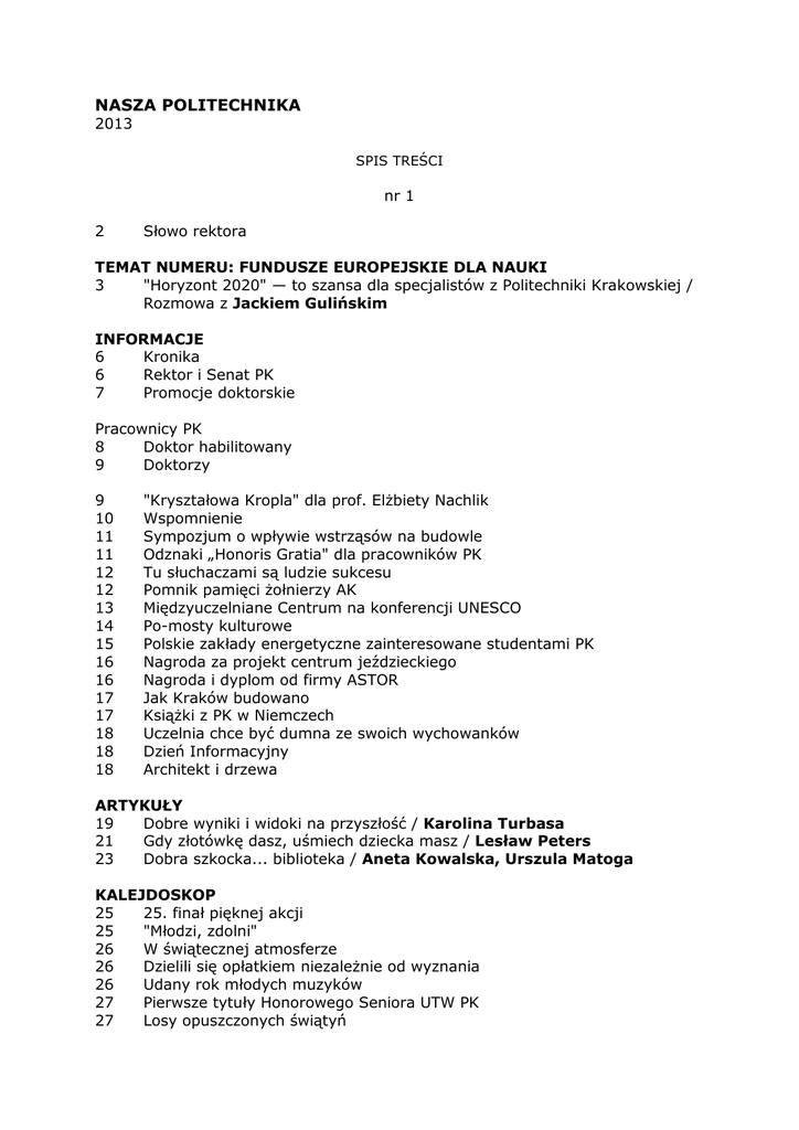 NASZA POLITECHNIKA 2013 SPIS TREŚCI nr 1 2 Słowo rektora TEMAT NUMERU: FUNDUSZE EUROPEJSKIE DLA NAUKI 3 "Horyzont 2020" — to szansa dla specjalistów z Politechniki Krakowskiej / Rozmowa z Jackiem Gulińskim INFORMACJE 6 Kronika 6 Rektor i Senat PK 7 Promocje doktorskie Pracownicy PK 8 Doktor habilitowany 9 Doktorzy 9 10 11 11 12 12 13 14 15 16 16 17 17 18 18 18 "Kryształowa Kropla" dla prof. Elżbiety Nachlik Wspomnienie Sympozjum o wpływie wstrząsów na budowle Odznaki „Honoris Gratia" dla pracowników PK Tu słuchaczami są ludzie sukcesu Pomnik pamięci żołnierzy AK Międzyuczelniane Centrum na konferencji UNESCO Po-mosty kulturowe Polskie zakłady energetyczne zainteresowane studentami PK Nagroda za projekt centrum jeździeckiego Nagroda i dyplom od firmy ASTOR Jak Kraków budowano Książki z PK w Niemczech Uczelnia chce być dumna ze swoich wychowanków Dzień Informacyjny Architekt i drzewa ARTYKUŁY 19 Dobre wyniki i widoki na przyszłość / Karolina Turbasa 21 Gdy złotówkę dasz, uśmiech dziecka masz / Lesław Peters 23 Dobra szkocka... biblioteka / Aneta Kowalska, Urszula Matoga KALEJDOSKOP 25 25. finał pięknej akcji 25 "Młodzi, zdolni" 26 W świątecznej atmosferze 26 Dzielili się opłatkiem niezależnie od wyznania 26 Udany rok młodych muzyków 27 Pierwsze tytuły Honorowego Seniora UTW PK 27 Losy opuszczonych świątyń 28 29 30 Realizując nowy pomysł, muszę pracować przy muzyce O Politechnice Krakowskiej napisali Dla studentów i dla mistrzów. Wystawa zdjęć na otwarcie nowej galerii Galeria "Gil" 31 Kazachstan — architektoniczne marzenia — wystawa fotografii Sabiny Kuc Galeria "Kotłownia" 31 Po zmierzchu — wystawa prac malarskich Jana Skalskiego 32 Na koniec numeru nr 2 2 Słowo rektora TEMAT NUMERU: KU CZCI ŻOŁNIERZY POLSKI PODZIEMNEJ 3 Muzeum Armii Krajowej i Politechnika Krakowska - dobre sąsiedztwo / Krzysztof Wielgus, Tadeusz Żaba, Robert Springwald INFORMACJE 9 Kronika 9 Rektor i Senat PK Pracownicy PK 10 Profesor tytularny 11 Wspomnienie 12 14 15 16 16 17 18 18 Nagrody dla pracowników PK Spotkanie na temat bezpieczeństwa w budownictwie Młodzi naukowcy pokierują własnymi zespołami Połączył hobby z pracą zawodową Zielone oblicze chemii Kard. Franciszek Macharski wśród słuchaczy UTW Kronika 12 tysięcy kilometrów Studenci wybrali ARTYKUŁY 19 Dyplom to nie wszystko ... wynika z przeprowadzonego przez Biuro Karier PK badania potrzeb szkoleniowych studentów / Karolina Turbasa 22 Pożyteczne abstrakcje / Sławomir Milewski 25 Koniec świata modernistów. Betonowe rewolucje Oscara Niemeyera / Marcin Charciarek KALEJDOSKOP 28 Laureat bronił represjonowanych 28 To było kolędowanie! 29 Mostowi wędrowcy z pieśnią na ustach 30 O Politechnice Krakowskiej napisali Galeria "Gil" 31 XIII Wyprawa Mostowa "Austria - Korsyka 2012" - wystawa fotografii Jana Zycha Galeria "Kotłownia" 31 "Po-mosty kulturowe"- Nowa Przestrzeń - wystawa projektów przygotowanych podczas warsztatów studentów ASP, PK i UJ 32 Na koniec numeru nr 3 2 Słowo rektora TEMAT NUMERU: TECHNIKA MEDYCYNIE 4 Pożyteczne spotkania inżynierów z lekarzami / Lesław Peters 7 Uczelnie współpracują dla zdrowia / Stanisław Rumian INFORMACJE 9 Podpisanie umowy z Urzędem Marszałkowskim 10 Zaszczytna nagroda dla prof. Janusza Kacprzyka 10 Pamięci Michała Życzkowskiego 11 Kronika 11 Rektor i Senat PK Pracownicy PK 12 Profesor tytularny 12 Doktorzy 13 Wspomnienie 14 15 15 15 16 16 Strategiczne myślenie o uczelni Porozumienie PK z Galicyjską Izbą Budownictwa Nowe możliwości studiowania w USA Repozytorium PK najlepsze w Polsce Dar niemieckiego potentata branży motoryzacyjnej Każdy może wesprzeć budowę Panteonu Narodowego ARTYKUŁY 17 Mistrz wymagający i zatroskany. Wspomnienie w dziesiątą rocznicę śmierci profesora Janusza Bogdanowskiego / Anna Mitkowska 21 Janusz Bogdanowski - architekt ze szkicownikiem w dłoni / Monika Bogdanowska 25 Filozofia budowania metra / Eugeniusz Szumakowicz KALEJDOSKOP 27 Lokal na szynach 28 XII Festiwal Sportu. Wszyscy byli zwycięzcami 29 O Politechnice napisali 30 Ryszard Grazda pokazał swoją twórczość w Galerii A 30 Koncert karnawałowy Galeria "Gil" 31 Nowa Zelandia - krajobraz z końca świata. Wystawa fotografii Włodzimierza Musiała Galeria "Kotłownia" 31 "Drogą w stronę Florencji" - wystawa malarstwa Marcina Barańskiego 32 Na koniec numeru nr 4 2 Słowo rektora TEMAT NUMERU: DYPLOM SPOŁECZNIE UŻYTECZNY 3 Szansa dla wyjątkowego zabytku / Lesław Peters 8 Oferta PK dla lokalnych społeczności INFORMACJE 9 Walentin A. Szarnin honorowym profesorem Politechniki Krakowskiej 10 Rektor i Senat PK 11 Kronika Pracownicy PK 12 Profesorowie tytularni 14 Doktor habilitowany 15 15 16 16 17 18 19 19 20 PK w finale "Top 500 Innovators" Dyplomy ministra dla chemików z PK Wydział Inżynierii i Technologii Chemicznej znowu na medal Aby na budowach było bezpieczniej Innowacje rywalizowały na antenie W Centrum Transferu Technologii... sukces na wysokim obcasie Polepszą się warunki studiowania Karta dla studentów obcokrajowców Krakowski współtwórca Gdyni ARTYKUŁY 21 Formulacje dla urody i higieny. Chemia i technologia kosmetyków na Politechnice Krakowskiej / Elżbieta Sikora 23 Komputer - inspirujące narzędzie sztuki / Zbigniew Latała KALEJDOSKOP 27 Muzyka nie tylko do słuchania / Rozmowa z Wiesławem Olejniczakiem 28 Zmagania VIP-ów nowością Biegu Kościuszkowskiego 29 Dzień pod znakiem ∏ 29 Namalowali swój wydział 29 O Politechnice Krakowskiej napisali Galeria "Gil" 31 "Zagrożony świat" - rysunki Agnieszki Półroli Galeria "Kotłownia" 31 "Maryniści 2013" - wystawa malarstwa 32 Na koniec numeru nr 5(117) 2 Słowo rektora TEMAT NUMERU: POŁĄCZYŁA ICH POLITECHNIKA 3 Po 50 latach znowu razem / Lesław Peters INFORMACJE 7 Nie piszę muzyki od pierwszego akordu. Gościem Politechniki Krakowskiej był Krzysztof Penderecki / Lesław Peters 8 Święto Szkoły 8 Rektor i Senat PK 9 Kronika P