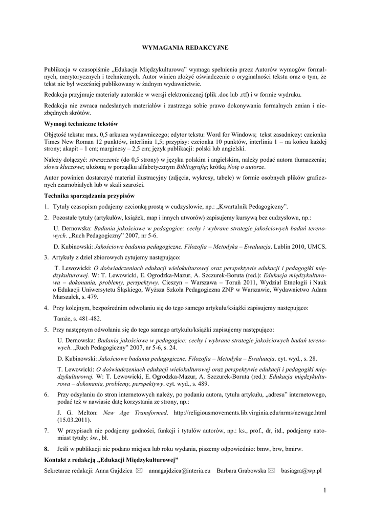 WYMAGANIA REDAKCYJNE Publikacja w czasopiśmie „Edukacja Międzykulturowa” wymaga spełnienia przez Autorów wymogów formalnych, merytorycznych i technicznych. Autor winien złożyć oświadczenie o oryginalności tekstu oraz o tym, że tekst nie był wcześniej publikowany w żadnym wydawnictwie. Redakcja przyjmuje materiały autorskie w wersji elektronicznej (plik .doc lub .rtf) i w formie wydruku. Redakcja nie zwraca nadesłanych materiałów i zastrzega sobie prawo dokonywania formalnych zmian i niezbędnych skrótów. Wymogi techniczne tekstów Objętość tekstu: max. 0,5 arkusza wydawniczego; edytor tekstu: Word for Windows; tekst zasadniczy: czcionka Times New Roman 12 punktów, interlinia 1,5; przypisy: czcionka 10 punktów, interlinia 1 – na końcu każdej strony; akapit – 1 cm; marginesy – 2,5 cm; język publikacji: polski lub angielski. Należy dołączyć: streszczenie (do 0,5 strony) w języku polskim i angielskim, należy podać autora tłumaczenia; słowa kluczowe; ułożoną w porządku alfabetycznym Bibliografię; krótką Notę o autorze. Autor powinien dostarczyć materiał ilustracyjny (zdjęcia, wykresy, tabele) w formie osobnych plików graficznych czarnobiałych lub w skali szarości. Technika sporządzania przypisów 1. Tytuły czasopism podajemy czcionką prostą w cudzysłowie, np.: „Kwartalnik Pedagogiczny”. 2. Pozostałe tytuły (artykułów, książek, map i innych utworów) zapisujemy kursywą bez cudzysłowu, np.: U. Dernowska: Badania jakościowe w pedagogice: cechy i wybrane strategie jakościowych badań terenowych. „Ruch Pedagogiczny” 2007, nr 5-6. D. Kubinowski: Jakościowe badania pedagogiczne. Filozofia – Metodyka – Ewaluacja. Lublin 2010, UMCS. 3. Artykuły z dzieł zbiorowych cytujemy następująco: T. Lewowicki: O doświadczeniach edukacji wielokulturowej oraz perspektywie edukacji i pedagogiki międzykulturowej. W: T. Lewowicki, E. Ogrodzka-Mazur, A. Szczurek-Boruta (red.): Edukacja międzykulturowa – dokonania, problemy, perspektywy. Cieszyn – Warszawa – Toruń 2011, Wydział Etnologii i Nauk o Edukacji Uniwersytetu Śląskiego, Wyższa Szkoła Pedagogiczna ZNP w Warszawie, Wydawnictwo Adam Marszałek, s. 479. 4. Przy kolejnym, bezpośrednim odwołaniu się do tego samego artykułu/książki zapisujemy następująco: Tamże, s. 481-482. 5. Przy następnym odwołaniu się do tego samego artykułu/książki zapisujemy następująco: U. Dernowska: Badania jakościowe w pedagogice: cechy i wybrane strategie jakościowych badań terenowych. „Ruch Pedagogiczny” 2007, nr 5-6, s. 24. D. Kubinowski: Jakościowe badania pedagogiczne. Filozofia – Metodyka – Ewaluacja. cyt. wyd., s. 28. T. Lewowicki: O doświadczeniach edukacji wielokulturowej oraz perspektywie edukacji i pedagogiki międzykulturowej. W: T. Lewowicki, E. Ogrodzka-Mazur, A. Szczurek-Boruta (red.): Edukacja międzykulturowa – dokonania, problemy, perspektywy. cyt. wyd., s. 489. 6. Przy odsyłaniu do stron internetowych należy, po podaniu autora, tytułu artykułu, „adresu” internetowego, podać też w nawiasie datę korzystania ze strony, np.: J. G. Melton: New Age Transformed. http://religiousmovements.lib.virginia.edu/nrms/newage.html (15.03.2011). 7. W przypisach nie podajemy godności, funkcji i tytułów autorów, np.: ks., prof., dr, itd., podajemy natomiast tytuły: św., bł. 8. Jeśli w publikacji nie podano miejsca lub roku wydania, piszemy odpowiednio: bmw, brw, bmirw. Kontakt z redakcją „Edukacji Międzykulturowej” Sekretarze redakcji: Anna Gajdzica [email protected] Barbara Grabowska [email protected] 1 Information for authors of ‘Intercultural Education’ Publishing in the journal "Intercultural Education" demands from the authors fulfilling the formal, content, and technical requirements. An author should place a statement of authenticity of the text and should confirm that the text has not been published earlier in any publishing house. The editors accept authors’ materials both in the electronic version (.doc or .rtf files) and in the printed form. The editors do not return sent materials and stipulate the right to make formal changes and indispensable abridgements. Technical requirements for texts Volume: max. 0.5 of an editorial sheet; word editing program: Word for Windows; body text: font Times New Roman 12 points, leading 1.5; footnotes: font 10 points, leading 1 – end of each page; indention – 1 cm; margins – 2.5 cm; language: Polish or English. The following should be attached: summary (max. 0.5 of a page) in Polish and English, with the translation author provided; key words; bibliography in alphabetical arrangement; brief note about the author The author should provide illustrative materials (photographs, diagrams, tables) as separate black-and-white or grey-scale graphic files. Footnotes 1. Titles of periodicals are written in the normal font in quotation marks, e.g.: “Kwartalnik Pedagogiczny”. 2. The other titles (of articles, books, maps and other works) are written in italics without quotation marks, e.g.: U. Dernowska: Badania jakościowe w pedagogice: cechy i wybrane strategie jakościowych badań tere nowych. ”Ruch Pedagogiczny” 2007, No 5-6. D. Kubinowski: Jakościowe badania pedagogiczne. Filozofia – Metodyka – Ewaluacja. Lublin 2010, UMCS. 3. Articles in collective works are cited in the following way: T. Lewowicki: O doświadczeniach edukacji wielokulturowej oraz perspektywie edukacji i pedagogiki międzykulturowej. In: T. Lewowicki, E. Ogrodzka-Mazur, A. Szczurek-Boruta (eds): Edukacja międzykulturowa – dokonania, problemy, perspektywy. Cieszyn – Warszawa – Toruń 2011, Wydział Etnologii i Nauk o Edukacji Uniwersytetu Śląskiego, Wyższa Szkoła Pedagogiczna ZNP w Warszawie, Wydawnictwo Adam Marszałek, p. 479. 4. At the next direct reference to the same article/book the following should be written: Ibid., pp. 481-482. 5. At the next reference to the same article/book the fo