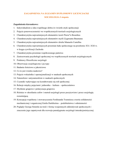 ZAGADNIENIA NA EGZAMIN DYPLOMOWY LICENCJACKI SOCJOLOGIA I stopnia Zagadnienia kierunkowe: 1. Indywidualizm a idea wspólnego dobra (w świetle etyki społecznej) 2. Pojęcie ponowoczesności we współczesnych teoriach socjologicznych 3. Charakterystyka najważniejszych elementów teorii Pierre"a Bourdieu 4. Charakterystyka najważniejszych elementów myśli Zygmunta Baumana 5. Charakterystyka najważniejszych elementów dzieła Manuela Castellsa 6. Charakterystyka najważniejszych przemian ładu społecznego na przełomie XX i XXI w. w kręgu cywilizacji Zachodu 7. Charakterystyka przemian współczesnego państwa 8. Zastosowania psychologii społecznej we współczesnych teoriach socjologicznych 9. Podstawy filozoficzne socjologii 10. Obserwacja socjologiczna i jej typy 11. Badania ilościowe a jakościowe 12. Co to jest wiedza naukowa? 13. Pojęcie wskaźnika i operacjonalizacji w naukach społecznych 14. Naturalizm i antynaturalizm w naukach społecznych 15. Czynniki wpływające na kształtowanie się roli społecznej 16. Relacje między pojęciami: jednostka – kultura – społeczeństwo 17. Myślenie grupowe i polaryzacja grupowa 18. Różnice w określaniu celów i metod socjologii przez pozytywizm i przez socjologię rozumiejącą 19. Koncepcja wspólnoty i stowarzyszenia Ferdinanda Toenniesa a teoria solidarności mechanicznej i organicznej Emila Durkheima – podobieństwa i odmienności 20. Poglądy Georga Simmla na treść i formę wzajemnych oddziaływań społecznych i znaczenie jego zapatrywań dla rozwoju paradygmatu socjologii interakcjonistycznej Zagadnienia specjalnościowe: specjalność Socjologia komunikacji i procesów społecznych 1. Model procesu komunikacji 2. Rodzaje komunikacji 3. Funkcje komunikacji 4. Zakłócenia w procesie komunikacji. Przykłady 5. Rodzaje grup społecznych 6. Więź społeczna i kontrola społeczna. Przykłady 7. Pułapka społeczna. Przykład pułapki typu "tragedia wspólnego pastwiska" oraz "pułapka brakującego bohatera" 8. Etapy ewolucji środków komunikowania wg Goban-Klas. Charakterystyka wybranego etapu 9. Strefy dystansu społecznego. Charakterystyka wybranej strefy 10. Mechanizmy manipulacji. Rodzaje, przykłady 11. Przeobrażenia systemu oświaty w warunkach polskiej transformacji ustrojowej 12. Podstawowe różnice miedzy procesem mediacji a procesem negocjacji 13. Sposoby pokonywania impasu w negocjacjach 14. Przebieg konfliktu w grupie o ścisłe strukturze i w grupie o luźnej strukturze w teorii L. Cosera 15. Zasady udzielania prawidłowej porady zawodowej 16. Trzy filary funkcjonowania Unii Europejskiej 17. Typy bezrobocia. Definicje i przykłady w kontekście polskiego rynku pracy 18. Polska jako kraj imigracyjny: charakterystyka, uwarunkowania i konsekwencje migracji zagranicznych do Polski 19. Feminizacja migracji i jej przyczyny. Przykłady 20. Konflikty mimetyczne i ich rozładowywanie przez mechanizm kozła ofiarnego w koncepcji Rene Girarda Zagadnienia specjalnościowe: specjalność Socjologia kultury 1. Uczestnictwo w kulturze: cechy, typy, uwarunkowania 2. Specyfika uczestnictwa w kulturze popularnej 3. Specyfika cyberkultury 4. Turystyka jako forma uczestnictwa w kulturze 5. Charakterystyka zjawiska feminizmu 6. Płeć biologiczna a płeć kulturowa 7. Człowiek stary we współczesnym społeczeństwie 8. Różnice i podobieństwa między kulturą masową, popularną, ludową i elitarną 9. Ostatnio przeczytana książka z zakresu socjologii kultury (omówienie, refleksje) 10. Mechanizmy zmian kulturowych i mechanizmy oporu kultury przeciw zmianom 11. Kultura konsumpcyjna: jej cechy, uwarunkowania oraz skutki społeczne i kulturowe 12. Wpływ kultury konsumpcyjnej na doświadczanie czasu 13. Czas wolny jako zjawisko historyczne: cechy, uwarunkowania i przemiany 14. Pamięć zbiorowa, tradycja i historia: różnice i podobieństwa 15. Moralność i jej części składowe 16. Czynniki wpływające na moralność. Charakterystyka, przykłady 17. Charakterystyka współczesnych przemian obyczajowości codziennej i odświętnej 18. Wpływ nowych mediów na życie codzienne i obyczajowość 19. Wpływ nowych technologii komunikacyjnych i informacyjnych na teorie kultury i teorie społeczeństwa 20. Dyskryminacja ze względu na płeć. Przykłady ZAGADNIENIA NA EGZAMIN DYPLOMOWY MAGISTERSKI SOCJOLOGIA II stopnia Zagadnienia kierunkowe: 1. Obserwacja socjologiczna i jej typy 2. Badania ilościowe a jakościowe 3. Co to jest wiedza naukowa? 4. Pojęcie wskaźnika i operacjonalizacji w naukach społecznych 5. Czynniki wpływające na kształtowanie się roli społecznej 6. Różnice w określaniu celów i metod socjologii przez pozytywizm i przez socjologię rozumiejącą 7. Cechy społeczeństwa postmodernistycznego według Zygmunta Baumana 8. Najważniejsze przemiany ładu społecznego na przełomie XX i XXI w. w kręgu cywilizacji Zachodu 9. Zmiany kulturowe i ich konsekwencja dla życia społecznego. Przykłady 10. Globalizacja, jej wymiary i konsekwencje 11. Nierówności społeczne a wykształcenie 12. Rodzina - uwarunkowania społeczno-kulturowe form życia rodzinnego 13. Przemiany współczesnej rodziny - teorie socjologiczne i demograficzne 14. Socjalizacja a indoktrynacja i „pranie mózgu” 15. Charakterystyka wybranej teorii socjologicznej (funkcjonalizm, teoria konfliktu, interakcjonizm symboliczny) 16. Współczesne teorie stratyfikacji społecznej 17. Stare i nowe wymiary zróżnicowania społecznego 18. Grupy wykluczone i obszary ich wykluczenia. Charakterystyka, przykłady 19. Charakterystyka pojęcia anomii w ujęciu Durkheima i Mertona 20. Charakterystyka wybranej teorii postmodernizmu (Foucault, Habermas, Beck, Castells, Giddens) Zagadnienia specjalnościowe: specjalność Socjologia polityki i problemów społecznych 1. Godzenie obowiązków zawodowych i rodzinnych a polityka społeczna 2. Obywatel jako wyborca 3. Podstawowe trendy demograficzne na świecie i w Polsce 4. Charakterystyka demog