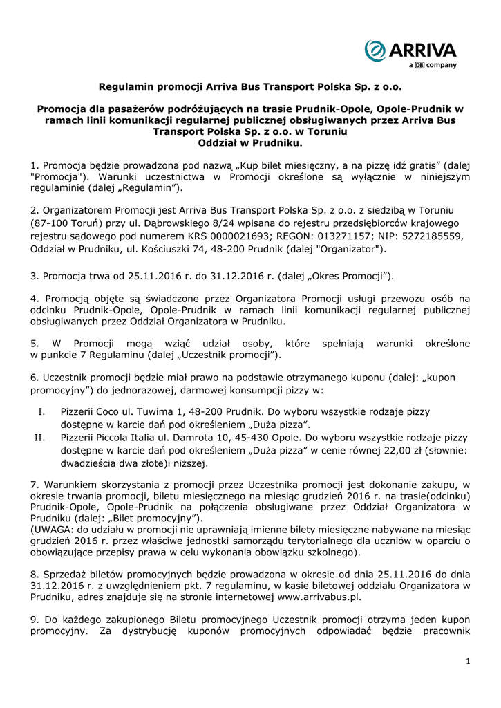 Regulamin promocji Arriva Bus Transport Polska Sp. z o.o. Promocja dla pasażerów podróżujących na trasie Prudnik-Opole, Opole-Prudnik w ramach linii komunikacji regularnej publicznej obsługiwanych przez Arriva Bus Transport Polska Sp. z o.o. w Toruniu Oddział w Prudniku. 1. Promocja będzie prowadzona pod nazwą „Kup bilet miesięczny, a na pizzę idź gratis” (dalej "Promocja"). Warunki uczestnictwa w Promocji określone są wyłącznie w niniejszym regulaminie (dalej „Regulamin”). 2. Organizatorem Promocji jest Arriva Bus Transport Polska Sp. z o.o. z siedzibą w Toruniu (87-100 Toruń) przy ul. Dąbrowskiego 8/24 wpisana do rejestru przedsiębiorców krajowego rejestru sądowego pod numerem KRS 0000021693; REGON: 013271157; NIP: 5272185559, Oddział w Prudniku, ul. Kościuszki 74, 48-200 Prudnik (dalej "Organizator"). 3. Promocja trwa od 25.11.2016 r. do 31.12.2016 r. (dalej „Okres Promocji”). 4. Promocją objęte są świadczone przez Organizatora Promocji usługi przewozu osób na odcinku Prudnik-Opole, Opole-Prudnik w ramach linii komunikacji regularnej publicznej obsługiwanych przez Oddział Organizatora w Prudniku. 5. W Promocji mogą wziąć udział osoby, które w punkcie 7 Regulaminu (dalej „Uczestnik promocji”). spełniają warunki określone 6. Uczestnik promocji będzie miał prawo na podstawie otrzymanego kuponu (dalej: „kupon promocyjny”) do jednorazowej, darmowej konsumpcji pizzy w: I. II. Pizzerii Coco ul. Tuwima 1, 48-200 Prudnik. Do wyboru wszystkie rodzaje pizzy dostępne w karcie dań pod określeniem „Duża pizza”. Pizzerii Piccola Italia ul. Damrota 10, 45-430 Opole. Do wyboru wszystkie rodzaje pizzy dostępne w karcie dań pod określeniem „Duża pizza” w cenie równej 22,00 zł (słownie: dwadzieścia dwa złote)i niższej. 7. Warunkiem skorzystania z promocji przez Uczestnika promocji jest dokonanie zakupu, w okresie trwania promocji, biletu miesięcznego na miesiąc grudzień 2016 r. na trasie(odcinku) Prudnik-Opole, Opole-Prudnik na połączenia obsługiwane przez Oddział Organizatora w Prudniku (dalej: „Bilet promocyjny”). (UWAGA: do udziału w promocji nie uprawniają imienne bilety miesięczne nabywane na miesiąc grudzień 2016 r. przez właściwe jednostki samorządu terytorialnego dla uczniów w oparciu o obowiązujące przepisy prawa w celu wykonania obowiązku szkolnego). 8. Sprzedaż biletów promocyjnych będzie prowadzona w okresie od dnia 25.11.2016 do dnia 31.12.2016 r. z uwzględnieniem pkt. 7 regulaminu, w kasie biletowej oddziału Organizatora w Prudniku, adres znajduje się na stronie internetowej www.arrivabus.pl. 9. Do każdego zakupionego Biletu promocyjnego Uczestnik promocji otrzyma jeden kupon promocyjny. Za dystrybucję kuponów promocyjnych odpowiadać będzie pracownik 1 Organizatora zatrudniony w kasie biletowej. Kupony promocyjne są wydawane tylko łącznie z zakupem biletu promocyjnego. 10. Uczestnik promocji ma prawo do wykorzystania kuponu promocyjnego w terminie od 25.11.2016 do 31.12.2016 r. Po tym czasie kupon promocyjny traci swoją ważność. 11. Promocja, która jest określona w niniejszym Regulaminie łączy się z ulgami wynikającymi z przepisów powszechnie obowiązującego prawa polskiego lub z innymi ulgami handlowymi, stosowanymi przez Organizatora Promocji. 12. Promocja, która jest określona w niniejszym Regulaminie nie łączy się z innymi promocjami stosowanymi przez Organizatora Promocji. 13. Przyjmuje się, że Uczestnik promocji biorący udział w Promocji zapoznał się z treścią niniejszego Regulaminu i wyraża zgodę na udział w Promocji na zasadach w niej określonych. 14. Uczestnikowi promocji nie przysługuje prawo wymiany kuponu promocyjnego na ekwiwalent pieniężny lub domagania się w zamian za prawo do skorzystania z kuponu promocyjnego ekwiwalentu pieniężnego lub rzeczowego. 15. Niniejszy Regulamin Promocji będzie dostępny na tablicy ogłoszeń w kasie biletowej oddziału Organizatora w Prudniku oraz w serwisie internetowym Organizatora Promocji pod adresem http://www.arrivabus.pl. 16. Reklamacje rozpatruje Organizator Promocji. Rozpatrzeniu podlegają wyłącznie reklamacje zgłoszone w formie pisemnej na adres Oddziału Organizatora w Oddziale w Prudniku, ul. Kościuszki 74, 48-200 Prudnik. Pisemna reklamacja powinna zawierać minimum: imię, nazwisko, dokładny adres Uczestnika promocji, opis i wskazanie przyczyn reklamacji. 17. Reklamacje rozpatrywane są w terminie 14 dni od daty ich zgłoszenia. W przypadku, gdy reklamacja wymaga uzupełnienia termin na jej rozpatrzenie zaczyna bieg od daty jej prawidłowego uzupełnienia. 18. Organizator Promocji może odmówić rozpatrzenia reklamacji wniesionej po upływie 30 dni od daty zakupu biletu promocyjnego. 19. Prawa i obowiązki Organizatora Promocji i Uczestników promocji określone są wyłącznie w niniejszym Regulaminie oraz we właściwych przepisach obowiązującego prawa. Wszelkie informacje dostępne w materiałach reklamowych mają jedynie charakter informacyjny. 20. Organizator Promocji zastrzega sobie prawo do zmiany treści Regulaminu, w tym przedłużenia Okresu Promocji. Informacja o zmianie Regulaminu każdorazowo będzie zamieszczana zgodnie z pkt. 15. 21. Organizator zastrzega sobie prawo do zakończenia Promocji w dowolnym czasie przed upływem okresu, o którym mowa w pkt 3, jeżeli wyczerpie się pula posiadanych kuponów, o czym poinformuje zgodnie z pkt 15. Jednakże wszystkie kupony promocyjne wydane przed zakończeniem Promocji pozostaną w takim przypadku ważne do 31.12.2016 r. 2