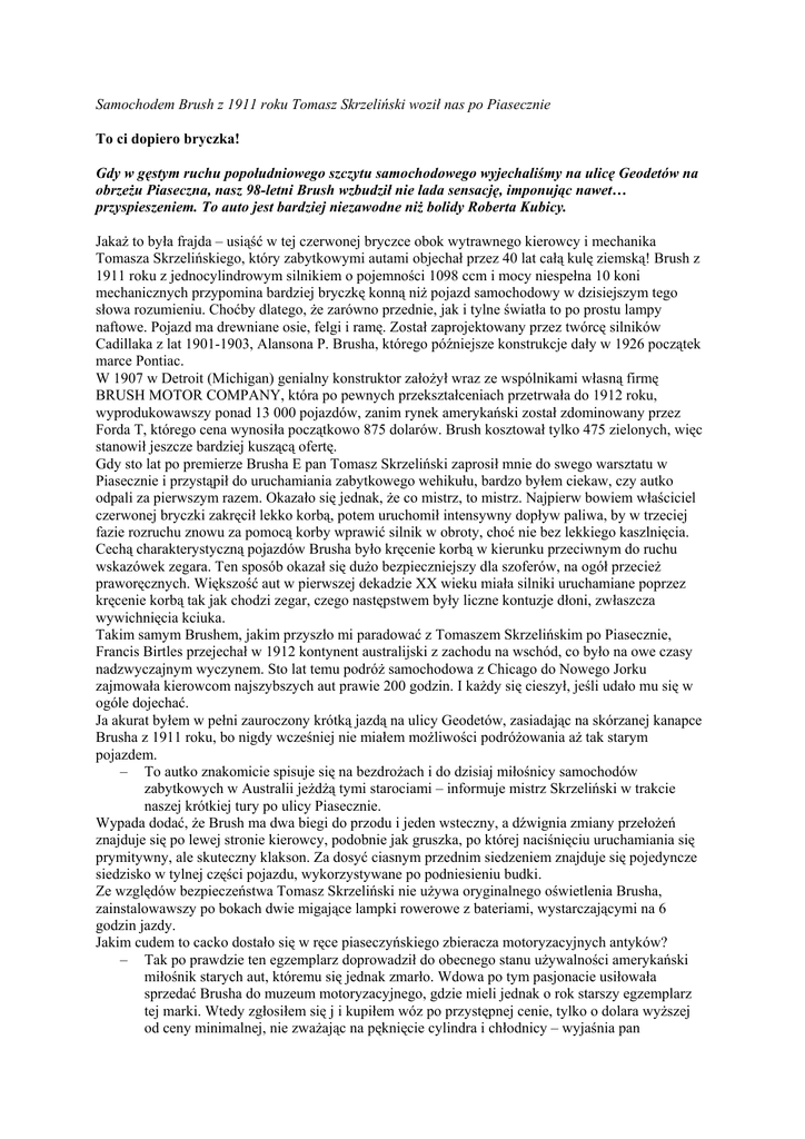 Samochodem Brush z 1911 roku Tomasz Skrzeliński woził nas po Piasecznie To ci dopiero bryczka! Gdy w gęstym ruchu popołudniowego szczytu samochodowego wyjechaliśmy na ulicę Geodetów na obrzeżu Piaseczna, nasz 98-letni Brush wzbudził nie lada sensację, imponując nawet… przyspieszeniem. To auto jest bardziej niezawodne niż bolidy Roberta Kubicy. Jakaż to była frajda – usiąść w tej czerwonej bryczce obok wytrawnego kierowcy i mechanika Tomasza Skrzelińskiego, który zabytkowymi autami objechał przez 40 lat całą kulę ziemską! Brush z 1911 roku z jednocylindrowym silnikiem o pojemności 1098 ccm i mocy niespełna 10 koni mechanicznych przypomina bardziej bryczkę konną niż pojazd samochodowy w dzisiejszym tego słowa rozumieniu. Choćby dlatego, że zarówno przednie, jak i tylne światła to po prostu lampy naftowe. Pojazd ma drewniane osie, felgi i ramę. Został zaprojektowany przez twórcę silników Cadillaka z lat 1901-1903, Alansona P. Brusha, którego późniejsze konstrukcje dały w 1926 początek marce Pontiac. W 1907 w Detroit (Michigan) genialny konstruktor założył wraz ze wspólnikami własną firmę BRUSH MOTOR COMPANY, która po pewnych przekształceniach przetrwała do 1912 roku, wyprodukowawszy ponad 13 000 pojazdów, zanim rynek amerykański został zdominowany przez Forda T, którego cena wynosiła początkowo 875 dolarów. Brush kosztował tylko 475 zielonych, więc stanowił jeszcze bardziej kuszącą ofertę. Gdy sto lat po premierze Brusha E pan Tomasz Skrzeliński zaprosił mnie do swego warsztatu w Piasecznie i przystąpił do uruchamiania zabytkowego wehikułu, bardzo byłem ciekaw, czy autko odpali za pierwszym razem. Okazało się jednak, że co mistrz, to mistrz. Najpierw bowiem właściciel czerwonej bryczki zakręcił lekko korbą, potem uruchomił intensywny dopływ paliwa, by w trzeciej fazie rozruchu znowu za pomocą korby wprawić silnik w obroty, choć nie bez lekkiego kaszlnięcia. Cechą charakterystyczną pojazdów Brusha było kręcenie korbą w kierunku przeciwnym do ruchu wskazówek zegara. Ten sposób okazał się dużo bezpieczniejszy dla szoferów, na ogół przecież praworęcznych. Większość aut w pierwszej dekadzie XX wieku miała silniki uruchamiane poprzez kręcenie korbą tak jak chodzi zegar, czego następstwem były liczne kontuzje dłoni, zwłaszcza wywichnięcia kciuka. Takim samym Brushem, jakim przyszło mi paradować z Tomaszem Skrzelińskim po Piasecznie, Francis Birtles przejechał w 1912 kontynent australijski z zachodu na wschód, co było na owe czasy nadzwyczajnym wyczynem. Sto lat temu podróż samochodowa z Chicago do Nowego Jorku zajmowała kierowcom najszybszych aut prawie 200 godzin. I każdy się cieszył, jeśli udało mu się w ogóle dojechać. Ja akurat byłem w pełni zauroczony krótką jazdą na ulicy Geodetów, zasiadając na skórzanej kanapce Brusha z 1911 roku, bo nigdy wcześniej nie miałem możliwości podróżowania aż tak starym pojazdem. – To autko znakomicie spisuje się na bezdrożach i do dzisiaj miłośnicy samochodów zabytkowych w Australii jeżdżą tymi starociami – informuje mistrz Skrzeliński w trakcie naszej krótkiej tury po ulicy Piasecznie. Wypada dodać, że Brush ma dwa biegi do przodu i jeden wsteczny, a dźwignia zmiany przełożeń znajduje się po lewej stronie kierowcy, podobnie jak gruszka, po której naciśnięciu uruchamiania się prymitywny, ale skuteczny klakson. Za dosyć ciasnym przednim siedzeniem znajduje się pojedyncze siedzisko w tylnej części pojazdu, wykorzystywane po podniesieniu budki. Ze względów bezpieczeństwa Tomasz Skrzeliński nie używa oryginalnego oświetlenia Brusha, zainstalowawszy po bokach dwie migające lampki rowerowe z bateriami, wystarczającymi na 6 godzin jazdy. Jakim cudem to cacko dostało się w ręce piaseczyńskiego zbieracza motoryzacyjnych antyków? – Tak po prawdzie ten egzemplarz doprowadził do obecnego stanu używalności amerykański miłośnik starych aut, któremu się jednak zmarło. Wdowa po tym pasjonacie usiłowała sprzedać Brusha do muzeum motoryzacyjnego, gdzie mieli jednak o rok starszy egzemplarz tej marki. Wtedy zgłosiłem się j i kupiłem wóz po przystępnej cenie, tylko o dolara wyższej od ceny minimalnej, nie zważając na pęknięcie cylindra i chłodnicy – wyjaśnia pan Skrzeliński, w którego czarodziejskich rękach każde auto, nawet z bardzo poważną awarią silnika, natychmiast ożywa. Do legendy już przeszło, że piaseczyńskiemu czarodziejowi udało się kiedyś uruchomić pewną luksusową brykę po wyjęciu z silnika wrzuconej tam przez kogoś złośliwie... prezerwatywy. Tomasz Skrzeliński, który w latach sześćdziesiątych zaczynał karierę motoryzacyjną od ujeżdżania motocykla WFM, przetarł polskim kolekcjonerom drogę do największego na świecie muzeum automobilowego w Miluzie, gdzie samych egzemplarzy marki Bugatti jest aż sto pięćdziesiąt. Jedno z najmilszych wspomnień Skrzelińskiego to rajdowanie Buickiem z 1914 roku po Szampanii. Każdy kierowca samochodu-antyku dostaje w takim rajdzie tyle szampana, ile sam waży i ma prawo to wypić w trakcie jazdy po drogach o – co tu ukrywać – małym ruchu. Tradycyjne prawo przewiduje bardzo łagodny wymiar kary, jeśli prowadzący w szampańskim nastroju kierowca spowoduje wypadek. Tylko przy tej okazji można bez większego ryzyka zrealizować znane hasło Tadeusza Drozdy: „Piłeś? Nie jedź! Nie piłeś? Wypij!”. Rajdy w Szampanii odbywają się co dwa lata i pan Skrzeliński wybiera się na najbliższy w 2010 roku. Na razie jednak organizuje rajd starych samochodów do Walewic. Pojedzie 20 aut, w tym 10 RollsRoyce-ów (jeden z 1927 roku). Dodatkową atrakcją rajdu ma być podróż pociągiem z lokomotywą parową. Jednym z ciekawszych projektów Skrzelińskiego jest urządzenie muzeum starych samochodów obok pięknego pałacu w Łańcucie, gdzie mają już kolekcję zabytkowych pojaz