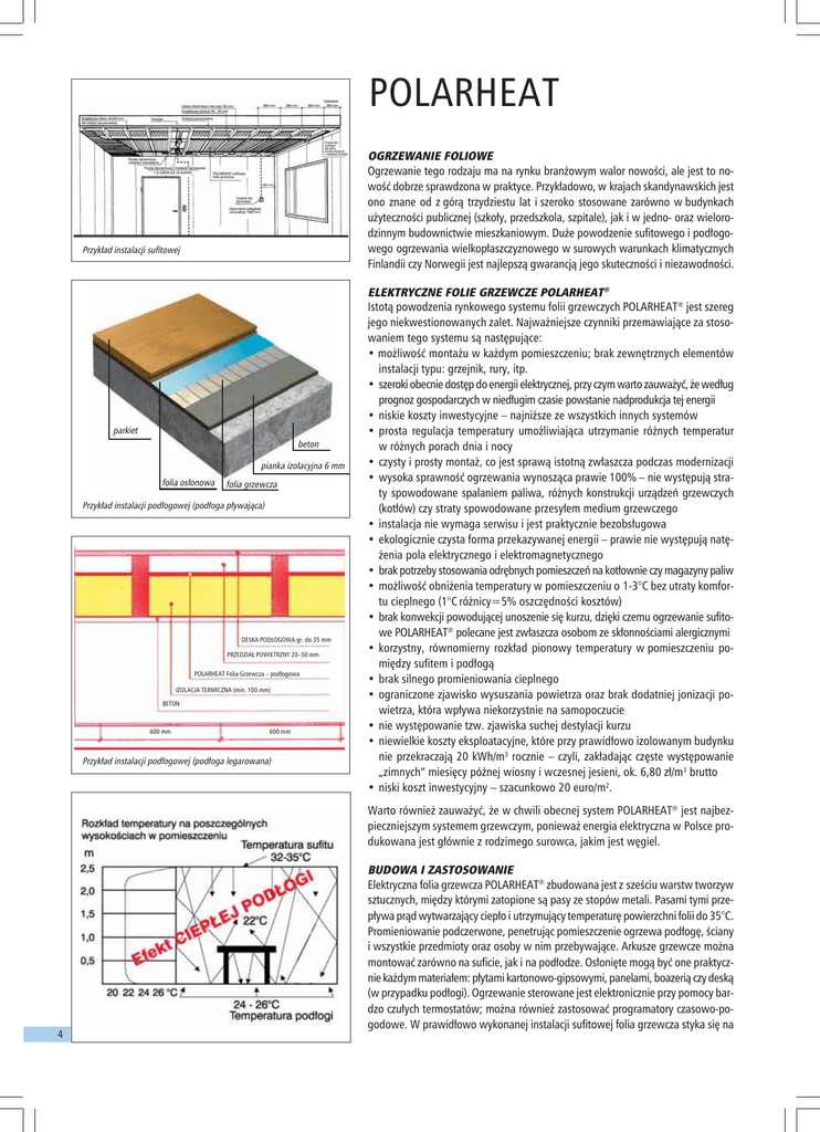 POLARHEAT OGRZEWANIE FOLIOWE Ogrzewanie tego rodzaju ma na rynku branżowym walor nowości, ale jest to nowość dobrze sprawdzona w praktyce. Przykładowo, w krajach skandynawskich jest ono znane od z górą trzydziestu lat i szeroko stosowane zarówno w budynkach użyteczności publicznej (szkoły, przedszkola, szpitale), jak i w jedno- oraz wielorodzinnym budownictwie mieszkaniowym. Duże powodzenie sufitowego i podłogowego ogrzewania wielkopłaszczyznowego w surowych warunkach klimatycznych Finlandii czy Norwegii jest najlepszą gwarancją jego skuteczności i niezawodności. Przykład instalacji sufitowej parkiet beton pianka izolacyjna 6 mm folia osłonowa folia grzewcza Przykład instalacji podłogowej (podłoga pływająca) DESKA PODŁOGOWA gr. do 35 mm PRZEDZIAŁ POWIETRZNY 20–50 mm POLARHEAT Folia Grzewcza – podłogowa IZOLACJA TERMICZNA (min. 100 mm) BETON 600 mm 600 mm Przykład instalacji podłogowej (podłoga legarowana) ELEKTRYCZNE FOLIE GRZEWCZE POLARHEAT® Istotą powodzenia rynkowego systemu folii grzewczych POLARHEAT® jest szereg jego niekwestionowanych zalet. Najważniejsze czynniki przemawiające za stosowaniem tego systemu są następujące: • możliwość montażu w każdym pomieszczeniu; brak zewnętrznych elementów instalacji typu: grzejnik, rury, itp. • szeroki obecnie dostęp do energii elektrycznej, przy czym warto zauważyć, że według prognoz gospodarczych w niedługim czasie powstanie nadprodukcja tej energii • niskie koszty inwestycyjne – najniższe ze wszystkich innych systemów • prosta regulacja temperatury umożliwiająca utrzymanie różnych temperatur w różnych porach dnia i nocy • czysty i prosty montaż, co jest sprawą istotną zwłaszcza podczas modernizacji • wysoka sprawność ogrzewania wynosząca prawie 100% – nie występują straty spowodowane spalaniem paliwa, różnych konstrukcji urządzeń grzewczych (kotłów) czy straty spowodowane przesyłem medium grzewczego • instalacja nie wymaga serwisu i jest praktycznie bezobsługowa • ekologicznie czysta forma przekazywanej energii – prawie nie występują natężenia pola elektrycznego i elektromagnetycznego • brak potrzeby stosowania odrębnych pomieszczeń na kotłownie czy magazyny paliw • możliwość obniżenia temperatury w pomieszczeniu o 1-3°C bez utraty komfortu cieplnego (1°C różnicy=5% oszczędności kosztów) • brak konwekcji powodującej unoszenie się kurzu, dzięki czemu ogrzewanie sufitowe POLARHEAT® polecane jest zwłaszcza osobom ze skłonnościami alergicznymi • korzystny, równomierny rozkład pionowy temperatury w pomieszczeniu pomiędzy sufitem i podłogą • brak silnego promieniowania cieplnego • ograniczone zjawisko wysuszania powietrza oraz brak dodatniej jonizacji powietrza, która wpływa niekorzystnie na samopoczucie • nie występowanie tzw. zjawiska suchej destylacji kurzu • niewielkie koszty eksploatacyjne, które przy prawidłowo izolowanym budynku nie przekraczają 20 kWh/m3 rocznie – czyli, zakładając częste występowanie „zimnych” miesięcy późnej wiosny i wczesnej jesieni, ok. 6,80 zł/m3 brutto • niski koszt inwestycyjny – szacunkowo 20 euro/m2. Warto również zauważyć, że w chwili obecnej system POLARHEAT® jest najbezpieczniejszym systemem grzewczym, ponieważ energia elektryczna w Polsce produkowana jest głównie z rodzimego surowca, jakim jest węgiel. 4 BUDOWA I ZASTOSOWANIE Elektryczna folia grzewcza POLARHEAT® zbudowana jest z sześciu warstw tworzyw sztucznych, między którymi zatopione są pasy ze stopów metali. Pasami tymi przepływa prąd wytwarzający ciepło i utrzymujący temperaturę powierzchni folii do 35°C. Promieniowanie podczerwone, penetrując pomieszczenie ogrzewa podłogę, ściany i wszystkie przedmioty oraz osoby w nim przebywające. Arkusze grzewcze można montować zarówno na suficie, jak i na podłodze. Osłonięte mogą być one praktycznie każdym materiałem: płytami kartonowo-gipsowymi, panelami, boazerią czy deską (w przypadku podłogi). Ogrzewanie sterowane jest elektronicznie przy pomocy bardzo czułych termostatów; można również zastosować programatory czasowo-pogodowe. W prawidłowo wykonanej instalacji sufitowej folia grzewcza styka się na całej powierzchni z elementami podtrzymującymi od dołu (np. płytą kartonowo-gipsową) i z izolacją termiczną od góry, dzięki czemu uzyskuje się optymalną efektywność grzewczą. Z kolei w przypadku ogrzewania podłogowego (podłoga legarowana) folia nie może się stykać bezpośrednio z podłogą – konieczne jest zastosowanie szczeliny powietrznej. Na bazie folii grzewczych do ogrzewania sufitowego i podłogowego produkowane są także sufitowe kasetony grzejno-oświetleniowe o mocy 200 W, służące do dogrzewania małych pomieszczeń, jak też kasety do ogrzewania ławkowego, szczególnie w kościołach i innych wielkokubaturowych obiektach użyteczności publicznej. NOWOŚCI • Szklany grzejnik dekoracyjny ViValdi® Grzejnik ten składa się z tafli hartowanego szkła o grubości do 1 cm. Jako element grzejny zastosowano w nim elektryczną folię grzewczą POLARHEAT®. Grzejnik ViValdi® składa się z trzech elementów – płyt o wymiarach 75 x 30 cm i mocy rzędu 125W każda. Dostępny w każdym kolorze. • Grzejniki marmurowe i parapety podgrzewane „Prestige” • Ścianka działowa „Parawan” • Lustra podgrzewane 24V, zapobiegające osiadaniu pary wodnej • Kabel grzewczy „E-Heat” – jest produkowany zgodnie z najnowszymi dyrektywami obowiązującymi w UE (73/23/EEC i 93/68/EEC). UWAGA! – Kabel grzewczy „E-Heat” nie zawiera dodatków ołowiu. DYSTRYBUTORZY – OLMAR: 91-218 Łódź, ul. Traktorowa 202; tel. 042/ 655-95-00, fax 042/ 650-54-04; www.olmar.pl – POLCONTACT Krzysztof Śniegula: 90-404 Łódź, ul. Próchnika 16; tel./fax 042/ 630-54-60 lub 601-354-407; www.polcontact.pl – ELKO: 75-411 Koszalin, ul. Partyzantów 14; tel./fax 094/ 347-43-00 