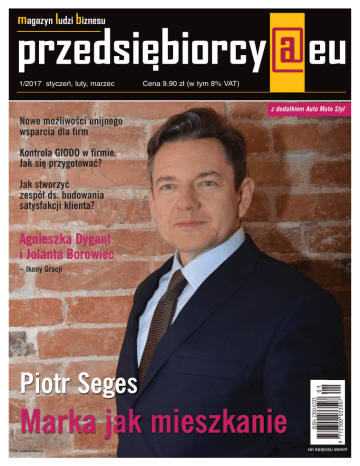 magazyn ludzi biznesu 1/2017 styczeń, luty, marzec Cena 9.90 zł (w tym 8% VAT) z dodatkiem Auto Moto Styl Nowe możliwości unijnego wsparcia dla firm Kontrola GIODO w firmie. Jak się przygotować? Jak stworzyć zespół ds. budowania satysfakcji klienta? Agnieszka Dygant i Jolanta Borowiec – Ikony Gracji Piotr Seges Marka jak mieszkanie Fot. Andrzej Nowicki NR INDEKSU 40540X Drodzy Czytelnicy, weszliśmy w nowy, 2017 rok. Zamknęliśmy stary, 2016. Jaki był dla nas, jak go przeżyliśmy? Czy nasze życie wyglądało tak, jak chcieliśmy? Co z zeszłorocznych planów udało nam się zrealizować? Co przed nami? Jedną z niewiadomych w 2017 roku jest prezydentura czterdziestego piątego prezydenta USA, Donalda Trumpa, a to nie ze względu na jego chaotyczną osobowość, ale na charakteryzujących się skrajnym konserwatyzmem doradców pomagających mu w rządzeniu. Cały świat interesuje, jaką politykę zagraniczną zamierza prowadzić nowy prezydent. Z perspektywy Polski najważniejsze jest, na jakich zasadach chciałby dokonać zbliżenia z Rosją. Niepewność polityczną pogłębia również Wielka Brytania, która w pierwszym kwartale 2017 roku powinna formalnie poinformować o zamiarze opuszczenia Unii Europejskiej, a tym samym aktywować procedurę wychodzenia. Niewiadomą są także wybory, które przypadają na 2017 rok w kilku państwach Unii Europejskiej. Niektóre z nich będą kluczowe dla przyszłości Wspólnoty. I tak 15 marca członków parlamentu wybierać będą Holendrzy, a w kwietniu i maju odbędą się wybory prezydenckie we Francji. Jesienią zaś będą miały miejsce wybory do niemieckiego i do czeskiego parlamentu. Wiosną jeszcze prawdopodobnie odbędą się przedterminowe wybory we Włoszech. A co na naszym podwórku? Sejm ustanowił rok 2017 rokiem Marszałka Józefa Piłsudskiego, Tadeusza Kościuszki, Adama Chmielowskiego i błogosławionego Honorata Koźmińskiego. Na całym świecie zaś będziemy w sposób szczególny wspominać Jane Austen, autorkę takich tytułów, jak: „Rozważna i romantyczna”, „Duma i uprzedzenie” czy „Perswazje”. 18 lipca 2017 roku miną bowiem dwa wieki od śmierci pisarki. Na co mogą liczyć przedsiębiorcy? Od 1 stycznia 2017 roku weszło w życie szereg przepisów ułatwiających przedsiębiorcom prowadzenie firm, jak np.: podwyższenie progów korzystania z uproszczonej księgowości czy podniesienie limitów uprawniających do rozliczania się w formie ryczałtu ewidencjonowanego. Przedsiębiorcy mogą również korzystać z nowych, przyjaznych dla biznesu rozwiązań dotyczących m.in. interpretacji prawa, zasad prowadzenia kontroli w firmach, realizacji inwestycji budowlanych czy obowiązków związanych z ochroną środowiska. Z bieżącego wydania magazynu „przedsiębiorcy@eu” można się też m.in. dowiedzieć, jak przygotować swoją firmę do kontroli Głównego Inspektora Danych Osobowych oraz jak rozwój pracowników może przyczynić się do sukcesu firmy. Nasi czytelnicy poznają też bardzo ciekawych ludzi biznesu, którzy prezentują ścieżki, jakie prowadziły ich lub wciąż prowadzą do spełnienia aspiracji. Dla odrobiny wytchnienia zapraszam do lektury części poświęconej kulturze i stylowi życia. Na fanów motoryzacji jak zwykle czeka dodatek Auto Moto Styl, w którym znajdą wiele nowości i ciekawostek ze świata „czterech kółek”. Zapraszam do lektury! Barbara Jończyk wydawca i redaktor naczelna magazynu „przedsiębiorcy@eu” Redakcja: ul. Kaliska 17 lok. 42, 02-316 Warszawa tel. 501 243 876 e-mail: [email protected], www.przedsiebiorcy.eu Redaktor naczelny: Barbara Jończyk Redaktor prowdząca: Aneta Sienicka Zespół redakcyjny: Izabela Włodarczyk, Izabella Jarska, Ewa Maj Krzysztof Jończyk, Rafał Korzeniewski, Dora Rosłońska, Marta Buzalska, Natalia Kamińska, Jowita Łuczak, Olgierd Stańczak. Redakcja językowa i korekta: Natalia Kamińska DTP i druk: MaxMedia, ul. Estrady 67, 01-932 Warszawa, tel. 22 832 42 51 [email protected] www.maxmedia.org.pl Reklama: Aneta Sienicka [email protected], tel. 603 333 711 Wydawca: Europejskie Forum Przedsiębiorczości Sp. z o.o. ul. Kaliska 17 lok. 42, 02-316 Warszawa NIP: 701-020-11-00 Redakcja nie ponosi odpowiedzialności za treść reklam oraz materiałów promocyjnych. Publikowane zdjęcia i materiały są własnością redakcji oraz prezentowanych firm i instytucji. Przedruk tylko za zgodą wydawcy. Redakcja zastrzega sobie prawo do skrótów. Numer oddano do druku 19.01.2017 r. przedsiebiorcy@eu 3 W numerze: 6 30 38 TWARZE BIZNESU - Piotr Seges – „Marka jak mieszkanie” - Maciej Chlebowski – Ambasador Przedsiębiorczości „Bank uniwersalny” - Michał Górski – Ambasador Przedsiębiorczości „Ciągłe dążenie do celu” - Irina Małek – Ambasador Przedsiębiorczości „Szyte na miarę” - Alan Waldemar Wierzycki – Ambasador Przedsiębiorczości „Mądrość przychodzi wraz z doświadczeniem” - Jerzy Rożek – Ambasador Przedsiębiorczości „Profesjonalizm w zabytkowych wnętrzach” - Krystian Herncisz – Ambasador Przedsiębiorczości „Trzeba robić w życiu to, co się lubi” - Marian Okręglicki „Unikatowość jest obecnie bardzo ceniona” - Isabella Anders „Wenecki Bal Maskowy czas zacząć!” - Jan Rybka „Łączymy doświadczenie z młodością” - Monika Gostołek „Jakość i niezawodność” BIZNES I GOSPODARKA - Nowe możliwości unijnego wsparcia dla firm - „Załóż firmę przez telefon” i inne nowe proaktywne usługi Ministerstwa Rozwoju dla przedsiębiorców - Ekspansja i rozwój możliwości biznesowych na rynkach afrykańskich - Laury Innowacyjności 2016 rozdane! - Poznaliśmy „Liderów Przedsiębiorczości roku 2016” - Tysiące spotkań biznesowych na Wolves Summit - II edycja Asia Trade BLIŻEJ ŚWIATA - Naddniestrze – dlaczego powstało, jak funkcjonuje i jakie są perspektywy na przyszłość tego nieuznawanego państwa? - Czy Baszar al-As