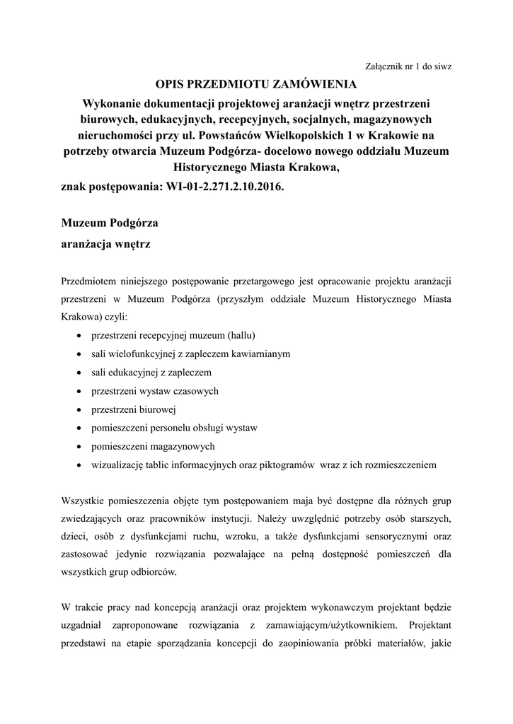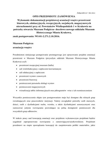 Załącznik nr 1 do siwz OPIS PRZEDMIOTU ZAMÓWIENIA Wykonanie dokumentacji projektowej aranżacji wnętrz przestrzeni biurowych, edukacyjnych, recepcyjnych, socjalnych, magazynowych nieruchomości przy ul. Powstańców Wielkopolskich 1 w Krakowie na potrzeby otwarcia Muzeum Podgórza- docelowo nowego oddziału Muzeum Historycznego Miasta Krakowa, znak postępowania: WI-01-2.271.2.10.2016. Muzeum Podgórza aranżacja wnętrz Przedmiotem niniejszego postępowanie przetargowego jest opracowanie projektu aranżacji przestrzeni w Muzeum Podgórza (przyszłym oddziale Muzeum Historycznego Miasta Krakowa) czyli: przestrzeni recepcyjnej muzeum (hallu) sali wielofunkcyjnej z zapleczem kawiarnianym sali edukacyjnej z zapleczem przestrzeni wystaw czasowych przestrzeni biurowej pomieszczeni personelu obsługi wystaw pomieszczeni magazynowych wizualizację tablic informacyjnych oraz piktogramów wraz z ich rozmieszczeniem Wszystkie pomieszczenia objęte tym postępowaniem maja być dostępne dla różnych grup zwiedzających oraz pracowników instytucji. Należy uwzględnić potrzeby osób starszych, dzieci, osób z dysfunkcjami ruchu, wzroku, a także dysfunkcjami sensorycznymi oraz zastosować jedynie rozwiązania pozwalające na pełną dostępność pomieszczeń dla wszystkich grup odbiorców. W trakcie pracy nad koncepcją aranżacji oraz projektem wykonawczym projektant będzie uzgadniał zaproponowane rozwiązania z zamawiającym/użytkownikiem. Projektant przedstawi na etapie sporządzania koncepcji do zaopiniowania próbki materiałów, jakie planuje zastosować w projekcie. Po ich zaakceptowaniu przez zamawiającego/użytkownika nie są dopuszczalne jakiekolwiek zmiany w tym względzie. W projekcie oczekujemy zastosowania indywidualnych rozwiązań dostosowanych do specyfiki rozplanowania poszczególnych (np. układ ścian, skosy stropów, łuki sklepień). Stosowanie rozwiązań systemowych lub typowych dopuszczalne jest jedynie w wyjątkowych przypadkach, po uzgodnieniu tego z zamawiającym/użytkownikiem, na etapie opracowywania koncepcji. Projekt nie obejmuje specyfikacji sprzętu multimedialnego i AGD, a jedynie umiejscowienie ich w topograficznym rozplanowaniu pomieszczeń wraz z określeniem maksymalnych rozmiarów poszczególnych urządzeń. W projekcie należy uwzględnić wytyczne konserwatorskie dla wszystkich projektowanych pomieszczeń oraz zachować w pełni istniejące posadzki, wykończenie i kolorystykę ścian, stolarkę, wyposażenie sanitariatów i pomieszczeń socjalnych. Wszelkie zmiany w układzie przestrzennym każdego z pomieszczeń mogą być dokonywane jedynie elementami, które są łatwo demontowalne i nie naruszają istniejącej struktury konstrukcyjnej budynku. W zakresie oświetlenia należy dostosować się do istniejącej infrastruktury i opierać się na technologii LED. Dodatkowo należy przewidzieć możliwość łatwego serwisowania urządzeń typu zasilacze oświetleniowe, taśmy LED itd. Przestrzeń recepcyjna muzeum Przestrzeń recepcyjna objęta niniejszym postępowaniem obejmuje pomieszczenia oznaczone na rzucie parteru oficyny jako 0/1 hall, 0/2 pom. ochrony, 0/3 wc damski, 0/4 wc dla niepełnosprawnych, 0/5 wc męski, 0/6 szatnia, 0/7 hall szatniowy. Projekt obejmuje także wizualizację zewnętrznej ściany z wejściem do muzeum od strony ul. Limanowskiego oraz wejściem od strony dziedzińca do łącznika i budynku oficyny. hall (pomieszczenie nr 0/1, oficyna, parter) Funkcja pomieszczenia: Hol będzie stanowił wejście do muzeum, będzie to przestrzeń reprezentacyjna, wizytówka muzeum, dlatego zależy nam na wysokiej estetyce miejsca przy zachowaniu jej funkcjonalności. W holu znajdzie się kasa oddziału połączona ze sklepem muzealnym. Ważne jest zaprojektowanie mebli, które umożliwią eksponowanie wydawnictw i towarów sprzedawanych w sklepie przy jednoczesnym ich zabezpieczeniu przed kradzieżą. Hol będzie pierwszym pomieszczeniem, do którego wejdą goście, niekiedy będą to duże grupy (ok. 40 osób), którym trzeba zapewnić swobodę poruszania. Proponujemy w przestrzeni holu umieścić stojak w lekkimi, składanymi krzesłami, które można zabrać ze sobą na wystawę i rozstawić w dowolnym miejscu. Zależy nam na kompleksowym projekcie przestrzeni holu z uwzględnieniem poszczególnych stref funkcjonalnych (sklep z kasą, portiernia, szatnia, „poczekalnia” dla zwiedzających. Dopuszczamy możliwość wykorzystania wielkoformatowych widoków Podgórza lub innych form artystycznego przekazu stanowiących plastyczne dopełnienie aranżacji wnętrza. składane krzesła w Historiska Museet w Sztokholmie fot. K. Bury W holu musi się znaleźć miejsce na tablicę informacyjną z panem budynku i wskazaniem kierunków do poszczególnych przestrzeni (szatnia, wystawa, sala edukacyjna itd.) Minimalne wyposażenie: lada dla kasjera z zamykanymi szufladami (należy uwzględnić miejsce na 2 zestawy kasowe składające się między innymi z: komputer stacjonarny (w rozmiarze USSF), monitor minimum 22” + podstawka, drukarkę fiskalną (Posnet Thermal HD z odłączanym wyświetlaczem), jedną drukarkę biletów (TSC TTP-246M plus), szufladę na pieniądze, czytnik kodów kreskowych, jedną drukarkę laserową do faktur oraz zamykaną szafkę (na kasetki na pieniądze i jeden sejf) 2 x krzesło dla kasjera (komputerowe, na kółkach) szafki dla kasjera półki do prezentacji wydawnictw otwarte i zamknięte (przeszklone) półki lub witryny do prezentacji gadżetów i pamiątek muzealnych stojak z przenośnymi, składanymi krzesłami do zabrania ze sobą na wystawę siedziska dla zwiedzających stojak na ulotki, broszury itp. system oświetlenia pomieszczenie ochrony (pomieszczenie nr 0/2, oficyna, parter) Funkcja pomieszczenia: pomieszczenie będzie miejscem pracy ochroniarza/portiera Minimalne wyposażenie: biurko z miejscem na komputer stacjonarny i monitor krzesło komputerowe szafki niskie oraz wysokie (np. na ubranie) wiesza