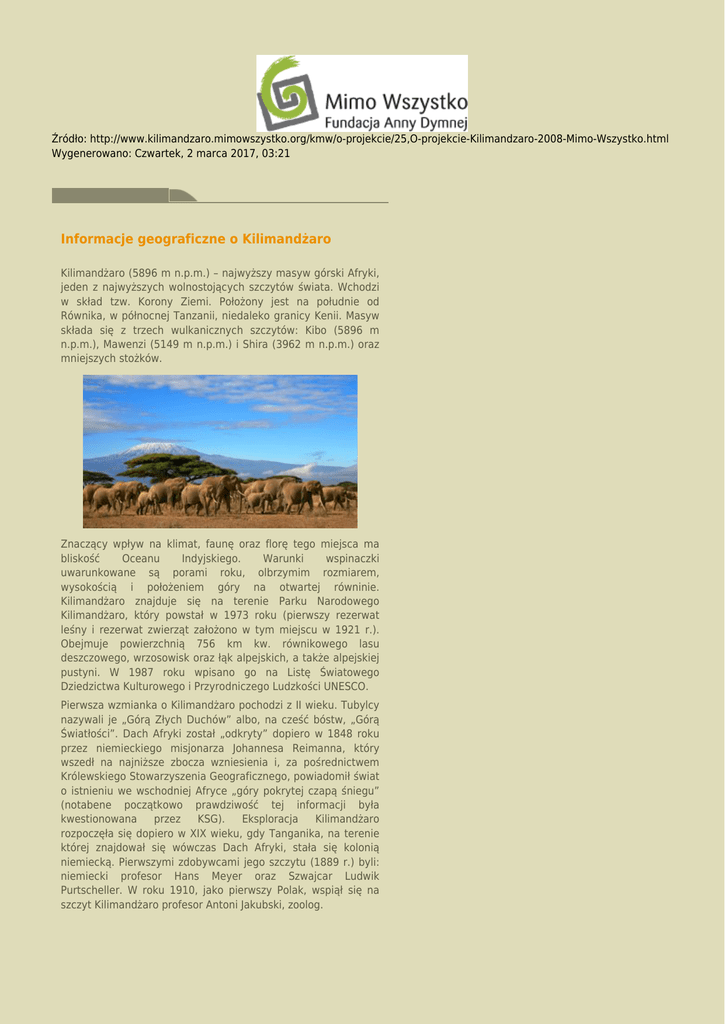 Źródło: http://www.kilimandzaro.mimowszystko.org/kmw/o-projekcie/25,O-projekcie-Kilimandzaro-2008-Mimo-Wszystko.html Wygenerowano: Czwartek, 2 marca 2017, 03:21 Informacje geograficzne o Kilimandżaro Kilimandżaro (5896 m n.p.m.) – najwyższy masyw górski Afryki, jeden z najwyższych wolnostojących szczytów świata. Wchodzi w skład tzw. Korony Ziemi. Położony jest na południe od Równika, w północnej Tanzanii, niedaleko granicy Kenii. Masyw składa się z trzech wulkanicznych szczytów: Kibo (5896 m n.p.m.), Mawenzi (5149 m n.p.m.) i Shira (3962 m n.p.m.) oraz mniejszych stożków. Znaczący wpływ na klimat, faunę oraz florę tego miejsca ma bliskość Oceanu Indyjskiego. Warunki wspinaczki uwarunkowane są porami roku, olbrzymim rozmiarem, wysokością i położeniem góry na otwartej równinie. Kilimandżaro znajduje się na terenie Parku Narodowego Kilimandżaro, który powstał w 1973 roku (pierwszy rezerwat leśny i rezerwat zwierząt założono w tym miejscu w 1921 r.). Obejmuje powierzchnią 756 km kw. równikowego lasu deszczowego, wrzosowisk oraz łąk alpejskich, a także alpejskiej pustyni. W 1987 roku wpisano go na Listę Światowego Dziedzictwa Kulturowego i Przyrodniczego Ludzkości UNESCO. Pierwsza wzmianka o Kilimandżaro pochodzi z II wieku. Tubylcy nazywali je „Górą Złych Duchów” albo, na cześć bóstw, „Górą Światłości”. Dach Afryki został „odkryty” dopiero w 1848 roku przez niemieckiego misjonarza Johannesa Reimanna, który wszedł na najniższe zbocza wzniesienia i, za pośrednictwem Królewskiego Stowarzyszenia Geograficznego, powiadomił świat o istnieniu we wschodniej Afryce „góry pokrytej czapą śniegu” (notabene początkowo prawdziwość tej informacji była kwestionowana przez KSG). Eksploracja Kilimandżaro rozpoczęła się dopiero w XIX wieku, gdy Tanganika, na terenie której znajdował się wówczas Dach Afryki, stała się kolonią niemiecką. Pierwszymi zdobywcami jego szczytu (1889 r.) byli: niemiecki profesor Hans Meyer oraz Szwajcar Ludwik Purtscheller. W roku 1910, jako pierwszy Polak, wspiął się na szczyt Kilimandżaro profesor Antoni Jakubski, zoolog. O projekcie Kilimandżaro 2008 – Mimo Wszystko 27 września wyruszymy do Kenii. Następnego dnia po wylądowaniu w Nairobi udamy się samochodami do Arusha stolicy afrykańskiego safarii. To miasto leżące w samym środku Arusha National Park, opanowane przez górujący nad nim krater wulkanu Meru, to początek naszej ekscytującej wyprawy. Kolejnym jej etapem będzie wejście do National Kilimanjaro Park przez Marangu- Gate. Podczas przygotowań doskonale poznaliśmy zasady zdobywania szczytu. Najważniejsza z nich to zachowanie stałego, wolnego tempa marszu. Musimy być przygotowani na nieprzewidywalne reakcje organizmu związane z wysokością i klimatem. Brawura znacznie obniża szanse na wygraną. Trasa trekingu poprowadzi nas zieloną równikowa dżunglą, która stopniowo zacznie się zmieniać. Las przejdzie w bezkresne pola porośnięte karłowatymi krzewami i wysokimi trawami. Następny obóz to Horombo Hut na wysokości 3720 m npm. Od tego punktu zaczniemy się zbliżać do ostatniego miejsca gdzie naturalnie występuje woda, przełęczy zwanej siodłem dzielącej stożek Kibo od Manwezi. 7 dnia rozpocznie się atak na szczyt. Ze względu na upały Kilimandżaro zdobywa się nocą. Po kilku godzinach bardzo męczącej trasy o świcie dotrzemy do brzegu krateru, tzw. Gilmans Point, aby stamtąd osiągnąć najwyższy punkt wierzchołka Dachu Afryki – 5895 m. Po zejściu ze szczytu i powrocie do Arusha rozpocznie się się drugi etap naszej przygody – Safari. Najpierw po Lake Manyara a potem słynnym Ngorongoro na terenie którego znajduje się największy na świecie kalder wulkaniczny. Jego dno jest płaskie pokryte częściowo piaskami oraz pokrywami solnymi. W okresie deszczowym do wypełnionych wodą jezior przylatują tysiące flamingów. W zbiornikach wodnych można spotkać hipopotamy. Czeka nas wspaniała przygoda. Trzymajcie kciuki za powodzenie wyprawy. Uczestnicy