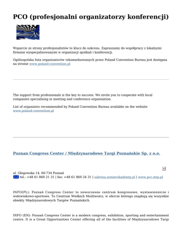 PCO (profesjonalni organizatorzy konferencji) Wsparcie ze strony profesjonalistów to klucz do sukcesu. Zapraszamy do współpracy z lokalnymi firmami wyspecjalizowanymi w organizacji spotkań i konferencji. Ogólnopolska lista organizatorów rekomednowanych przez Poland Convention Bureau jest dostępna na stronie www.poland-convention.pl The support from professionals is the key to success. We invite you to cooperate with local companies specialising in meeting and conference organisation. List of organizers recommended by Poland Convention Bureau available on the website www.poland-convention.pl Poznan Congress Center / Międzynarodowe Targi Poznańskie Sp. z o.o. ul. Głogowska 14, 60-734 Poznań tel.: +48 61 869 21 31 | fax: +48 61 869 24 31 | [email protected] | www.pcc.mtp.pl INFO(PL): Poznań Congress Center to nowoczesne centrum kongresowe, wystawiennicze i widowiskowo-sportowe. To Centrum Wielkich Możliwości, w ofercie którego znajdują się wszystkie obiekty Międzynarodowych Targów Poznańskich. INFO (EN): Poznań Congress Center is a modern congress, exhibition, sporting and entertainment centre. It is a Great Opportunities Center offering all of the facilities of Międzynarodowe Targi Poznańskie [Poznan International Fair]. Agora ul. Żurawia 10/12, 60-860 Poznań tel.: +48 61 842 70 94 | fax: +48 61 842 74 65 | www.agora-konferencje.pl | [email protected] INFO(PL): Firma AGORA od 1993r. zajmuje się profesjonalną organizacją Konferencji i Zjazdów Medycznych na terenie całego kraju.Mamy przyjemność współpracować z Profesorami, Kierownikami poszczególnych Klinik AM, Towarzystwami Medycznymi oraz firmami farmaceutycznymi i sprzętowymi. INFO (ENG): Since 1993 AGORA is professional organization of medical conferences and congresses. We have pleasure to work with professors, managers, pharmaceutical companies, hardware and many others. Dwór Polski ul. Krzywińska 7, 60-114 Poznań tel.: +48 61 832 55 00 | fax: +48 61 639 33 82 | www.dworpolski.com.pl | [email protected] INFO(PL): 13 lat w branży MICE, ponad 3000 zrealizowanych wydarzeń. Zapewniamy kompleksową obsługę wydarzenia - na każdym etapie jego realizacji. Gwarantujemy niezapomniane wspomnienia dla klientów. Kreujemy niepowtarzalne pomysły, tworzymy niekonwencjonalne scenariusze dostosowane do indywidualnych potrzeb klienta, specyfiki jego działalności i marki. INFO(EN): 13 years in the MICE industry, more than 3,000 events. Full events service - at every stage of its implementation. We guarantee unforgettable memories for customers, unique ideas, unconventional scenarios tailored to individual customer needs, the specific nature of its business and brand. Flow events ul. Brzask 10/213, 60-369 Poznań tel.: +48 61 609 172 662 | www.flowevents.pl | [email protected] INFO(PL): Oferujemy szeroki wybór imprez firmowych. Szukasz pomysłu na nietypową imprezę, chcesz zmotywować swoich pracowników, a może powiedzieć „dziękuję” swoim najlepszym klientom? Przygotujemy ofertę specjalnie dla Ciebie. Powiedz nam, co pragniesz osiągnąć dzięki imprezie, konferencji, a my zaproponujemy najlepsze rozwiązanie. Znajdziemy idealne miejsce dla Twojego firmowego spotkania, dostosowane do liczby gości i jego charakteru. Zadbamy, by zaproszone osoby czuły się komfortowo i długo wspominały to wydarzenie. Mamy szeroką wiedzę na temat obiektów konferencyjnych i hoteli zarówno w Polsce jak i zagranicą. Pracujemy tylko ze sprawdzonymi partnerami, którzy od wielu lat na rynku potwierdzają swoją jakość i profesjonalizm. INFO(EN): We offer a wide range of company events. Are you looking for a unique party idea? Perhaps you wish to motivate your employees, or maybe you are searching for a way to say “thank you” to your most valued clients? We will prepare for you an offer custom tailored to your needs. Tell us what you wish to accomplish with the event or conference, and we will recommend you the optimal solutions to do just that. We will find the perfect place for your company meeting, appropriate for the number of guests and the meeting’s character. Our knowledge of available conference sites and hotels, both in Poland and abroad, is extensive, and we only work with proven partners with experience in the market that are known for their professionalism and quality of service. Gradatim ul. Owocowa 10, 62-080 Tarnowo Podgórne tel./fax: +48 61 814 65 14 | kom: +48 669 37 86 64 | www.gradatim-sympozja.pl | [email protected] INFO(PL): Gradatim powstała w 2009 roku w odpowiedzi na rosnące zapotrzebowanie rynku na profesjonalne usługi z zakresu organizacji konferencji, zjazdów, spotkań, sympozjów a także szkoleń i spotkań integracyjnych. INFO(EN): Gradatim was formed in 2009 in response to growing market demand for professional services involving the organization of conferences, congresses, meetings and symposia, as well as training and integration events. Grupa TSO Sp. z o.o. ul. Piątkowska 112a, 60-649 Poznań tel.: +48 656 99 99 | fax: +48 61 656 99 95 | www.tso.pl | [email protected] INFO(PL): Poprzez swoje ogromne doświadczenie oraz szerokie portfolio klientów posiadamy umiejętność budowania relacji biznesowych i dostarczania najskuteczniejszych rozwiązań w zakresie projektów wsparcia sprzedaży i programów lojalnościowych. Opierając się na narzędziach motywujących z sektora MICE oraz innych nagrodach wspierających tworzymy unikatowe na rynku projekty zwiększające sprzedaż, jednocześnie działając na optymalizację kosztów. Horizon Travel Biuro Podróży Sp. z o.o. ul. Sianowska 37/2, 60-431 Poznań tel.: +48 663 86 88 | fax: +48 61 849 98 20 | www.horizon-travel.pl | [email protected] INFO(PL): Zbliża się 20-lecie Waszej firmy i już nie możesz spać po nocach zastanawiając jak ugryźć temat? Doroczna konferencja podsumowująca miniony rok za pasem a hotel jeszcze nie wybrany? Nie przejmuj się! Chętnie zajmiemy się kompleksową organizacją tych uro