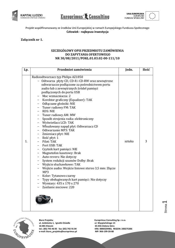 Projekt współfinansowany ze środków Unii Europejskiej w ramach Europejskiego Funduszu Społecznego Człowiek - najlepsza inwestycja Załącznik nr 1. SZCZEGÓŁOWY OPIS PRZEDMIOTU ZAMÓWIENIA DO ZAPYTANIA OFERTOWEGO NR 30/08/2011/POKL.01.03.02-00-111/10 Radioodtwarzacz typ Philips AZ1850 - Odtwarza płyty CD, CD-R i CD-RW oraz zewnętrzne odtwarzacze podłączone za pośrednictwem portu audio lub z zewnętrznych źródeł pamięci podłączonych do portu USB - Moc wzmacniacza: 2 - Korektor graficzny (Equalizer): TAK - Odłączane głośniki: NIE - Tuner radiowy FM: TAK - RDS: NIE - Tuner radiowy AM: MW - Sposób strojenia radia: elektroniczny - Wyświetlacz LCD: TAK - Wbudowany napęd płyt: Odtwarzacz CD - Odtwarzanie MP3: TAK - Zmieniacz płyt: NIE - Ilość płyt: 1 - Pilot: TAK - Port USB: TAK - Czytnik kart pamięci: NIE - Magnetofon kasetowy: Brak - Auto-revers: Nie dotyczy - System redukcji szumów Dolby: Brak - Wyjście słuchawkowe: TAK - Wejście audio: Wejście liniowe stereo 3,5 mm: Złącze MP3 - Kolor: Tytanowo czarny - Typy obsługiwanych kart pamięci: Nie dotyczy - Wymiary: 435 x 170 x 270 - Zasilanie sieciowe: 220 Jedn. Ilość sztuka 3 1 1. Przedmiot zamówienia Strona Lp. Biuro Projektu ul. Jeździecka 1, Ignatki-Osiedle 16-001 Kleosin tel.: (85) 745 46 85 fax: (85) 742 91 04 e-mail: [email protected] Europrimus Consulting Sp. z o.o. ul. Wyspiańskiego 13 65-036 Zielona Góra KRS: 0000329983, REGON: 200275386 NIP: 966-199-28-88 Projekt współfinansowany ze środków Unii Europejskiej w ramach Europejskiego Funduszu Społecznego Człowiek - najlepsza inwestycja UWAGA: 1. Wszystkie ww. urządzenia powinny być dopuszczone do stosowania w placówkach oświatowych oraz posiadać odpowiednie atesty, certyfikaty, świadectwa jakości, i spełniać wszelkie wymogi norm określonych obowiązującym prawem. Strona 2 2. Zamawiający dopuszcza możliwość przedstawienia w ofercie asortymentu równoważnego (innego niż podany „z nazwy” przez Zamawiającego w Szczegółowym opisie przedmiotu zamówienia oraz w Formularzu ofertowym) pod warunkiem, iż oferowany asortyment będzie o takich samych lub lepszych parametrach technicznych, jakościowych, funkcjonalnych, użytkowych. Biuro Projektu ul. Jeździecka 1, Ignatki-Osiedle 16-001 Kleosin tel.: (85) 745 46 85 fax: (85) 742 91 04 e-mail: [email protected] Europrimus Consulting Sp. z o.o. ul. Wyspiańskiego 13 65-036 Zielona Góra KRS: 0000329983, REGON: 200275386 NIP: 966-199-28-88