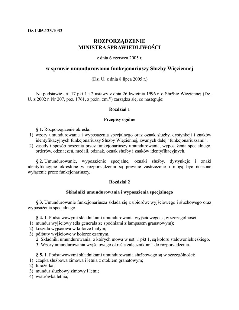 Dz.U.05.123.1033 ROZPORZĄDZENIE MINISTRA SPRAWIEDLIWOŚCI z dnia 6 czerwca 2005 r. w sprawie umundurowania funkcjonariuszy Służby Więziennej (Dz. U. z dnia 8 lipca 2005 r.) Na podstawie art. 17 pkt 1 i 2 ustawy z dnia 26 kwietnia 1996 r. o Służbie Więziennej (Dz. U. z 2002 r. Nr 207, poz. 1761, z późn. zm.1)) zarządza się, co następuje: Rozdział 1 Przepisy ogólne § 1. Rozporządzenie określa: 1) wzory umundurowania i wyposażenia specjalnego oraz oznak służby, dystynkcji i znaków identyfikacyjnych funkcjonariuszy Służby Więziennej, zwanych dalej "funkcjonariuszami"; 2) zasady i sposób noszenia przez funkcjonariuszy umundurowania, wyposażenia specjalnego, orderów, odznaczeń, medali, odznak, oznak służby i znaków identyfikacyjnych. § 2. Umundurowanie, wyposażenie specjalne, oznaki służby, dystynkcje i znaki identyfikacyjne określone w rozporządzeniu są prawnie zastrzeżone i mogą być noszone wyłącznie przez funkcjonariuszy. Rozdział 2 Składniki umundurowania i wyposażenia specjalnego § 3. Umundurowanie funkcjonariusza składa się z ubiorów: wyjściowego i służbowego oraz wyposażenia specjalnego. § 4. 1. Podstawowymi składnikami umundurowania wyjściowego są w szczególności: 1) mundur wyjściowy (dla generała ze spodniami z lampasem granatowym); 2) koszula wyjściowa w kolorze białym; 3) półbuty wyjściowe w kolorze czarnym. 2. Składniki umundurowania, o których mowa w ust. 1 pkt 1, są koloru stalowoniebieskiego. 3. Wzory umundurowania wyjściowego określa załącznik nr 1 do rozporządzenia. 1) 2) 3) 4) § 5. 1. Podstawowymi składnikami umundurowania służbowego są w szczególności: czapka służbowa zimowa i letnia z otokiem granatowym; furażerka; mundur służbowy zimowy i letni; wiatrówka letnia; 5) 6) 7) 8) 9) 10) 11) 12) spodnie letnie (dla generała z lampasem granatowym); kurtka całoroczna; płaszcz jesienno-zimowy i płaszcz letni w kolorze granatowym; rękawiczki w kolorze czarnym; koszula wyjściowa w kolorze białym; koszula służbowa i koszula letnia; pas i obuwie w kolorze czarnym; dystynkcje i oznaki służby. 2. Składniki umundurowania, o których mowa w ust. 1 pkt 1-6 i 10, są koloru stalowoniebieskiego. 3. Wzory umundurowania służbowego określa załącznik nr 2 do rozporządzenia. § 6. 1. Wyposażenie specjalne otrzymują funkcjonariusze na zasadach określonych w rozporządzeniu Ministra Sprawiedliwości z dnia 17 września 2002 r. w sprawie norm i zasad przydzielania umundurowania i wyposażenia specjalnego funkcjonariuszom Służby Więziennej (Dz. U. Nr 163, poz. 1347). 2. Podstawowe składniki wyposażenia specjalnego określają tabele nr 4 i 5 załącznika do rozporządzenia, o którym mowa w ust. 1. 3. Składniki wyposażenia specjalnego, z wyłączeniem kominiarki i trzewików polowych, są koloru stalowoniebieskiego z nadrukiem koloru czarnego. 4. Rodzaje stanowisk i zadania, na których dopuszcza się występowanie w wyposażeniu specjalnym, określa kierownik jednostki organizacyjnej Służby Więziennej. 5. Wzory składników wyposażenia specjalnego funkcjonariuszy określa załącznik nr 3 do rozporządzenia. § 7. 1. Do umundurowania wyjściowego funkcjonariusze noszą sznury galowe: podoficera Służby Więziennej, chorążego Służby Więziennej, oficera Służby Więziennej, generała Służby Więziennej. 2. Sznury galowe, o których mowa w ust. 1, są koloru srebrnoszarego. 3. Wzory sznurów galowych określa załącznik nr 4 do rozporządzenia. Rozdział 3 Oznaki służby, dystynkcje oraz znaki identyfikacyjne § 8. 1. Oznakami Służby Więziennej są: 1) oznaka w kształcie koła, wykonana z metalu w kolorze srebrnym, na której w obramowaniu liści dębowych jest skrzyżowany miecz i pochodnia; oznakę w kształcie koła funkcjonariusze noszą na kołnierzu munduru i kołnierzu płaszcza jesienno-zimowego; 2) oznaka w kształcie tarczy, wykonana z płótna w kolorze granatowym, na której w obramowaniu liści dębowych jest skrzyżowany miecz i pochodnia w kolorze białym; oznakę w kształcie tarczy funkcjonariusze noszą na prawym rękawie koszuli letniej i służbowej, wiatrówki, swetra, kurtki całorocznej, kurtki wchodzącej w skład munduru polowego i kurtki polowej; 3) oznaka w kształcie półkolistym, wykonana z płótna w kolorze granatowym, z napisem "SŁUŻBA WIĘZIENNA" w kolorze białym; oznakę w kształcie półkolistym funkcjonariusze 2 noszą na prawym rękawie munduru i płaszcza jesienno-zimowego, w odległości 4 cm poniżej wszycia rękawa; 4) oznaka w kształcie orła, wykonana haftem na kołnierzu kurtki mundurowej i płaszcza jesienno-zimowego funkcjonariusza w stopniu generała. 2. Wzory oznak służby określa załącznik nr 5 do rozporządzenia. § 9. 1. W skład umundurowania funkcjonariuszy wchodzą dystynkcje noszone na ubiorach umundurowania i nakryciach głowy. 2. Wzory dystynkcji, o których mowa w ust. 1, określa załącznik nr 6 do rozporządzenia. § 10. 1. Funkcjonariusze noszą dystynkcje koloru srebrnego na czapce służbowej i furażerce oraz na naramiennikach płaszcza, kurtki całorocznej, munduru, wiatrówki, swetra, koszuli letniej i służbowej, oraz kurtki, ocieplacza i munduru polowego. 2. Dystynkcje noszone na płaszczu jesienno-zimowym, mundurze, wiatrówce, koszuli letniej i służbowej wykonane są na naramiennikach. Dystynkcje noszone na płaszczu letnim, kurtce całorocznej i swetrze są wykonane na wsuwkach zakładanych na naramienniki. 3. Starsi szeregowi i podoficerowie Służby Więziennej na czapce służbowej i furażerce noszą dystynkcje haftowane bajorkiem. Na naramiennikach składników umundurowania dystynkcje są wykonane z taśmy dystynkcyjnej białej z oblamowaniem granatowym. 4. Chorążowie Służby Więziennej na czapce służbowej i furażerce noszą dystynkcje haftowane bajorkiem, a na naramiennikach składników umundurowania haftowane bajorkiem oraz wykonane z taśmy dystynkcyjnej koloru srebrnego