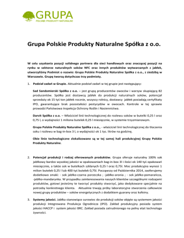 Grupa Polskie Produkty Naturalne Spółka z o.o. W celu uzyskania pozycji solidnego partnera dla sieci handlowych oraz znaczącej pozycji na rynku w sektorze naturalnych soków NFC oraz innych produktów wytwarzanych z jabłek, utworzyliśmy Podmiot o nazwie: Grupa Polskie Produkty Naturalne Spółka z o.o., z siedzibą w Warszawie. Grupę tworzą dotychczas trzy podmioty. 1. Podział zadań w Grupie. Aktualnie podział zadań w tej grupie jest następujący: Sad Sandomierski Spółka z o.o. – jest grupą producentów owoców i warzyw skupiającą 82 producentów. Spółka jest dostawcą jabłek do produkcji naturalnych soków, potencjał sprzedaży ok 15 tyś ton jabłek rocznie, wszyscy rolnicy, dostawcy jabłek posiadają certyfikaty IPO, gwarantujące brak pozostałości pestycydów w owocach. Kontrole w tej sprawie prowadzi Państwowa Inspekcja Ochrony Roślin i Nasiennictwa. Darvit Spółka z o.o. – Właściciel linii technologicznej do rozlewu soków w butelki 0,25 l oraz 0,75 l, o wydajności 1 miliona butelek 0,25 l miesięcznie, w systemie trzyzmianowym. Grupa Polskie Produkty Naturalne Spółka z o.o., - właściciel linii technologicznej do tłoczenia soku i rozlewu w bag-in-box 3 l, o wydajności ok 1 tys. litrów na godzinę. Obie linie technologiczne zlokalizowane są w tej samej hali produkcyjnej Grupy Polskie Produkty Naturalne. 2. Potencjał produkcji i rodzaj oferowanych produktów. Grupa oferuje naturalny 100% sok jabłkowy bardzo wysokiej jakości w opakowaniach bag-in-box 3l i ilości ok 140 tyś opakowań miesięcznie, a także sok w butelkach szklanych 0,25 l oraz 0,75l. Moc produkcyjna wynosi 1 milion butelek 0,25 l lub 400 tyś butelek 0,75l. Począwszy od Października 2014, zaoferujemy dodatkowo smaki: - sok jabłko-czarna porzeczka ; -jabłko-aronia ; - sok jabłko-pomarańcza, -jabłko-mandarynka. W przypadku zainteresowania naszych klientów szczególnymi rodzajami produktów, gotowi jesteśmy te tworzyć produkty stworzyć, jako dedykowane specjalnie na potrzeby konkretnego klienta. Aktualnie trwają próby laboratoryjne stworzenia całkowicie nowej grupy produktów – soków energetycznych z dodatkiem guarany oraz kofeiny. 3. Systemy jakości. Jabłka stanowiące surowiec do produkcji soków objęte są systemem jakości produkcji Integrowana Produkcja Ogrodnicza (IPO). Zakład produkcyjny posiada system jakości HACCP i system jakości BRC. Zakład posiada zatrudnionego na pełny etat technologa żywności. 4. Rozwijanie grupy. Aktualnie Grupa prowadzi dodatkowo rozmowy z dwoma kolejnymi podmiotami w celu dwukrotnego zwiększenia mocy produkcyjnych oferowanych produktów. 5. Wspólna organizacja sprzedaży. Grupa reprezentuje wszystkie podmioty w zakresie wspólnej organizacji sprzedaży. 6. Wspólna marka handlowa. Aktualnie Grupa sprzedaje pod marka handlową „Sad Sandomierski”. Grupa opracowała wspólne logo Polskie Sady Energia z Natury – który został zgłoszony do rejestracji w Urzędzie Patentowym i po rejestracji którego, wszystkie oferowane przez grupę produkty będą występowały w obrocie pod jedną marką. Do czasu zarejestrowania marki handlowej przez Urząd Patentowy, produkty będą oferowane pod marką „Sad Sandomierski”. Po zarejestrowaniu, grafika produktów będzie identyczna jak Sad Sandomierski jednak zostanie zmieniona nazwa produktu. 7. Wspólne działania marketingowe. Grupa aktualnie opracowuje reklamę telewizyjną – spot 10 sekund, którego emisje w ilości 116 szt., planuje uruchomić , w Polsat News, w godzinach 17-22. Kampania reklamowa będzie powtarzana. Spółka przygotowuje kampanię reklamową poprzez media społecznościwe – Facebook. W tym celu opracowywany jest program partnerski, umożliwiający użytkownikom facebooka polecanie sobie nawzajem produktów połączony z jednoczesnym wynagradzaniem tych osób, których rekomendacja skutkuje zakupem produktu. System generuje unikalny kod , który wrzuca do koszyka osoby która za pośrednictwem Internetu poleciła produkt innej osobie, a osoba ta dokonała zakupu przez Internet. Wartość kodu to 2 zł. Po zebraniu odpowiedniej ilości kodów spółka będzie wysyłała produkt osobie polecającej. Planujemy także marketing szeptany za pośrednictwem tematycznych forów internetowych. 8. Wizualizacja naszych produktów: Sok 3l bag-in-box Sok butelka szklana 0,75 l Sok Butelka szklana 0,25 l 250 mll 250 mll 3l bag-in-box 750 mll 9. Co znacząco odróżnia nas od naszej konkurencji? - Nasz produkt naturalny sok jabłkowy - jest laureatem konkursu „Nasze Dobre Świętokrzyskie 2012”, „Doceń Polskie 2013 ” , laureatem I miejsca w konkursie AgroLiga 2013 w Województwie Świętokrzyskim oraz laureatem II miejsca w konkursie AgroLiga 2013 na szczeblu krajowym. - Nasze produkty są całkowicie naturalne, bez żadnych dodatków , konserwantów, cukru , wody, witaminy C, itd, - Posiadamy wprowadzony zaawansowany system jakości BRC, gwarantujący najwyższy standard bezpieczeństwa żywności, - Zatrudniamy na pełnym etacie wykwalifikowanego technologa żywności czuwającego nad prawidłowym procesem produkcyjnym, - Wszystkie jabłka zakupione do produkcji soków pochodzą z gospodarstw posiadających certyfikat IPO, poświadczający, że nie zostały przekroczone dopuszczalne stężenia środków ochrony roślin. 4. Dodatkowo, rozlewamy w butelki oraz opakowania 3 l bag in-box, całkowicie naturalne soki pomarańczowe. Soki są wytłoczone w Hiszpanii , zamrożone i transportowane do Polski w big-bagach 1000l. Soki te na miejscu rozmnażamy, rozlewamy i pasteryzujemy.