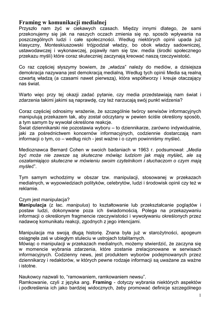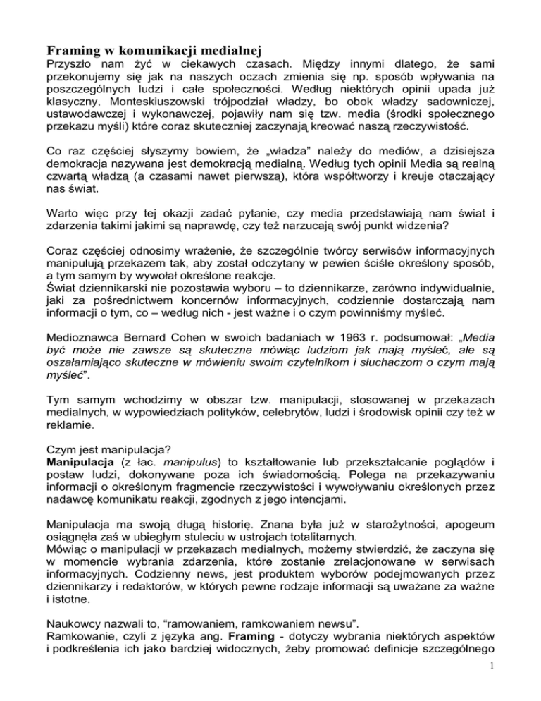 Framing w komunikacji medialnej Przyszło nam żyć w ciekawych czasach. Między innymi dlatego, że sami przekonujemy się jak na naszych oczach zmienia się np. sposób wpływania na poszczególnych ludzi i całe społeczności. Według niektórych opinii upada już klasyczny, Monteskiuszowski trójpodział władzy, bo obok władzy sadowniczej, ustawodawczej i wykonawczej, pojawiły nam się tzw. media (środki społecznego przekazu myśli) które coraz skuteczniej zaczynają kreować naszą rzeczywistość. Co raz częściej słyszymy bowiem, że „władza” należy do mediów, a dzisiejsza demokracja nazywana jest demokracją medialną. Według tych opinii Media są realną czwartą władzą (a czasami nawet pierwszą), która współtworzy i kreuje otaczający nas świat. Warto więc przy tej okazji zadać pytanie, czy media przedstawiają nam świat i zdarzenia takimi jakimi są naprawdę, czy też narzucają swój punkt widzenia? Coraz częściej odnosimy wrażenie, że szczególnie twórcy serwisów informacyjnych manipulują przekazem tak, aby został odczytany w pewien ściśle określony sposób, a tym samym by wywołał określone reakcje. Świat dziennikarski nie pozostawia wyboru – to dziennikarze, zarówno indywidualnie, jaki za pośrednictwem koncernów informacyjnych, codziennie dostarczają nam informacji o tym, co – według nich - jest ważne i o czym powinniśmy myśleć. Medioznawca Bernard Cohen w swoich badaniach w 1963 r. podsumował: „Media być może nie zawsze są skuteczne mówiąc ludziom jak mają myśleć, ale są oszałamiająco skuteczne w mówieniu swoim czytelnikom i słuchaczom o czym mają myśleć”. Tym samym wchodzimy w obszar tzw. manipulacji, stosowanej w przekazach medialnych, w wypowiedziach polityków, celebrytów, ludzi i środowisk opinii czy też w reklamie. Czym jest manipulacja? Manipulacja (z łac. manipulus) to kształtowanie lub przekształcanie poglądów i postaw ludzi, dokonywane poza ich świadomością. Polega na przekazywaniu informacji o określonym fragmencie rzeczywistości i wywoływaniu określonych przez nadawcę komunikatu reakcji, zgodnych z jego intencjami. Manipulacja ma swoją długą historię. Znana była już w starożytności, apogeum osiągnęła zaś w ubiegłym stuleciu w ustrojach totalitarnych. Mówiąc o manipulacji w przekazach medialnych, możemy stwierdzić, że zaczyna się w momencie wybrania zdarzenia, które zostanie zrelacjonowane w serwisach informacyjnych. Codzienny news, jest produktem wyborów podejmowanych przez dziennikarzy i redaktorów, w których pewne rodzaje informacji są uważane za ważne i istotne. Naukowcy nazwali to, “ramowaniem, ramkowaniem newsu”. Ramkowanie, czyli z języka ang. Framing - dotyczy wybrania niektórych aspektów i podkreślenia ich jako bardziej widocznych, żeby promować definicje szczególnego 1 wizerunku. Słowa używane przez dziennikarzy opisują tematy ustalając, w jaki sposób czytelnicy je postrzegają. Inaczej mówiąc, framing jest codziennym wyborem dokonywanym przez nadawców, właścicieli mediów za pośrednictwem swoich dziennikarzy, polegającym na prostej decyzji, które ze zdarzeń jest ważne i godne relacji a które nie, framing przesądza o medialnym życiu danego zdarzenia. Zdarzenie nie zrelacjonowane w serwisach informacyjnych po prostu nie istnieje. * Framing – proces wybierania pewnych aspektów rzeczywistości i nadania im znaczącej widoczności w celu propagowania poglądu, idei, oceny * Framing – proces kontroli mediów nad zawartością przekazów. Określa sposób prezentacji zawartości, wyłaniając pożądane i pomijając pozostałe interpretacje * Dostarczanie wskazówek jak interpretować i oceniać rzeczywistość Jednak framing to jeszcze coś więcej. To nie tylko poinformowanie o pewnych faktach, ale również pokazanie ich z określonej perspektywy. Tak jak w malarstwie, rama ogranicza nasze pole widzenia, ogniskuje pewną perspektywę i zakreśla obszar, z którym malarz chce nas zapoznać, tak samo jest z informacjami. Dziennikarze nie tylko pokazują to, co chcą i co w ich przekonaniu wydaje się ważne, ale również określają perspektywę i sposób postrzegania danego wydarzenia. To swego rodzaju programowanie myślenia odbiorców, zwalniające ich z indywidualnej oceny danego wydarzenia, a jednocześnie kształtujące ich opinię na ten temat. (Częsty slogan – Tak jest, bo w telewizji powiedzieli…) Media frame (ramy) - dominująca idea, wokół której zorganizowany jest kontekst wiadomości, która wyznacza zawartość wiadomości i sugeruje wybór podstawowej kwestii, Media frame – instrumenty: * Selekcja * Podkreślanie * Wyłączanie * Rozwinięcie Na czym polega manipulacja, framing w mediach? Są różne sposoby „ramkowania” „ramowania” czy inaczej mówiąc programowania myślenia odbiorców. takie jak np. - „placement” - umiejscowienie, wskazuje ważność wiadomości przez umieszczenie na pierwszej stronie czy w środku gazety, - wybrane cytaty - wybrani komentatorzy - montaż zdjęć, - opis pod zdjęciem, - kierujące tytuły, - kolejność prezentacji, - sposób wykorzystywania faktów i interpretacji, dając znaczenie tym faktom, które będą wywierać wpływ na kształtowanie kierunku myślenia. 2 * Istnieje bowiem bardzo realne i wyczuwalne już niebezpieczeństwo, że wraz z olbrzymim postępem w opanowaniu przez człowieka świata rzeczy, człowiek gubi istotne wątki swego wśród nich panowania, na różne sposoby podporządkowuje im swoje człowieczeństwo, sam staje się przedmiotem wielorakiej — czasem bezpośrednio nieuchwytnej — manipulacji poprzez całą organizację życia zbiorowego, poprzez system produkcji, poprzez nacisk środków przekazu społecznego. Jan Paweł II Redemptor Hominis nr 16 Media już dawno zrezygnowały ze swojej zasadniczej, informacyjnej roli. Niegdyś rolą prasy było przekazywanie podstawowych informacji tzw. „5W” czyli
