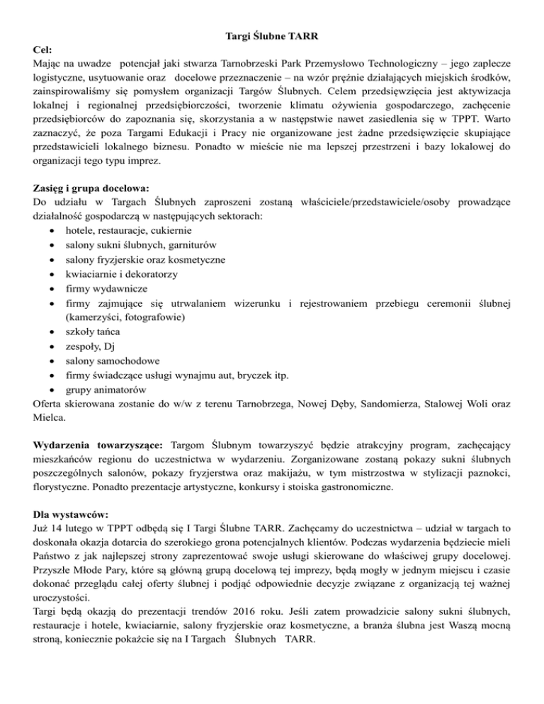 Targi Ślubne TARR Cel: Mając na uwadze potencjał jaki stwarza Tarnobrzeski Park Przemysłowo Technologiczny – jego zaplecze logistyczne, usytuowanie oraz docelowe przeznaczenie – na wzór prężnie działających miejskich środków, zainspirowaliśmy się pomysłem organizacji Targów Ślubnych. Celem przedsięwzięcia jest aktywizacja lokalnej i regionalnej przedsiębiorczości, tworzenie klimatu ożywienia gospodarczego, zachęcenie przedsiębiorców do zapoznania się, skorzystania a w następstwie nawet zasiedlenia się w TPPT. Warto zaznaczyć, że poza Targami Edukacji i Pracy nie organizowane jest żadne przedsięwzięcie skupiające przedstawicieli lokalnego biznesu. Ponadto w mieście nie ma lepszej przestrzeni i bazy lokalowej do organizacji tego typu imprez. Zasięg i grupa docelowa: Do udziału w Targach Ślubnych zaproszeni zostaną właściciele/przedstawiciele/osoby prowadzące działalność gospodarczą w następujących sektorach: hotele, restauracje, cukiernie salony sukni ślubnych, garniturów salony fryzjerskie oraz kosmetyczne kwiaciarnie i dekoratorzy firmy wydawnicze firmy zajmujące się utrwalaniem wizerunku i rejestrowaniem przebiegu ceremonii ślubnej (kamerzyści, fotografowie) szkoły tańca zespoły, Dj salony samochodowe firmy świadczące usługi wynajmu aut, bryczek itp. grupy animatorów Oferta skierowana zostanie do w/w z terenu Tarnobrzega, Nowej Dęby, Sandomierza, Stalowej Woli oraz Mielca. Wydarzenia towarzyszące: Targom Ślubnym towarzyszyć będzie atrakcyjny program, zachęcający mieszkańców regionu do uczestnictwa w wydarzeniu. Zorganizowane zostaną pokazy sukni ślubnych poszczególnych salonów, pokazy fryzjerstwa oraz makijażu, w tym mistrzostwa w stylizacji paznokci, florystyczne. Ponadto prezentacje artystyczne, konkursy i stoiska gastronomiczne. Dla wystawców: Już 14 lutego w TPPT odbędą się I Targi Ślubne TARR. Zachęcamy do uczestnictwa – udział w targach to doskonała okazja dotarcia do szerokiego grona potencjalnych klientów. Podczas wydarzenia będziecie mieli Państwo z jak najlepszej strony zaprezentować swoje usługi skierowane do właściwej grupy docelowej. Przyszłe Młode Pary, które są główną grupą docelową tej imprezy, będą mogły w jednym miejscu i czasie dokonać przeglądu całej oferty ślubnej i podjąć odpowiednie decyzje związane z organizacją tej ważnej uroczystości. Targi będą okazją do prezentacji trendów 2016 roku. Jeśli zatem prowadzicie salony sukni ślubnych, restauracje i hotele, kwiaciarnie, salony fryzjerskie oraz kosmetyczne, a branża ślubna jest Waszą mocną stroną, koniecznie pokażcie się na I Targach Ślubnych TARR. Oferta: – oferta mody ślubnej – liczne prezentacje: dekoracji, zaproszeń, fotografii, samochodów ślubnych, – doradztwo w zakresie makijażu i fryzury dla przyszłej Panny Młodej, – prezentacje biżuterii i bukietów ślubnych, – oferta restauracji, hoteli organizujących przyjęcia weselne, – cenne nagrody dla zwiedzających oraz wiele innych atrakcji. Zapewniamy modelki, hostessy za dodatkową opłatą. Imprezy towarzyszące Targom: do uzgodnienia Kampania medialna: Ze względu na to, że organizatorem Targów jest miasto Tarnobrzeg z TARR oraz TPPT, impreza będzie objęta kampanią medialną na terenie Tarnobrzega, Sandomierza, Stalowej Woli, Mielca oraz Nowej Dęby. Zorganizowane zostaną konferencje prasowe, a TŚ objęte zostaną patronatami medialnymi. Pojawią się również plakaty i ogłoszenia. Loga firmy, które zgłoszą swój udział, będą prezentowane na Targach podczas projekcji. Nie będzie lepszej okazji do zetknięcia się z bezpośrednimi odbiorcami – pierwsze wrażanie i kompetencja są najważniejsze! Komisarze Targów, koordynatorzy.