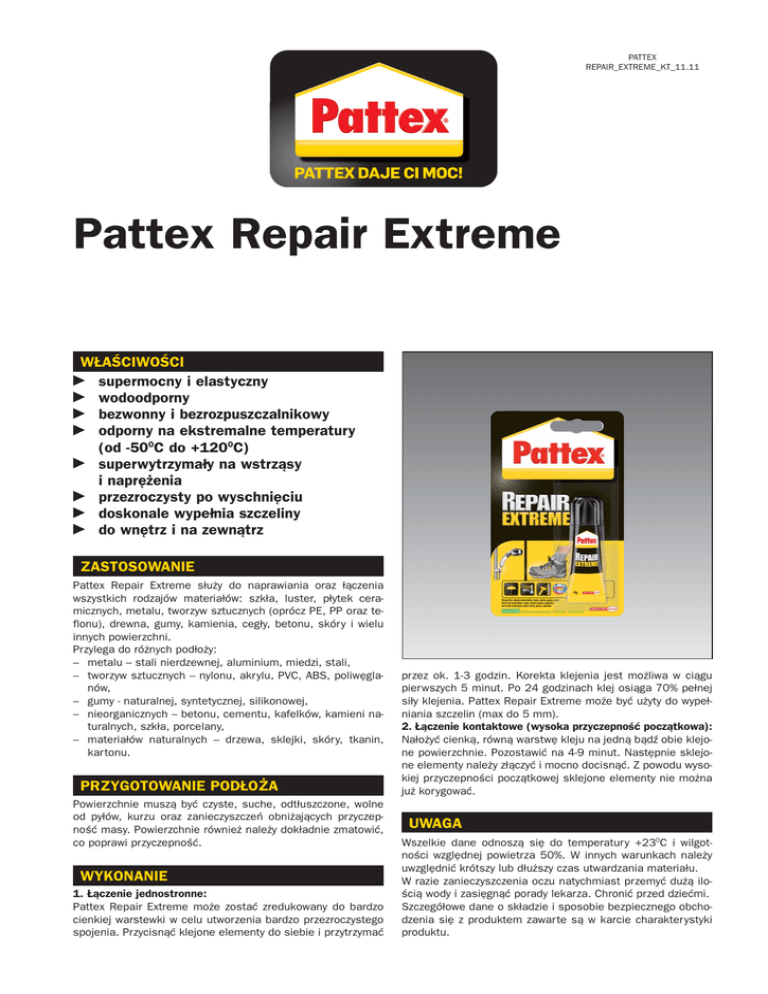 PATTEX REPAIR_EXTREME_KT_11.11 Pattex Repair Extreme WŁAŚCIWOŚCI supermocny i elastyczny wodoodporny bezwonny i bezrozpuszczalnikowy odporny na ekstremalne temperatury (od -500C do +1200C) superwytrzymały na wstrząsy i naprężenia przezroczysty po wyschnięciu doskonale wypełnia szczeliny do wnętrz i na zewnątrz ZASTOSOWANIE Pattex Repair Extreme służy do naprawiania oraz łączenia wszystkich rodzajów materiałów: szkła, luster, płytek ceramicznych, metalu, tworzyw sztucznych (oprócz PE, PP oraz teflonu), drewna, gumy, kamienia, cegły, betonu, skóry i wielu innych powierzchni. Przylega do różnych podłoży: – metalu – stali nierdzewnej, aluminium, miedzi, stali, – tworzyw sztucznych – nylonu, akrylu, PVC, ABS, poliwęglanów, – gumy - naturalnej, syntetycznej, silikonowej, – nieorganicznych – betonu, cementu, kafelków, kamieni naturalnych, szkła, porcelany, – materiałów naturalnych – drzewa, sklejki, skóry, tkanin, kartonu. PRZYGOTOWANIE PODŁOŻA Powierzchnie muszą być czyste, suche, odtłuszczone, wolne od pyłów, kurzu oraz zanieczyszczeń obniżających przyczepność masy. Powierzchnie również należy dokładnie zmatowić, co poprawi przyczepność. WYKONANIE 1. Łączenie jednostronne: Pattex Repair Extreme może zostać zredukowany do bardzo cienkiej warstewki w celu utworzenia bardzo przezroczystego spojenia. Przycisnąć klejone elementy do siebie i przytrzymać przez ok. 1-3 godzin. Korekta klejenia jest możliwa w ciągu pierwszych 5 minut. Po 24 godzinach klej osiąga 70% pełnej siły klejenia. Pattex Repair Extreme może być użyty do wypełniania szczelin (max do 5 mm). 2. Łączenie kontaktowe (wysoka przyczepność początkowa): Nałożyć cienką, równą warstwę kleju na jedną bądź obie klejone powierzchnie. Pozostawić na 4-9 minut. Następnie sklejone elementy należy złączyć i mocno docisnąć. Z powodu wysokiej przyczepności początkowej sklejone elementy nie można już korygować. UWAGA Wszelkie dane odnoszą się do temperatury +230C i wilgotności względnej powietrza 50%. W innych warunkach należy uwzględnić krótszy lub dłuższy czas utwardzania materiału. W razie zanieczyszczenia oczu natychmiast przemyć dużą ilością wody i zasięgnąć porady lekarza. Chronić przed dziećmi. Szczegółowe dane o składzie i sposobie bezpiecznego obchodzenia się z produktem zawarte są w karcie charakterystyki produktu. ZALECENIA DANE TECHNICZNE Niniejsza karta techniczna określa zakres stosowania materiału, ale nie może zastąpić przygotowania wykonawcy. Producent gwarantuje jakość wyrobu, natomiast nie ma wpływu na warunki i sposób jego użycia. W przypadku wątpliwości należy wykonać własne próby stosowania. Wraz z ukazaniem się tej karty technicznej tracą ważność karty wcześniejsze. SKŁADOWANIE Do 18 miesięcy od daty produkcji podanej na opakowaniu. Przechowywać w szczelnie zamkniętych oryginalnych opakowaniach, w temperaturze od +50C do +300C. Chronić przed bezpośrednim działaniem silnego światła. Kolor po utwardzeniu: przezroczysty Czas korekty: 5 minut po aplikacji Czas wiązania: 3 mm na 24 godziny (w temperaturze około +230C) Wytrzymałość: około 30 kg/cm2 (w zależności od klejonego materiału) Wydłużenie: około 200% Temperatura stosowania: od +50C do +400C Odporność termiczna*: od -500C do +1200C * w zależności od warunków temperaturowo-wilgotnościowych OPAKOWANIA Metalowa tubka 8 g na blistrze. Henkel Polska Sp. z o.o. ul. Domaniewska 41, 02-672 Warszawa Centralny Dział Obsługi Klienta: Tel. (+48) 41 371 01 00 • Fax (+48) 41 374 22 22 www.pattex.pl • infolinia: 800 120 241