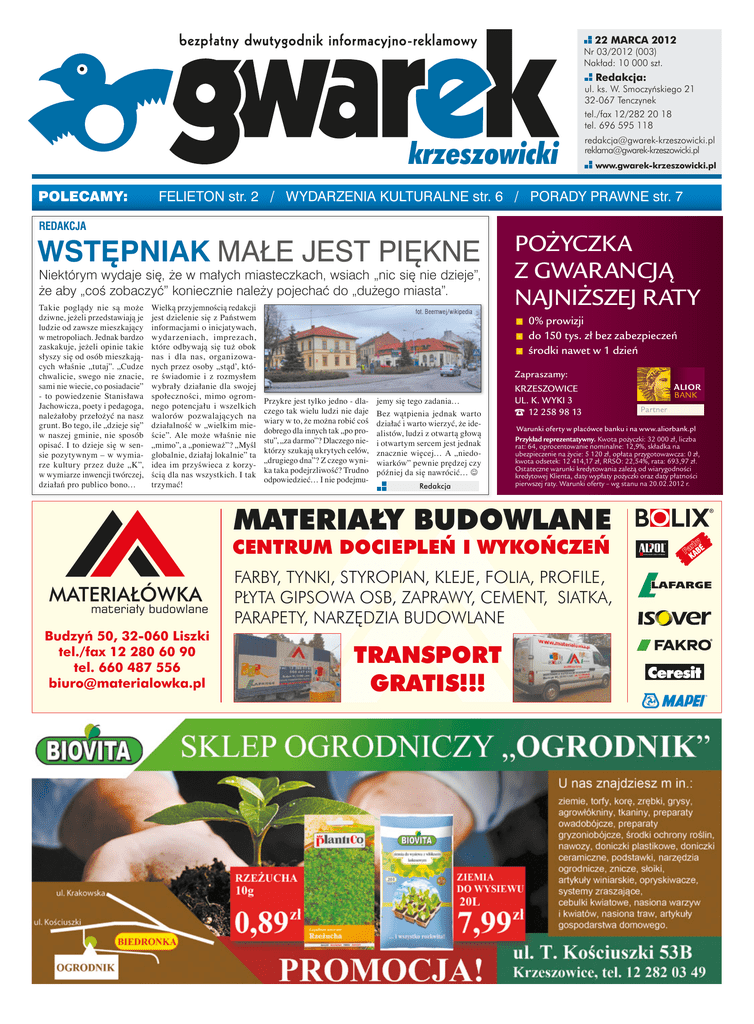 22 MARCA 2012 Nr 03/2012 (003) Nakład: 10 000 szt. Redakcja: ul. ks. W. Smoczyńskiego 21 32-067 Tenczynek tel./fax 12/282 20 18 tel. 696 595 118 krzeszowicki POLECAMY: www.gwarek-krzeszowicki.pl FELIETON str. 2 / WYDARZENIA KULTURALNE str. 6 / PORADY PRAWNE str. 7 REDAKCJA WSTĘPNIAK MAŁE JEST PIĘKNE Niektórym wydaje się, że w małych miasteczkach, wsiach „nic się nie dzieje”, że aby „coś zobaczyć” koniecznie należy pojechać do „dużego miasta”. Takie poglądy nie są może dziwne, jeżeli przedstawiają je ludzie od zawsze mieszkający w metropoliach. Jednak bardzo zaskakuje, jeżeli opinie takie słyszy się od osób mieszkających właśnie „tutaj”. „Cudze chwalicie, swego nie znacie, sami nie wiecie, co posiadacie” - to powiedzenie Stanisława Jachowicza, poety i pedagoga, należałoby przełożyć na nasz grunt. Bo tego, ile „dzieje się” w naszej gminie, nie sposób opisać. I to dzieje się w sensie pozytywnym – w wymiarze kultury przez duże „K”, w wymiarze inwencji twórczej, działań pro publico bono… [email protected] [email protected] Wielką przyjemnością redakcji jest dzielenie się z Państwem informacjami o inicjatywach, wydarzeniach, imprezach, które odbywają się tuż obok nas i dla nas, organizowanych przez osoby „stąd’, które świadomie i z rozmysłem wybrały działanie dla swojej społeczności, mimo ogromnego potencjału i wszelkich walorów pozwalających na działalność w „wielkim mieście”. Ale może właśnie nie „mimo”, a „ponieważ”? „Myśl globalnie, działaj lokalnie” ta idea im przyświeca z korzyścią dla nas wszystkich. I tak trzymać! fot. Beemwej/wikipedia Przykre jest tylko jedno - dlaczego tak wielu ludzi nie daje wiary w to, że można robić coś dobrego dla innych tak „po prostu”, „za darmo”? Dlaczego niektórzy szukają ukrytych celów, „drugiego dna”? Z czego wynika taka podejrzliwość? Trudno odpowiedzieć… I nie podejmu- jemy się tego zadania… Bez wątpienia jednak warto działać i warto wierzyć, że idealistów, ludzi z otwartą głową i otwartym sercem jest jednak znacznie więcej… A „niedowiarków” pewnie prędzej czy później da się nawrócić… Redakcja pożycZKa Z gwarancją najniżsZej raty 0% prowizji do 150 tys. zł bez zabezpieczeń środki nawet w 1 dzień Zapraszamy: KrZesZowice ul. K. wyKi 3 12 258 98 13 warunki oferty w placówce banku i na www.aliorbank.pl Przykład reprezentatywny. Kwota pożyczki: 32 000 zł, liczba rat: 64, oprocentowanie nominalne: 12,9%, składka na ubezpieczenie na życie: 5 120 zł, opłata przygotowawcza: 0 zł, kwota odsetek: 12 414,17 zł, RRSO: 22,54%, rata: 693,97 zł. Ostateczne warunki kredytowania zależą od wiarygodności kredytowej Klienta, daty wypłaty pożyczki oraz daty płatności pierwszej raty. Warunki oferty – wg stanu na 20.02.2012 r. MATERIAŁY BUDOWLANE CENTRUM DOCIEPLEŃ I WYKOŃCZEŃ MATERIAŁÓWKA materiały budowlane Budzyń 50, 32-060 Liszki tel./fax 12 280 60 90 tel. 660 487 556 [email protected] FARBY, TYNKI, STYROPIAN, KLEJE, FOLIA, PROFILE, PŁYTA GIPSOWA OSB, ZAPRAWY, CEMENT, SIATKA, PARAPETY, NARZĘDZIA BUDOWLANE TRANSPORT GRATIS!!! 2 Informacje, Reklamy krzeszowicki POLITYKA WALKA O DRUGĄ KARETKĘ DLA KRZESZOWIC W ubiegłym tygodniu poseł Andrzej Adamczyk podjął się kolejnych działań, zmierzających do przywrócenia drugiej karetki podstawowego zespołu ratownictwa medycznego na teren Gminy Krzeszowice. ratownictwa medycznego, który mógłby w pełni zabezpieczyć zapotrzebowanie mieszkańców Gminy Krzeszowice w świadczenia ratownictwa medycznego. W apelu posła czytamy: Z uwagi na procedury przekazywania pacjenta do oddziału ratunkowego, a także czasu jaki musi upłynąć w związku z powrotem karetki do miejsca stacjonowania realnie czas przebywania karetki w Krzeszowicach jest drastycznie mały. Taka sytuacja prowadzi niejednokrotnie do destabilizacji systemu ratownictwa medycznego na dużym obszarze Powiatu Krakowskiego, gdyż jak wskazują statystyki karetki z sąsiednich oddziałów wyjeżdżają na pomoc, w prawie 25% wszystkich wyjazdów na terenie gminy Krzeszowice, osłabiając tym samym pierwotnie im przypisane miejsca stacjonowania. W świetle przepisów zawartych w Ustawie o Państwowym Ratownictwie Medycznym, istnieje możliwość doprowadzenia przez Wojewodę Małopolskiego do aktualizacji Wojewódzkiego Planu Działania systemu Państwowego Ratownictwa Medycznego. Następnie taki plan musi zostać zatwierdzony przez Ministra Zdrowia. W planie Wojewoda określa liczbę i rozmieszczenie na obszarze województwa jednostek systemu. Aktualizacja przez Wojewodę musi nastąpić do końca marca, tak aby od 1 lipca 2012 roku mógł obowiązywać nowy plan i organizacja ratownictwa O sprawie został poinformowany medycznego w regionie. również Minister Zdrowia, któreW związku z powyższym, poseł go zadaniem jest między innymi Adamczyk zaapelował do Woje- bieżące monitorowanie działania wody Małopolskiego o rozważa- systemu ratownictwa medycznego. Arłukowicza przywołane zostały statystki: (…) teren Gminy Krzeszowice, liczący ponad 32 tys. mieszkańców pozostał objęty zaledwie jedną karetką, w sytuacji, gdzie bezpiecznym standardem dla mieszkańców Powiatu Krakowskiego jest jeden zespół ratowniczy z karetką na 25 tysięcy osób. Norma została zaburzona w gminie Krzeszowice.” Działania w sprawie przywrócenia karetki zostały także podjęte przez Radę Powiatu Krakowskiego, która nie przywrócenia do Krzeszowic W interpelacji poselskiej, skiero- pod koniec lutego przyjęła jednodrugiego podstawowego zespołu wanej na ręce ministra Bartosza głośnie stosowną rezolucję. Wobec takich danych i okoliczności należy oczekiwać, iż zarówno Wojewoda Małopolski, jak też Minister Zdrowia potraktują sprawę poważnie i doprowadzą do zmiany sytuacji, jaka ma miejsce w Gminie Krzeszowice od lipca zeszłego roku. Chodzi 