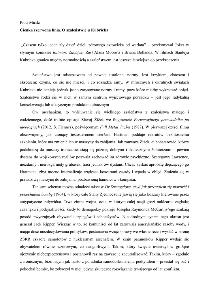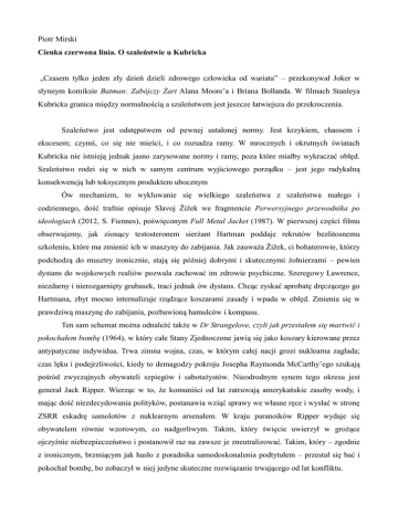 Piotr Mirski Cienka czerwona linia. O szaleństwie u Kubricka „Czasem tylko jeden zły dzień dzieli zdrowego człowieka od wariata” – przekonywał Joker w słynnym komiksie Batman: Zabójczy Żart Alana Moore’a i Briana Bollanda. W filmach Stanleya Kubricka granica między normalnością a szaleństwem jest jeszcze łatwiejsza do przekroczenia. Szaleństwo jest odstępstwem od pewnej ustalonej normy. Jest krzykiem, chaosem i ekscesem; czymś, co się nie mieści, i co rozsadza ramy. W mrocznych i okrutnych światach Kubricka nie istnieją jednak jasno zarysowane normy i ramy, poza które miałby wykraczać obłęd. Szaleństwo rodzi się w nich w samym centrum wyjściowego porządku – jest jego radykalną konsekwencją lub toksycznym produktem ubocznym Ów mechanizm, to wykluwanie się wielkiego szaleństwa z szaleństwa małego i codziennego, dość trafnie opisuje Slavoj Žižek we fragmencie Perwersyjnego przewodnika po ideologiach (2012, S. Fiennes), poświęconym Full Metal Jacket (1987). W pierwszej części filmu obserwujemy, jak zionący testosteronem sierżant Hartman poddaje rekrutów bezlitosnemu szkoleniu, które ma zmienić ich w maszyny do zabijania. Jak zauważa Žižek, ci bohaterowie, którzy podchodzą do musztry ironicznie, stają się później dobrymi i skutecznymi żołnierzami – pewien dystans do wojskowych realiów pozwala zachować im zdrowie psychiczne. Szeregowy Lawrence, niezdarny i nierozgarnięty grubasek, traci jednak ów dystans. Chcąc zyskać aprobatę dręczącego go Hartmana, zbyt mocno internalizuje rządzące koszarami zasady i wpada w obłęd. Zmienia się w prawdziwą maszynę do zabijania, pozbawioną hamulców i kompasu. Ten sam schemat można odnaleźć także w Dr Strangelove, czyli jak przestałem się martwić i pokochałem bombę (1964), w który całe Stany Zjednoczone jawią się jako koszary kierowane przez antypatyczne indywidua. Trwa zimna wojna, czas, w którym całej nacji grozi nuklearna zagłada; czas lęku i podejrzliwości, kiedy to demagodzy pokroju Josepha Raymonda McCarthy’ego szukają pośród zwyczajnych obywateli szpiegów i sabotażystów. Nieodrodnym synem tego okresu jest generał Jack Ripper. Wierząc w to, że komuniści od lat zatruwają amerykańskie zasoby wody, i mając dość niezdecydowania polityków, postanawia wziąć sprawy we własne ręce i wysłać w stronę ZSRR eskadrę samolotów z nuklearnym arsenałem. W kraju paranoików Ripper wydaje się obywatelem równie wzorowym, co nadgorliwym. Takim, który święcie uwierzył w grożące ojczyźnie niebezpieczeństwo i postanowił raz na zawsze je zneutralizować. Takim, który – zgodnie z ironicznym, brzmiącym jak hasło z poradnika samodoskonalenia podtytułem – przestał się bać i pokochał bombę, bo zobaczył w niej jedyne skuteczne rozwiązanie trwającego od lat konfliktu. Architektura umysłu Filmem Kubricka, w którym najmocniej zostaje zatarta granica między normalnością a szaleństwem, jest Lśnienie (1980). Jego bohaterami są członkowie rodziny Torrance’ów: Jack, Wendy oraz ich syn Danny, którzy spędzają zimę w opustoszałym hotelu Overlook. Wszyscy trzej noszą w sobie jakąś psychiczną skazę. Zaleczony alkoholik Jack, mający potargane włosy i usta rozciągnięte w diabolicznym uśmiechu, wygląda jak ktoś gotowy w każdej chwili eksplodować. Zahukana Wendy wydaje się być wiecznie bliska płaczu. Natomiast introwertyczny Danny rozmawia z mieszkającym w jego ustach przyjacielem i regularnie doświadcza napadów lęku. Lśnienie to historia o tym, jak cała trójka spada na dno króliczej nory. Osobnym bohaterem filmu jest hotel Overlook. Wielki, pełen poplątanych korytarzy i pustych pokoi, w których odbija się echem życie dawnych mieszkańców. Zbudowany na indiańskim cmentarzu, a więc trwale naznaczony piętnem śmierci. Jak w filmie dokumentalnym Pokój 237 (2012, R. Ascher) zauważają egzegeci Lśnienia, nie wszystko się w hotelu zgadza. Okna znajdują się w miejscach, gdzie wedle architektonicznych reguł nie powinno być żadnych okien, a przedmioty, które jeszcze przed chwilą stały na drugim planie, znikają bez żadnej racjonalnej przyczyny. Kolejne montażowe cięcia odsłaniają grube szwy i dziury w świecie przedstawionym. Trudno jednak stwierdzić, czy przestrzeń hotelu zaburza nadnaturalna siła, czy zniekształca ją szaleństwo Torrance’ów (podobnie jak w klasycznym kinie ekspresjonistycznym, w którym kontury przedmiotów i budynków wykrzywiają się równolegle do percepcji bohaterów). Overlook jest gabinetem luster, gdzie pośród mnogości odbić zanika podział na obiektywne i subiektywne. Najbardziej prawdopodobne wydaje się to, że między rodziną Torrance’ów a hotelem Overlook zachodzi niekończące się sprzężenie zwrotne. Wypełniająca budynek ciemna energia stymuluje ich szaleństwo i karmi się nim. Jej głównym celem jest Jack. Znaczące jest to, że po raz pierwszy widzi ducha w pustym hotelowym barze. Siada przy kontuarze, przez chwilę patrzy się przed siebie, a potem wybucha śmiechem i wita się z kimś. W przeciwujęciu, być może najbardziej przerażającym w historii kina grozy, odkrywa, że stoi przez nim chorobliwie blady barman. Demony alkoholizmu dopadają wreszcie Jacka i w finale każą mu ścigać żonę i synka z siekierą. Danny też widzi duchy. Z jednej strony może on posiadać zdolności parapsychiczne – tytułowe „lśnienie”, a z drugiej, prawdopodobnie odziedziczył po ojcu chwiejną konstrukcję umysłu. Przez większość czasu żadnych wizji nie doświadcza Wendy. Dopiero w finale, kiedy jej histeria osiąga apogeum, a ona biega po korytarzach, krzycząc aż do zdarcia gardła, kolejne zjawy objawiają się jej niczym podczas przejażdżki tunelem strachu. Z całej trójki jednak tylko Jack permanentnie traci zmysły. Dlatego w finale staje się częścią hotelu Overlook. Jego ciało zostaje w nim jako zamarznięte 