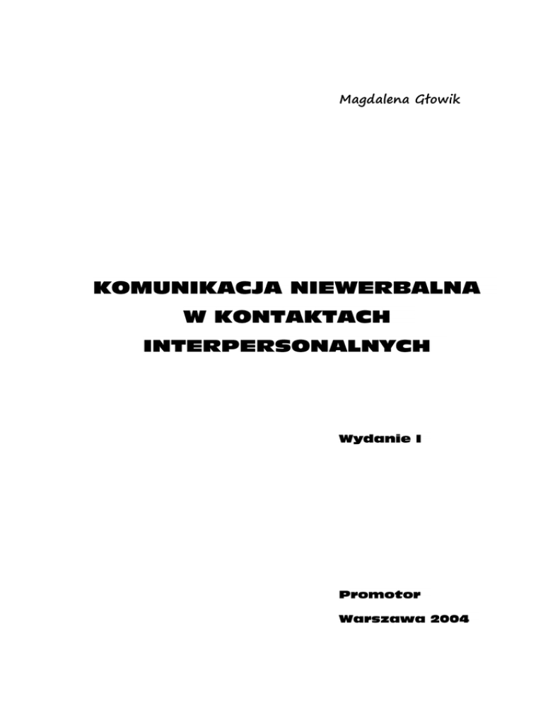 Magdalena Głowik Copyright © by Promotor Warszawa 2004 ISBN 83-918833-7-X Promotor ul. Stalowa 44/1 03-429 Warszawa tel./faks (22) 698-12-41 e-mail: [email protected] http://promotor.com.pl Spis treści Wstęp ............................................................................................................................................ 5 ROZDZIAŁ I. POJĘCIE KOMUNIKACJI INTERPERSONALNEJ ......................... 7 1.1. Cechy i funkcje komunikowania .................................................................................... 8 1.2. Struktura procesu komunikowania .............................................................................. 10 1.3. Modele komunikowania ................................................................................................ 19 1.4. Zasady komunikowania interpersonalnego................................................................ 24 1.5. Przeszkody w komunikacji interpersonalnej .............................................................. 25 1.6. Komunikacja werbalna i niewerbalna ......................................................................... 28 1.6.1. Istota komunikacji werbalnej ................................................................................. 28 1.6.2. Znaczenie komunikacji niewerbalnej .................................................................... 31 1.7. Komunikacja werbalna versus niewerbalna ............................................................... 33 ROZDZIAŁ II. ROLA KOMUNIKACJI NIEWERBALNEJ ...................................... 37 2.1. Funkcje komunikacji niewerbalnej .............................................................................. 39 2.1.1. Klasyfikacja Scherera i Wallbotta (1985) .............................................................. 39 2.1.2. Klasyfikacja Knappa (1978).................................................................................... 40 2.1.3. Klasyfikacja Ekmana i Friesena (1978) ................................................................. 42 2.1.4. Klasyfikacja Judy Burgoon ..................................................................................... 43 2.2. Modele zachowań niewerbalnych ................................................................................ 44 2.2.1. Równanie intymności Argyle’a............................................................................... 44 2.2.2. Model zaangażowania niewerbalnego Pattersona ............................................... 46 2.3. Historia badań nad komunikacją niewerbalną ........................................................... 47 2.4. Komunikacja międzykulturowa ................................................................................... 52 2.4.1. Kulturowe uniwersalizmy w komunikowaniu niewerbalnym ........................... 52 2.4.2. Kulturowe zróżnicowanie w komunikowaniu niewerbalnym ........................... 57 ROZDZIAŁ III FORMY KOMUNIKACJI NIEWERBALNEJ ................................. 69 3.1. Gestykulacja .................................................................................................................... 69 3.2. Mimika, wyraz twarzy .................................................................................................... 95 3.3. Postawa ciała ................................................................................................................. 105 3.4. Dotyk i kontakt fizyczny ............................................................................................. 118 3.5. Dystans fizyczny ........................................................................................................... 121 3.6. Ubiór i wygląd zewnętrzny ......................................................................................... 127 3.7. Niewerbalne aspekty mowy ........................................................................................ 130 3.8. Jakość wypowiedzi ....................................................................................................... 131 3.9. Spojrzenia wzajemne i spojrzenia jednostronne ..................................................... 132 3.10. Elementy środowiska fizycznego ............................................................................ 134 Zakończenie ............................................................................................................................ 135 Bibliografia............................................................................................................................... 137 Spis rysunków ......................................................................................................................... 139 Spis tabel .................................................................................................................................. 141 Wstęp „Jak wszystko w ludzkim zachowaniu się, tak i gesty korzeniami sięgają reaktywnej natury naszego organizmu. Jednak napisany kod mimicznych przekazów i odpowiedzi jest rezultatem anonimowego trudu kunsztownej tradycji społecznej” (Edward Sapir, „Kultura, język, osobowość”) Od zarania dziejów człowiek próbuje znaleźć regułę na opis swojego zachowania i wyrażania swoich uczuć. Niewerbalny sposób komunikowania towarzyszy mu już od dawna. Ludzie komunikują sobie nawzajem to kim są, czego pragną, nie tylko poprzez wypowiadane słowa, ale poprzez bezgłośny język ciała i swój styl ekspresji. Bardzo znaczącymi środkami komunikowania się są między innymi wyraz twarzy, spojrzenie, ruchy ciała, gesty, modulacja i natężenie głosu. Celem pracy jest próba analizy badań i teorii na temat niewerbalnego komunikowania. Ma ona przynieść odpowiedź na główne pytanie o rolę i funkcje komunikacyjne zachowań niewerbalnych w interpersonalnym komunikowaniu. Rozbieżności interpretacyjne występujące w literaturze z zakresu komunikacji niewerbalnej, stworzyły możliwość podjęcia 