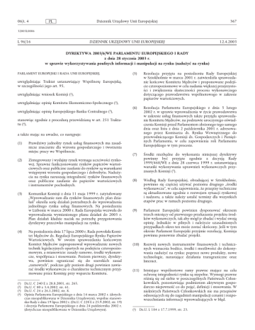 06/t. 4 PL Dziennik Urzędowy Unii Europejskiej 367 32003L0006 L 96/16 DZIENNIK URZĘDOWY UNII EUROPEJSKIEJ 12.4.2003 DYREKTYWA 2003/6/WE PARLAMENTU EUROPEJSKIEGO I RADY z dnia 28 stycznia 2003 r. w sprawie wykorzystywania poufnych informacji i manipulacji na rynku (nadużyć na rynku) PARLAMENT EUROPEJSKI I RADA UNII EUROPEJSKIEJ, (5) Rezolucja przyjęta na posiedzeniu Rady Europejskiej w Sztokholmie w marcu 2001 r. zatwierdziła sprawozdanie końcowe Komitetu Mędrców i proponowane podejście czteropoziomowe w celu nadania większej przejrzystości i zwiększenia skuteczności procesu wykonawczego dotyczącego prawodawstwa wspólnotowego w zakresie papierów wartościowych. (6) Rezolucja Parlamentu Europejskiego z dnia 5 lutego 2002 r. w sprawie wprowadzenia w życie prawodawstwa w zakresie usług finansowych także przyjęła sprawozdanie Komitetu Mędrców, na podstawie uroczystego oświadczenia Komisji przed Parlamentem złożonego tego samego dnia oraz listu z dnia 2 października 2001 r. adresowanego przez Komisarza ds. Rynku Wewnętrznego do przewodniczącego Komisji ds. Gospodarczych i Pieniężnych Parlamentu, w celu zapewnienia roli Parlamentu Europejskiego w tym procesie. (7) Środki niezbędne do wykonania niniejszej dyrektywy powinny być przyjęte zgodnie z decyzją Rady 1999/468/WE z dnia 28 czerwca 1999 r. ustanawiającą warunki wykonywania uprawnień wykonawczych przyznanych Komisji (5). (8) Według Rady Europejskiej, obradującej w Sztokholmie, powinno się częściej używać poziomu drugiego „środki wykonawcze”, w celu zapewnienia, że przepisy techniczne są aktualizowane zgodnie z rozwojem sytuacji rynkowej i nadzoru, a także należy ustalić terminy dla wszystkich etapów prac w ramach poziomu drugiego. (9) Parlament Europejski powinien dysponować okresem trzech miesięcy od pierwszego przekazania projektu środków wykonawczych, tak aby mógł je zbadać i wydać swoją opinię. Jednakże w pilnych i należycie uzasadnionych przypadkach okres ten może zostać skrócony. Jeśli w tym okresie Parlament Europejski przyjmie rezolucję, Komisja powinna ponownie zbadać projekt. (10) Rozwój nowych instrumentów finansowych i technicznych wzmacnia bodźce, środki i możliwości do dokonywania nadużyć na rynku: poprzez nowe produkty, nowe technologie, narastające działania transgraniczne oraz Internet. (11) Istniejące wspólnotowe ramy prawne mające na celu ochronę integralności rynku są niepełne. Wymogi prawne różnią się od siebie w poszczególnych Państwach Członkowskich, pozostawiając podmiotom aktywnym gospodarczo niepewność co do pojęć, definicji i stosowania. W niektórych Państwach Członkowskich nie ma przepisów odnoszących się do zagadnień manipulacji cenami i rozpowszechniania informacji wprowadzających w błąd. uwzględniając Traktat ustanawiający Wspólnotę Europejską, w szczególności jego art. 95, uwzględniając wniosek Komisji (1), uwzględniając opinię Komitetu Ekonomiczno-Społecznego (2), uwzględniając opinię Europejskiego Banku Centralnego (3), stanowiąc zgodnie z procedurą przewidzianą w art. 251 Traktatu (4), a także mając na uwadze, co następuje: (1) Prawdziwy jednolity rynek usług finansowych ma zasadnicze znaczenie dla wzrostu gospodarczego i tworzenia miejsc pracy we Wspólnocie. (2) Zintegrowany i wydajny rynek wymaga uczciwości rynkowej. Sprawne funkcjonowanie rynków papierów wartościowych oraz publiczne zaufanie do rynków są warunkami wstępnymi wzrostu gospodarczego i dobrobytu. Nadużycia na rynku naruszają integralność rynków finansowych oraz publiczne zaufanie do papierów wartościowych i instrumentów pochodnych. (3) (4) (1) (2) (3) (4) Komunikat Komisji z dnia 11 maja 1999 r. zatytułowany „Wprowadzanie ram dla rynków finansowych: plan działań” określa serię działań potrzebnych do wprowadzenia jednolitego rynku usług finansowych. Na posiedzeniu w Lizbonie w marcu 2000 r. Rada Europejska wezwała do wprowadzenia wymienionego planu działań do 2005 r. Plan działań kładzie nacisk na potrzebę przygotowania dyrektywy przeciwko manipulacji na rynku. Na posiedzeniu dnia 17 lipca 2000 r. Rada powołała Komitet Mędrców ds. Regulacji Europejskiego Rynku Papierów Wartościowych. W swoim sprawozdaniu końcowym Komitet Mędrców zaproponował wprowadzenie nowych technik legislacyjnych opartych na podejściu czteropoziomowym, a mianowicie: zasady ramowe, środki wykonawcze, współpraca i stosowanie. Poziom pierwszy, dyrektywa, powinien ograniczać się do szerokich zasad „ramowych”, podczas gdy poziom drugi powinien zawierać środki wykonawcze o charakterze technicznym przyjmowane przez Komisję przy wsparciu Komitetu. Dz.U. C 240 E z 28.8.2001, str. 265. Dz.U. C 80 z 3.4.2002, str. 61. Dz.U. C 24 z 26.1.2002, str. 8. Opinia Parlamentu Europejskiego z dnia 14 marca 2002 r. (dotychczas nieopublikowana w Dzienniku Urzędowym), wspólne stanowisko Rady z dnia 19 lipca 2002 r. (Dz.U. C 228 E z 25.9.2002, str. 19) i decyzja Parlamentu Europejskiego z dnia 24 października 2002 r. (dotychczas nieopublikowana w Dzienniku Urzędowym). (5) Dz.U. L 184 z 17.7.1999, str. 23. 368 PL Dziennik Urzędowy Unii Europejskiej (12) Nadużycia na rynku polegają na wykorzystywaniu poufnych informacji i manipulacjach na rynku. Cel przepisów wymierzonych przeciwko wykorzystywaniu poufnych informacji jest taki sam jak cel przepisów wymierzonych przeciwko manipulacjom na rynku: zapewnienie integralności rynków finansowych Wspólnoty i zwiększenie zaufania inwestorów do tych rynków. Dlatego zalecane jest wprowadzenie łączonych zasad zwalczania zarówno wykorzystywania poufnych informacji, jak i manipulacji na rynku. Jedna dyrektywa zapewni w całej Wspólnocie takie same ramy dla przyznania obowiązków, stosowania i współpracy. (13) Z uwagi na zmiany na rynkach finansowych i w prawodawstwie wspólnotowym od czasu przyjęcia dyrektywy Rady 89/592/EWG z dnia 13 listopada 1