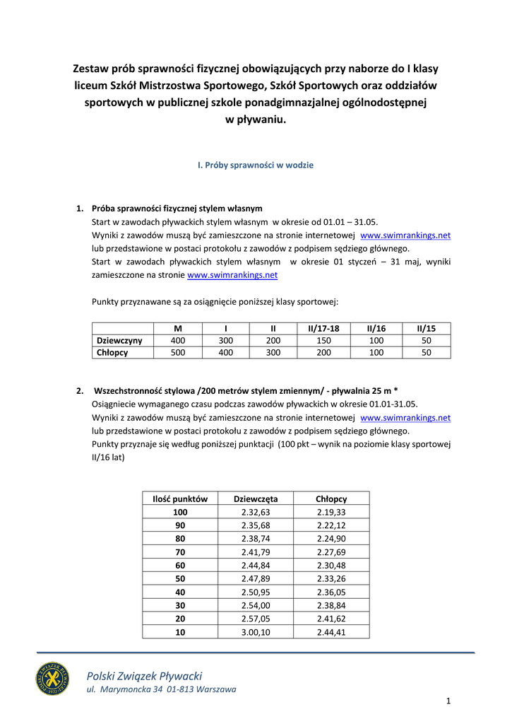 Zestaw prób sprawności fizycznej obowiązujących przy naborze do I klasy liceum Szkół Mistrzostwa Sportowego, Szkół Sportowych oraz oddziałów sportowych w publicznej szkole ponadgimnazjalnej ogólnodostępnej w pływaniu. I. Próby sprawności w wodzie 1. Próba sprawności fizycznej stylem własnym Start w zawodach pływackich stylem własnym w okresie od 01.01 – 31.05. Wyniki z zawodów muszą być zamieszczone na stronie internetowej www.swimrankings.net lub przedstawione w postaci protokołu z zawodów z podpisem sędziego głównego. Start w zawodach pływackich stylem własnym w okresie 01 styczeń – 31 maj, wyniki zamieszczone na stronie www.swimrankings.net Punkty przyznawane są za osiągnięcie poniższej klasy sportowej: Dziewczyny Chłopcy 2. M 400 500 I 300 400 II 200 300 II/17-18 150 200 II/16 100 100 II/15 50 50 Wszechstronność stylowa /200 metrów stylem zmiennym/ - pływalnia 25 m * Osiągniecie wymaganego czasu podczas zawodów pływackich w okresie 01.01-31.05. Wyniki z zawodów muszą być zamieszczone na stronie internetowej www.swimrankings.net lub przedstawione w postaci protokołu z zawodów z podpisem sędziego głównego. Punkty przyznaje się według poniższej punktacji (100 pkt – wynik na poziomie klasy sportowej II/16 lat) Ilość punktów 100 90 80 70 60 50 40 30 20 10 Dziewczęta 2.32,63 2.35,68 2.38,74 2.41,79 2.44,84 2.47,89 2.50,95 2.54,00 2.57,05 3.00,10 Chłopcy 2.19,33 2.22,12 2.24,90 2.27,69 2.30,48 2.33,26 2.36,05 2.38,84 2.41,62 2.44,41 _____________________________________________________________________________________________ Polski Związek Pływacki ul. Marymoncka 34 01-813 Warszawa 1 3. Wytrzymałość tlenowa /400 metrów stylem dowolnym/ - pływalnia 25 m * Osiągniecie wymaganego czasu podczas zawodów pływackich w okresie 01.01-31.05. Wyniki z zawodów muszą być zamieszczone na stronie internetowej www.swimrankings.net lub przedstawione w postaci protokołu z zawodów z podpisem sędziego głównego. Punkty przyznaje się według poniższej punktacji (100 pkt – wynik na poziomie klasy sportowej II/16 lat) ilość punktów 100 90 80 70 60 50 40 30 20 10 Dziewczęta 4.40,89 4.46,51 4,52,13 4,57,74 5.03,36 5.08,98 5.14,60 5.20,21 5.25,83 5.31,45 Chłopcy 4.18,24 4.23,40 4.28,57 4.33,73 4.38,90 4.44,06 4.49,23 4.54,39 4.59,56 5.04,72 w przypadku braku wyników z zawodów istnieje możliwość zaliczenia próby podczas testów kwalifikacyjnych 4. Technika pływania – ocena techniki wszystkich styli pływackich /maksymalnie 100 punktów/. Oceny techniki dokonuje trener pływania podczas testów kwalifikacyjnych przeprowadzanych w danej placówce a) Styl motylkowy – maksymalnie 25 punktów praca nóg /25 m w ułożeniu na boku/ - oceniamy ułożenie ciała oraz technikę pracy nóg od 1 do 5 pkt. praca ramion /25 m z małą deską pomiędzy podudziami/ - oceniamy chwyt wody, pociągniecie, przenoszenie ramion od 0 do 5 pkt. koordynacja pływania /3 x LR + NN, 3 x PR + NN/ - od 0 do 5 pkt. pływanie całym stylem /35 m szybko ze skoku startowego z nawrotem/ - oceniamy pływanie pod wodą, technikę pływania oraz wykonanie nawrotu od 0 do 10 pkt. b) Styl grzbietowy - maksymalnie 25 punktów praca nóg /25m na plecach, ręce za głową/ - oceniamy ułożenie ciała oraz technikę pracy nóg od 1 do 5 pkt. praca ramion /25m z małą deską pomiędzy podudziami/ - oceniamy chwyt wody, pociągniecie, przenoszenie ramion od 0 do 5 pkt. koordynacja pływania /25m LR + NN, PR + NN/ - od 0 do 5 pkt. _____________________________________________________________________________________________ Polski Związek Pływacki ul. Marymoncka 34 01-813 Warszawa 2 pływanie całym stylem /35 m szybko ze skoku startowego z nawrotem/ - oceniamy pływanie pod wodą, technikę pływania oraz wykonanie nawrotu od 0 do 10 pkt. c) Styl klasyczny – maksymalnie 25 punktów praca nóg /25 m na plecach, 25 m ramiona z przodu / - oceniamy ułożenie ciała oraz technikę pracy nóg od 1 do 5 pkt. praca ramion /25 z małą deską pomiędzy podudziami/ - oceniamy chwyt wody, pociągniecie, przenoszenie ramion od 0 do 5 pkt. koordynacja pływania /2 x NN 1 x RR/ - od 0 do 5 pkt. pływanie całym stylem /35 m szybko ze skoku startowego z nawrotem/ - oceniamy pływanie pod wodą, technikę pływania oraz wykonanie nawrotu od 0 do 10 pkt. d) Styl dowolny – maksymalnie 25 punktów praca nóg /25m na boku/ - oceniamy ułożenie ciała oraz technikę pracy nóg od 1 do 5 pkt. praca ramion /25m z małą deską pomiędzy podudziami/ - oceniamy chwyt wody, pociągniecie, przenoszenie ramion od 0 do 5 pkt. koordynacja pływania /25m LR z oddechem z prawą stronę , 25m PR z oddechem na lewą stronę/ - od 0 do 5 pkt. pływanie całym stylem /35 m szybko ze skoku startowego z nawrotem/ - oceniamy pływanie pod wodą, technikę pływania oraz wykonanie nawrotu od 0 do 10 pkt. II. Próby sprawności na lądzie 1. Siła kończyn górnych – zwis/podciąganie na drążku a) wykonanie /dziewczęta/ Z przestawionego krzesła badana przechodzi do zwisu nachwytem o ramionach ugiętych. Dłonie winny znajdować się na szerokość barków. Na sygnał "start" zaczyna się próba zwisu i trwa aż do zmęczenia. Podbródek w czasie trwania testu winien znajdować się wyraźnie nad drążkiem. b) pomiar Próba wykonywana jest l raz. Liczy się ilość wytrzymanych sekund w wspomnianej pozycji. Pomiar kończy się z chwilą, gdy podbródek znajduje się poniżej drążka. c) uwagi Drążek musi być tak usytuowany, by badany wykonywał próbę w pełnym zwisie. a) wykonanie /chłopcy/ Z przystawionego krzesła badany przechodzi do zwisu nachwytem. Ręce znajdują się na szerokości barków. Na sygnał "start" testowany ugina ręce podciągając się na wysokość podbródka, po czym bez chwili odpoczynku przechodzi do zwisu prostego. Ćwiczenie powtarza się aż do chwili zmęczenia. b) pomiar Próba wykonana jest l raz. Liczy się ilość pełnych podciągnięć na wysok