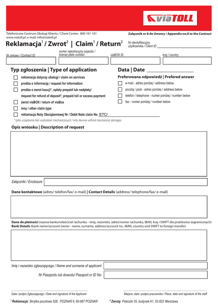 Załącznik nr 8 do Umowy / Appendix no.8 to the Contract Telefoniczne Centrum Obsługi Klienta / Client Center: 800 101 101 www.viatoll.pl, e-mail: [email protected] Reklamacja1 / Zwrot2 | Claim1 / Return2 numer rejestracyjny pojazdu / license plate number Nr umowy / Contract ID Typ zgłoszenia | Type of application reklamacja dotyczy obsługi / claim on services Nr identyfikacyjny użytkownika / Client ID: viaBOX ID kraj / country Data | Date Preferowana odpowiedź | Prefered answer prośba o informację / request for information e-mail - adres poniżej / address below prośba o zwrot kaucji*, opłaty prepaid lub nadpłaty/ pocztą / post - adres poniżej / address below request for refund of deposit*, prepaid toll or excess payment telefon / telephone - numer poniżej / number below zwrot viaBOX / return of viaBox fax - numer poniżej / number below inny / other claim type reklamacja Noty Obciążeniowej Nr / Debit Note claim No ETC/ * tylko urządzenia bez uszkodzeń mechanicznych / only devices without mechanical damages Opis wniosku | Description of request Załączniki / Enclosure Dane kontaktowe (adres/ telefon/fax/ e-mail) | Contact Details (address/ telephone/fax/ e-mail) Dane do płatności (nazwa banku/właściciel rachunku - imię, nazwisko, adres/numer rachunku, IBAN, kraj i SWIFT dla przelewów zagranicznych) Bank Details (bank name/account owner - name, surname, address/account no., IBAN, country and SWIFT to foreign transfer) Imię i nazwisko zgłaszającego / Name and surname of applicant Nr Paszportu lub dowodu/ Passport or ID No: .......................................................................................................... Data i podpis Zgłaszającego / Date and signature of the Applicant 1 Reklamacje: Skrytka pocztowa 528, POZNAŃ 9, 60-967 POZNAŃ .................................................................................................................... Miejsce, data i podpis pracownika / Place, date and signature of the staff 2 Zwroty: Poleczki 35, budynek A1, 02-822 Warszawa