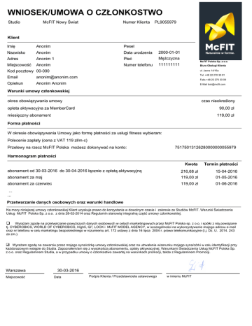 :1,26(.802:$2&=à21.267:2 0F),71RZ\ĝZLDW Studio Numer Klienta PL9055979 Klient ,PLĊ Anonim Pesel Nazwisko Anonim Data urodzenia 2000-01-01 Adres Anonim 1 3áHü 0ĊĪF]\]QD 0LHMVFRZRĞü Anonim Numer telefonu 111111111 McFIT Polska Sp. z o.o. %LXUR2EVáXJL.OLHQWD Kod pocztowy 00-000 ul. Jasna 14/16a Email [email protected] Opiekun Anonim Anonim Tel. +48 22 270 30 01 Faks +48 22 270 30 09 E-Mail [email protected] :DUXQNLXPRZ\F]áRQNRZVNLHM RNUHVRERZLą]\ZDQLDXPRZ\ F]DVQLHRNUHĞORQ\ RSáDWDDNW\ZDF\MQD]D0HPEHU&DUG ]á PLHVLĊF]Q\DERQDPHQW ]á )RUPDSáDWQRĞFL :RNUHVLHRERZLą]\ZDQLD8PRZ\MDNRIRUPĊSáDWQRĞFL]DXVáXJLILWQHVVZ\ELHUDP 3ROHFHQLH]DSáDW\FHQD]9$7]áPF 3U]HOHZ\QDU]HF]0F),73ROVNDPRĪHV]GRNRQ\ZDüQDNRQWR 75175013126280000000055979 +DUPRQRJUDPSáDWQRĞFL Kwota 7HUPLQSáDWQRĞFL abonament od 30-03-2016 do 30-04-2016áąF]QLH]RSáDWąDNW\ZDF\MQą ]á 15-04-2016 abonament za maj ]á 01-05-2016 abonament za czerwiec ]á 01-06-2016 ... ... Przetwarzanie danych osobowych oraz warunki handlowe 1DPRF\QLQLHMV]HMXPRZ\F]áRQNRZVNLHM.OLHQWX]\VNXMHSUDZRGRNRU]\VWDQLDZGRZROQ\PF]DVLHL]DNUHVLH]H6WXGLyZ0F),7:DUXQNLĝZLDGF]HQLD 8VáXJ0F),73ROVND6S]RR]GQLDRUD]5HJXODPLQVWDQRZLąLQWHJUDOQąF]ĊĞüXPRZ\F]áRQNRZVNLHM :\UDĪDP]JRGĊQDSU]HWZDU]DQLHSRZ\ĪV]\FKGDQ\FKRVRERZ\FKZFHODFKPDUNHWLQJRZ\FKSU]H]0F),73ROVNDVS]RRLVSyáNL]QLąSRZLą]DQH tj. CYBEROBICS, WORLD OF CYBEROBICS, High5, Qi², /22;L0F),702'(/$*(1&<ZV]F]HJyOQRĞFLQDZ\NRU]\VW\ZDQLHPRMHJRDGUHVXHPDLO RUD]QUWHOHIRQXZFHOXPDUNHWLQJXEH]SRĞUHGQLHJRZUR]XPLHQLXDUWXVWDZ\]GQLDOLSFDUSUDZRWHOHNRPXQLNDF\MQHWM']8 ze zm.). :\UDĪDP]JRGĊQD]DZDUFLHSU]H]PRMHJRV\QDFyUNĊXPRZ\F]áRQNRZVNLHMRUD]QDXWUZDOHQLHZL]HUXQNXPRMHJRV\QDFyUNLZFHOXLGHQW\ILNDFMLSU]\ NDĪGRUD]RZ\PZVWĊSLHGR6WXGLD=DSR]QDáHPDPVLĊ]Z\VRNRĞFLąDERQDPHQWXRSáDW\DNW\ZDF\MQHM:DUXQNDPLĝZLDGF]HQLD8VáXJ0F),73ROVND6S ]RRRUD]5HJXODPLQHP6WXGLDDZSU]\SDGNXXPRZ\RF]áRQNRVWZR]DZDUWHMQDZDUXQNDFKSURPRFMLWDNĪH]5HJXODPLQHP3URPRFML Warszawa 0LHMVFRZRĞü 30-03-2016 Data Podpis Klienta / Przedstawiciela ustawowego w imieniu McFIT :DUXQNLĝZLDGF]HQLD8VáXJ :DUXQNLĝZLDGF]HQLD8VáXJ :DUXQNLĝZLDGF]HQLD8VáXJ:ĝ80F),73ROVND6S]RR]VLHG]LEąZ:DUV]DZLHDGUHVXO6LHQQD ZSLVDQHMGR5HMHVWUX3U]HGVLĊELRUFyZ.56SURZDG]RQHJRSU]H]6ąG5HMRQRZ\GODPVW:DUV]DZ\Z:DUV]DZLH;,, :\G]LDá*RVSRGDUF]\.56SRGQXPHUHPZ\VRNRĞüNDSLWDáX]DNáDGRZHJR]á1,3 REGON: 146141227. 1. ZAWARCIE UMOWY =DNUHVRERZLą]\ZDQLD:DUXQNyZĝZLDGF]HQLD8VáXJ 1LQLHMV]H:DUXQNLĝZLDGF]HQLD8VáXJ:ĝ8VWRVXMHVLĊGRZV]\VWNLFKXPyZ]DZDUW\FKSU]H]0F),73ROVND6S]RR (McFIT) z jej Klientami, o ile w poszczególnych przypadkach nie uzgodniono inaczej. Klienci to osoby, które na mocy umowy F]áRQNRZVNLHM]DZDUWHM]0F),7VąXSUDZQLRQHGRNRU]\VWDQLD]HZV]\VWNLFK6WXGLyZILWQHVV0F),76WXGLD 1.2 Wniosek/Umowa :QLRVHNRF]áRQNRVWZRVWDQRZLZLąĪąFąVNLHURZDQąGR0F),7RIHUWĊ]DZDUFLDXPRZ\F]áRQNRZVNLHM]0F),78PRZĊZ VSUDZLHF]áRQNRVWZDX]QDMHVLĊ]D]DZDUWąZPRPHQFLHSU]\MĊFLDZQLRVNXRF]áRQNRVWZRSU]H]0F),72EXVWURQRP SU]\VáXJXMHSUDZRGRRGVWąSLHQLDRGXPRZ\ZWHUPLQLHGQLRGGQLD]áRĪHQLDZQLRVNXRF]áRQNRVWZRSRSU]H]RĞZLDGF]HQLH ]áRĪRQHGUXJLHMVWURQLHZIRUPLHSLVHPQHM 1.3 MemberCard :PRPHQFLH]áRĪHQLDZQLRVNXZQLRVNRGDZFDRWU]\PXMHNDUWĊF]áRQNRZVNą0HPEHU&DUGNWyUDXPRĪOLZLDPXZVWĊSL NRU]\VWDQLH]H6WXGLyZ:SU]\SDGNXRGU]XFHQLDSU]H]0F),7RIHUW\]DZDUFLDXPRZ\0HPEHU&DUGSRGOHJDXQLHZDĪQLHQLX LQLHXSUDZQLDZQLRVNRGDZF\GRZVWĊSXGR6WXGLyZ :VWĊSGR6WXGLDPDMąMHG\QLHRVRE\]ZLą]DQH]0F),7VWRVXQNLHPXPRZ\F]áRQNRZVNLHM:FHOXXPRĪOLZLHQLD NDĪGRUD]RZHMZHU\ILNDFMLWRĪVDPRĞFL.OLHQWDGRNRQXMHVLĊXWUZDOHQLDMHJRZL]HUXQNX:L]HUXQHN.OLHQWDPRĪH]RVWDü ]DPLHV]F]RQ\WDNĪHQDZ\GDQHM.OLHQWRZL0HPEHU&DUG 2VRE\QLHSHáQROHWQLH :SU]\SDGNXRVyENWyUHQLHXNRĔF]\á\URNXĪ\FLDGR]DZDUFLDXPRZ\RF]áRQNRVWZRZ\PDJDVLĊ]JRG\SU]HGVWDZLFLHOD XVWDZRZHJR.OLHQWD2VRE\NWyUHQLHXNRĔF]\á\URNXĪ\FLDQLHPRJą]RVWDü.OLHQWDPL0F),7 2. KORZYSTANIE ZE STUDIÓW :VWĊSZ\áąF]QLH]0HPEHU&DUG 0HPEHU&DUGXPRĪOLZLD.OLHQWRZLZVWĊSGRZV]\VWNLFK6WXGLyZ0F),7LXSUDZQLDJRGRNRU]\VWDQLD]QLFKZJRG]LQDFKLFK RWZDUFLD%H]0HPEHU&DUGZVWĊSGR6WXGLDQLHMHVWPRĪOLZ\ 2.2 Regulamin 0F),7MHVWXSUDZQLRQ\GRXVWDQRZLHQLDUHJXODPLQXGODNDĪGHJR6WXGLD5HJXODPLQ]DZLHUDZV]F]HJyOQRĞFLSU]HSLV\ GRW\F]ąFHRGSRZLHGQLHJRNRU]\VWDQLD]H6WXGLDRUD]SRV]DQRZDQLDSUDZLQQ\FK.OLHQWyZ.DĪG\.OLHQW]RERZLą]DQ\MHVW GR]DSR]QDQLDVLĊ]UHJXODPLQHPLMHJRSU]HVWU]HJDQLD 8SUDZQLHQLHSHUVRQHOXGRZ\GDZDQLDSROHFHĔ 3HUVRQHOREHFQ\Z6WXGLXMHVWXSUDZQLRQ\±MHĪHOLMHVWWRNRQLHF]QHZFHOXXWU]\PDQLDSRSUDZQHJRIXQNFMRQRZDQLD6WXGLD RUD]SRU]ąGNXLEH]SLHF]HĔVWZDDWDNĪHZFHOXSU]HVWU]HJDQLDUHJXODPLQX±GRZ\GDZDQLDSROHFHĔSRU]ąGNRZ\FK.OLHQW MHVW]RERZLą]DQ\GRSU]HVWU]HJDQLDWDNLFKSROHFHĔ 3áDWQRĞFL 0F),7]DXVáXJLILWQHVVVWRVXMHZ\áąF]QLHV\VWHPSáDWQRĞFLEH]JRWyZNRZ\FKZHZV]\VWNLFK6WXGLDFKZ3ROVFH:V]HONLH SáDWQRĞFL]DXVáXJLILWQHVV0F),7PRJąE\üUHDOL]RZDQH]DSRĞUHGQLFWZHPEDQNXOXESRF]W\ 3RQDGWRZ]DOHĪQRĞFLRGZ\SRVDĪHQLD6WXGLD]HZV]\VWNLFKSURGXNWyZLXVáXJNWyUH0F),7GRGDWNRZRRIHUXMH.OLHQWPRĪH VNRU]\VWDüZGURG]HSáDWQRĞFLJRWyZNRZHMDOEREH]JRWyZNRZHMGRNRQDQHM]DSRPRFą0HPEHU&DUG:SU]\SDGNX SáDWQRĞFLEH]JRWyZNRZHM0F),7PRĪHXVWDOLüPDNV\PDOQąNZRWĊVDOGDQDNDUFLHF]áRQNRZVNLHMRUD]SRMHG\QF]\FK GRáDGRZDĔDWDNĪHSURFHGXUĊPRĪOLZ\FKSáDWQRĞFL 2.5 Kontrola wykorzystania MemberCard :SU]\SDGNXSáDWQRĞFLEH]JRWyZNRZHM.OLHQWPDPRĪOLZRĞü]DSR]QDQLDVLĊ]NZRWąVDOGDDNWXDOQLH]DSLVDQąQD 0HPEHU&DUGDWDNĪH]KLVWRULą]DNXSyZRGRVWDWQLHJRSURFHVXáDGRZDQLDNDUW\F]áRQNRZVNLHM]DSRPRFąSU]HZLG]LDQ\FK GRWHJRFHOXXU]ąG]HĔ:SU]\SDGNXZąWSOLZRĞFLFRGRSUDZLGáRZRĞFLUR]OLF]HĔSáDWQRĞFLGRNRQ\ZDQ\FKSU]\SRPRF\ 0HPEHU&DUG.OLHQWXSUDZQLRQ\MHVWGR]áRĪHQLDSLVHPQHMUHNODPDFMLZREHF0F),75HNODPDFMD]RVWDQLHUR]SDWU]RQDSU]H] 0F),7ZWHUPLQLHQLHSU]HNUDF]DMąF\PGQL :\SáDWDVDOGD :RNUHVLHDNW\ZQRĞFL0HPEHU&DUG.OLHQWPRĪHZGRZROQ\PPRPHQFLHZ\SáDFLüĞURGNL]JURPDG]RQHQDNDUFLH F]áRQNRZVNLHM]DSRPRFąDXWRPDWXNDVRZHJR*G\0HPEHU&DUGMHVWQLHDNW\ZQD±ZW\PUyZQLHĪJG\]RVWDQLH XQLHZDĪQLRQD±.OLHQWPRĪHZVND]DüUDFKXQHNEDQNRZ\QDNWyU\]RVWDQLHSU]HODQHVDOGRĞURGNyZ]JURPDG]RQ\FKQD NDUFLHF]áRQNRZVNLHM.OLHQWRZLQLHSU]\VáXJXMHSUDZRGRSRWUąFDQLD]VDOGDNDUW