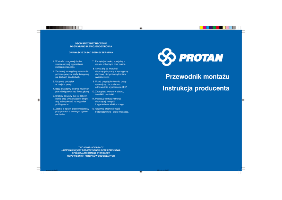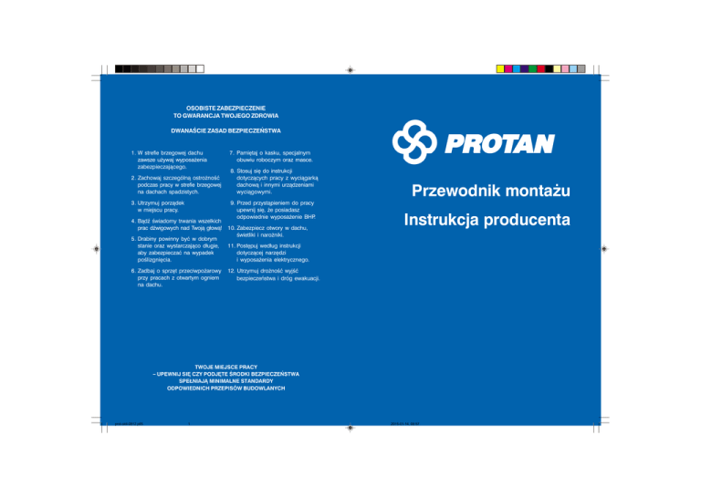 OSOBISTE ZABEZPIECZENIE TO GWARANCJA TWOJEGO ZDROWIA Krtań w refluksie DWANAŚCIE ZASAD BEZPIECZEŃSTWA 1. W strefie brzegowej dachu zawsze używaj wyposażenia zabezpieczającego. 2. Zachowaj szczególną ostrożność podczas pracy w strefie brzegowej na dachach spadzistych. 3. Utrzymuj porządek w miejscu pracy. 4. Bądź świadomy trwania wszelkich prac dźwigowych nad Twoją głową! 5. Drabiny powinny być w dobrym stanie oraz wystarczająco długie, aby zabezpieczać na wypadek poślizgnięcia. 6. Zadbaj o sprzęt przeciwpożarowy przy pracach z otwartym ogniem na dachu. 7. Pamiętaj o kasku, specjalnym obuwiu roboczym oraz masce. 8. Stosuj się do instrukcji dotyczących pracy z wyciągarką dachową i innymi urządzeniami wyciągowymi. 9. Przed przystąpieniem do pracy upewnij się, że posiadasz odpowiednie wyposażenie BHP. 10. Zabezpiecz otwory w dachu, świetliki i narożniki. przełykowo-gardłowo-krtaniowym Przewodnik montażu Instrukcja producenta 11. Postępuj według instrukcji dotyczącej narzędzi i wyposażenia elektrycznego. 12. Utrzymuj drożność wyjść bezpieczeństwa i dróg ewakuacji. TWOJE MIEJSCE PRACY – UPEWNIJ SIĘ CZY PODJĘTE ŚRODKI BEZPIECZEŃSTWA SPEŁNIAJĄ MINIMALNE STANDARDY ODPOWIEDNICH PRZEPISÓW BUDOWLANYCH prot-okll-0812.p65 1 2015-01-14, 08:57 Przewodnik montażu Instrukcja producenta Przewodnik montażu Informacje zawarte w niniejszym przewodniku uwzględniają obowiązujące przepisy i rozporządzenia. Protan AS nie ponosi odpowiedzialności za błędy popełnione przez osoby korzystające z niniejszego przewodnika. Protan AS zastrzega sobie prawo do dokonywania zmian i nie ponosi odpowiedzialności za zmiany w przepisach handlowych. Niniejszy przewodnik może być powielany wyłącznie za zgodą Protan AS. Wydano w grudniu 2007 Centrala: Protan AS P.O. Box 420 Brakeroya – N-3002 Drammen – Norwegia Tel. +47 32 22 16 00 Fax. +47 32 22 17 00 www.protan.com Biuro w Polsce: Protan Polska Sp. z o.o. ul. Radzymińska 129/2 Tel. 22 825 37 03 Fax. 22 825 68 26 [email protected] www.protan.pl 2 Instrukcja producenta Spis treści 1. Wstęp ..................................................................................................................................... 6 2. Podstawowe informacje techniczne na temat tworzyw sztucznych, z których wykonuje się membrany dachowe ..................................................................... 7 PVC ............................................................................................................................................ 7 TPO ............................................................................................................................................ 7 Tkaniny ....................................................................................................................................... 8 Jednowarstwowe membrany dachowe z PVC ........................................................................ 8 Pierwsza grupa główna – Membrany Protan SE, EX, EXG .................................................... 8 Druga grupa główna – Membrany Protan G, GG, GX i GT ..................................................... 9 Pozostałe produkty .................................................................................................................10 Odporność chemiczna membran dachowych Protan SE i Protan G ................................... 10 3. Systemy dachowe i warstwy paroszczelne ...................................................................... 11 Wymagania funkcjonalne ........................................................................................................11 Nachylenie dachów .................................................................................................................12 Stropodachy niewentylowane ................................................................................................. 12 Stropodachy wentylowane ...................................................................................................... 12 Wilgoć w budynkach ............................................................................................................... 13 Funkcje warstwy paroszczelnej ..............................................................................................13 4. Narzędzia i wyposażenie ................................................................................................... 16 Urządzenia ręczne do zgrzewania .......................................................................................... 16 Zgrzewarki automatyczne .......................................................................................................16 5. Izolacja ................................................................................................................................. 18 Materiały izolacyjne .................................................................................................................18 6. Warstwy rozdzielające, warstwy nieprzepuszczalne, warstwy poślizgowe i warstwy zabezpieczające ................................................................................................. 20 7. Kalkulacja ssania wiatru .................................................................................................... 22 Systemy dachowe ................................................................................................................... 22 Kalkulacja ssania wiatru ........................................................................................................... 22 Mocowanie mechaniczne produktów zbrojonych poliestrem ............................................... 27 Najważniejsze zasady mocowania mechanicznego/kalkulacji ssania wiatru ........................27 Balastowanie ............................................................................................................................29 Klejenie na całej powierzchn
