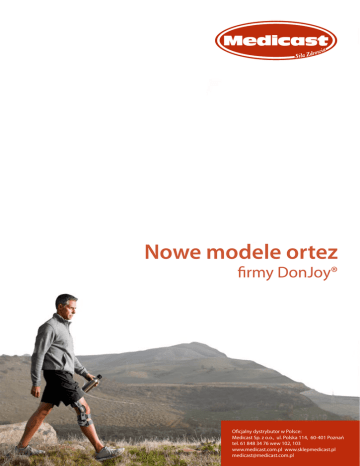 Nowe modele ortez firmy DonJoy® Oficjalny dystrybutor w Polsce: Medicast Sp. z o.o., ul. Polska 114, 60-401 Poznań tel. 61 848 34 76 wew 102, 103 www.medicast.com.pl www.sklepmedicast.pl [email protected] Orteza X-Act Rom Knee Nowa orteza pooperacyjna X-Act ROM Knee zapewnia komfort, możliwość dopasowania i funkcjonalność na nowym, nieznanym dotychczas poziomie, zapewniając idealne warunki w trakcie procesu rehabilitacji. Wskazania • Unieruchomienie lub ograniczenie zakresu ruchu po operacjach więzadeł i łąkotek. Wytrzymały aluminiowy zawias dla precyzyjnej stabilizacji • Nowy, przeprojektowany wytrzymały i wykonany z aluminium zawias, oferuje doskonałą ochronę i możliwość ograniczenia zakresu ruchów w przedziałach co 100. -- Ustawienia kąta zgięcia w zakresie od -100 do 900. -- Ustawienie kąta wyprostu w zakresie od -100 do 1200 . -- Możliwość szybkiej blokady ruchu Quick-Lock w położeniach od 00, 150 i 300. Technologia Tele-Fit dla idealnego dopasowania • Umożliwia niezależne dostosowanie pasków proksymalnego i dystalnego, co sprawia, że orteza X-Act ROM Knee pasuje na każdego pacjenta. • Pozwala na dopasowanie długości członów ortezy w przedziale od 48 do 63,5 cm. • Każdy z 4 teleskopów można przesuwać oddzielnie co ułatwia idealne ułożenie pasków z dala od miejsca pooperacyjnego. Specjalne klamry pozwalają na szybkie dopasowanie i zapięcie ortezy do nogi Klamry typu Quick-Clip dla łatwego zakładania • Orteza wyposażona jest w specjalne klamry, które ze względu na zastosowane rozwiązania pozwalają na założenie i idealne dopasowanie ortezy w bardzo krótkim czasie. Samoprzylepne wkładki piankowe dla większej stabilności ortezy • Unikalna, samoprzylepna pianka w wyściółce zapewnia lepszy kontakt pomiędzy nogą a ortezą zapobiegając przemieszczaniu się aparatu. Refundacja Kod środka Refundacja Wyszczególnienie Limit 9130.14 100% Dysfunkcja stała Aparat na goleń i udo szynowo - opaskowy 650 zł 9150.19 70% Dysfunkcja czasowa Oretza na goleń i udo szynowo - opaskowa 650 zł Orteza X-Act Rom Elbow X-Act ROM Elbow to uniwersalna, łatwa w zastosowaniu orteza, która dzięki teleskopowej budowie umożliwia wybór pomiędzy pełnym lub ograniczonym zakresem ruchów. Lekka, otwarta konstrukcja, mechanizm Telefit, teleskopy z elastycznego aluminium i wyściełane miękkie wkładki; te cechy pozwalają na optymalne dopasowanie i komfort w trakcie rehabilitacji. Wskazania • Zapewnienie stałego lub ograniczonego zakresu ruchów, niezbędnych w przypadku pourazowych lub pooperacyjnych procedurach leczenia stawu łokciowego. • Stabilizacja złamań. • Uszkodzenie bicepsa. • Urazy tkanek miękkich, łagodne do ciężkich. Łatwe w zakładaniu i dostosowujące się do kształtu bicepsa i przedramienia aluminiowe ściągacze pozwalają idealnie i w krótkim czasie dopasować ortezę do każdego pacjenta. Technologia Telefit pozwala na szybkie dostosowanie ruchomych ściągaczy do odpowiedniej długości przy wykorzystaniu gotowych nastawów. Specjalne klamry z technologią Snap-to-fit, pozwalają na błyskawiczne zapięcie ortezy. Klamry typu Quick-Clip dla łatwego zakładania • Orteza wyposażona jest w specjalne klamry, które ze względu na zastosowane rozwiązania pozwalają na założenie i idealne dopasowanie ortezy przy użyciu nawet jednej ręki. Technologia Tele-Fit dla idealnego dopasowania • Umożliwia niezależne dostosowanie pasków proksymalnego i dystalnego, co sprawia, że orteza X-Act ROM Elbow pasuje na każdego pacjenta. • Pozwala na dopasowanie długości członów ortezy w przedziale od 36 do 46 cm. • Każdy z 4 ściągaczy można regulować oddzielnie co ułatwia idealne dopasowanie bez efektu uciskania. Wytrzymały aluminiowy zawias Miękkie wkładki • Nowy, przeprojektowany wytrzymały i wykonany z aluminium zawias, pozwala na większą ochronę przy jednoczesnym obniżeniu masy ortezy. • Łatwe w obsłudze nastawy zegara zapewniają pełną kontrolę zakresów ruchu: -- Ustawienia kąta zgięcia w zakresie od -100 do 1200 w przedziałach co 100 -- Ustawienie kąta wyprostu w zakresie od -100 do 900 w przedziałach co 100 -- Możliwość szybkiej blokady ruchu Quick-Lock w zakresie od 00 do 900 w przedziałach co 150. Unikalne, formowane termicznie wkładki plastyczne o właściwościach antypoślizgowych, zapewniają maksymalny kontakt pomiędzy skórą i ortezą. Specjalne miękkie wkładki z technologią ComfortForm™ gwarantują komfort podczas długiej rehabilitacji. dla precyzyjnej stabilizacji dla maksymalnego komfortu Orteza X-Act ROM Elbow dostarczana jest w postaci rozłożonej, pozwalającej na szybkie i łatwe założenie. Unikalny, zapobiegający przemieszczaniu się ortezy materiał jest zintegrowany z kształtowanymi termicznie wkładkami. Refundacja Kod środka Refundacja Wyszczególnienie Limit 9140.06 100% Dysfunkcja stała Aparat redresujący staw łokciowy 800 zł 9160.05 70% Dysfunkcja czasowa Orteza redresująca staw łokciowy 800 zł Orteza Reaction™ Nowa orteza na kolano Reaction™ reprezentuje cakowicie nowe podejście do zagadnienia bólu w stawie kolanowym. Zaprojektowana zupełnie na nowo, z wykorzystaniem struktury kratownicy, stanowi niespotykaną alternatywę dla standardowych ortez. Wskazania • Ogólne bóle w stawie kolanowym wywołane: -- Chondromalacją rzepki. -- Chorobą Osgood-Schlattera. -- Osteoartrozą -- Tendinotopią ścięgna mięśnia czworogłowego - ”kolano skoczka”, więzadła rzepki. Zalety membran elastomerowych • elastomerowe membrany redukują ból poprzez rozłożenie obciążeń w kolanie • Podczas ruchu membrany rozciągają się by wrócić do swojego pierwotnego stanu co pozwala na pochłonięcie wstrząsów i zmniejszenie intensywności bólu w najbardziej obciążonych obszarach • Zdolność dopasowania, kompresja i elastyczność membran pozwalają na większą kontrolę neuromięśniową w trakcie