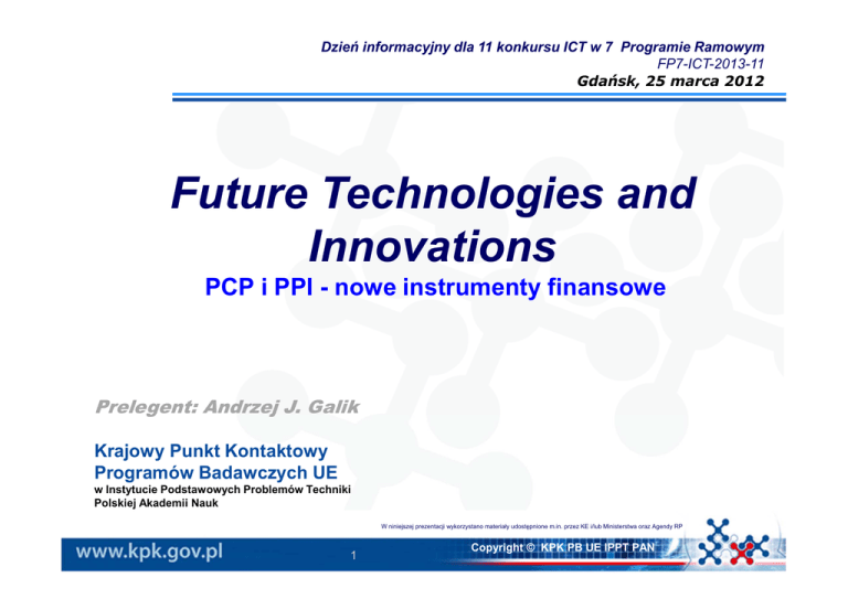 Dzień informacyjny dla 11 konkursu ICT w 7 Programie Ramowym FP7-ICT-2013-11 Gdańsk, 25 marca 2012 Future Technologies and Innovations PCP i PPI - nowe instrumenty finansowe Prelegent: Andrzej J. Galik Krajowy Punkt Kontaktowy Programów Badawczych UE w Instytucie Podstawowych Problemów Techniki Polskiej Akademii Nauk W niniejszej prezentacji wykorzystano materiały udostępnione m.in. przez KE i/lub Ministerstwa oraz Agendy RP 1 Copyright © KPK PB UE IPPT PAN Pre-Commercial Procurement (PCP) (WP2013 FP7 2 H2020) Copyright © KPK PB UE IPPT PAN Uzasadnienie celowości Sektor publiczny stoi w obliczu ważnych wyzwań. Przekształcenia sektora publicznego często wymagają innowacyjnych rozwiązań, oraz przyszłościowych strategii dot. zamówień publicznych, Jednakże w obszarze zamówień publicznych na B+R Europa pozostaje daleko w tyle za innymi częściami świata, Czasami rozwiązania są bliskie wprowadzenia na rynek i można myśleć o zamówieniu rozwiązania komercyjnego (PPI), czasem brak jest oczekiwanego rozwiązania i potrzebne jest przeprowadzenie prac B+R (PCP) 3 Opieka zdrowotna Zmiany klimatyczne Efektywność energetyczna Bezpieczeństwo Efektywność usług publicznych … Copyright © KPK PB UE IPPT PAN Uzasadnienie celowości Wydatki publiczne w Europie są wyższe niż w innych częściach świata (47% PKB EU-25) Ale 20 razy mniej jest wydawane na rzecz przygotowania sektora publicznego do przyszłych wyzwań: zamówienia publiczne na B+R w UE (~2,5 mld€) w porównaniu do USA (~50 mld€) 4 Copyright © KPK PB UE IPPT PAN PCP Pre-Commercial Procurement Kiedy – Wyzwanie wymaga działań B+R, aby opracować nowe rozwiązania. Problem jest jasno zdefiniowany, ale plusy / minusy kilku potencjalnych rozwiązań konkurencyjnych nie zostały jeszcze porównane / ocenione. A więc brak jest jeszcze gotowości do wdrożenia (PPI), Co – Sektor publiczny zamawia działania B+R aby pokierować rozwojem rozwiązań spełniających jego potrzeby, zgromadzić wiedzę o plusach / minusach rozwiązań alternatywnych, aby uniknąć uzależnienia od jednego dostawcy (tworzenie konkurencyjnej bazy dostawców) Jak – Sektor publiczny zamawia działania B+R od kilku dostawców jednocześnie (możliwość porównanie alternatywnych metod rozwiązania) w formie konkursu, oceniając postępy w punktach kluczowych etapów (projektowanie, prototypowanie, faza testowa). Ryzyka i korzyści związane z B + R (np. prawa własności intelektualnej) są współdzielone z dostawcami, aby zwiększyć zachęty dla późniejszej komercjalizacji. 5 Copyright © KPK PB UE IPPT PAN Współzależność PCP i PPI Inteligentne powiązanie PCP/PPI powoduje, że: – Cena/jakość produktu lepiej odpowiada oczekiwaniom SP – Lepsze rozwiązanie daje szersze możliwości komercjalizacji rezultatów prac B+R PCP – Zamówienia Przed-Komercyjne na B+R PPI - Zamówienia Publiczne na Innowacyjne Rozwiązania Dostawca A Dostawca B Dostawca B Dostawca C Dostawca C Dostawca D Dostawca B Dostawca D Dostawca(y) A,B,C,D i/lub X Dostawca D Faza 0 B+R kierowane ciekawością Faza 1 Opracowanie rozwiązania Faza 2 Przygotowanie prototypu 6 Faza 3 Prace nad ostateczną formą rozwiązań, testy wydajnościowe Faza 4 Komercjalizacja opracowanych rozwiązań. Upowszechnienie nowo opracowanych usług/produktów Copyright © KPK PB UE IPPT PAN Przykład projektu PCP w Zdrowiu www.nic.nhs.uk Potential £160m p.a. saving Potential £19m p.a. saving Potential £30m p.a. saving £4,000 per HCAI avoided Potential £17m p.a. saving 7 Potencjalna wartość dodana dla Służby zdrowia: NCI wspomagało powstanie innowacyjnych rozwiązań dla pacjentów co pozwoliło Słiżbie zdrowia zaoszczędzić kwotę 236 mln£. Wartość dla gospodarki: Wspomagane przez Służbę zdrowia NCI zdobyło znaczne fundusze na rozwój sfery produkcji (290 mln£). 7 Copyright © KPK PB UE IPPT PAN Wsparcie UE dla PCP - przykład Example: €4 Mio CP-CSA for PCP grant Max 30% (€1,2 Mio) for coordination costs - 100% funded Other €2,8 Mio = EC contribution to the ICT R&D procured through the joint PCP • If type 1 consortium (75% rate) -> Total PCP value will be € 3,73 Mio (ex VAT) • If type 2 consortium (50% rate) -> Total PCP value will be € 5,6 Mio (ex VAT) Consortium brings €0,93-2,8 Mio (+VAT): divided over e.g. 5 procurers in e.g. 3 year PCP -> each procurer invests ~ €100K/Y Comparing various solution approaches from different vendors, defragmenting market to get in long run also cheaper large volume purchases, sharing R&D cost/experience with other procurers & EC: joint PCP cheaper/procurer than buying R&D from one supplier on your own €1-2M per supplier to do the R&D work Phase 1: Solution design ~10-15% PCP budget ~100-250K/supplier ~4-10 suppliers P1 P5 P2 Preparation Joint PCP P4 P3 One Joint PCP call for tender Consortia of contracting authorities (CAs) P1->P5 (min 3) Phase 2: Prototyping ~30-40% PCP budget ~500-750K/supplier ~3-6 suppliers Supplier A Phase 3: Original development – operational testing ~50-60% PCP budget ~800K-2,3M/supplier ~2-4 suppliers Supplier B Supplier B Supplier C Supplier C Supplier D Supplier D Supplier B Supplier D Supplier E Supplier E Supplier E 8 Copyright © KPK PB UE IPPT PAN Uwarunkowania w konkursach PCP FP7-ICT-2013 Min 3 wzajemnie niezależne organizacje zamawiające z 3 krajów + inni partnerzy (z wyjątkiem dostawców) Część CSA grantu Defining joint specs + setting up/managing joint PCP procurement process Awareness Raising, experience sharing (incl. training for public purchasers), dissemination of results, contribution to standards/regulation to remove obstacles for introducing PCP innovations in the market Część CP grantu Execution of 1 joint cross-border PCP tender (addressing 1 jointly agreed challenge, all procurers in consortium sharing the costs to finance R&D together, one entity in consortium executing the PCP procurement) To explore possible alternative solut
