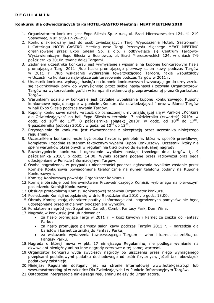 REGULAMIN Konkursu dla odwiedzających targi HOTEL-GASTRO Meeting i MEAT MEETING 2010 1. Organizatorem konkursu jest Expo Silesia Sp. z o.o., ul. Braci Mieroszewskich 124, 41-219 Sosnowiec, NIP: 959-17-26-258 2. Konkurs skierowany jest do osób zwiedzających Targi Wyposażenia Hoteli, Gastronomii i Cateringu HOTEL-GASTRO Meeting oraz Targi Przemysłu Mięsnego MEAT MEETING organizowane przez Expo Silesia Sp. z o.o. i odbywające się Centrum TargowoWystawienniczym Expo Silesia w Sosnowcu, ul. Braci Mieroszewskich 124, w dniach 7-9 października 2010r. zwane dalej Targami. 3. Zadaniem uczestnika konkursu jest wymyślenie i wpisanie na kuponie konkursowym hasła promującego Targi 2011 i/lub hasła promującego pierwszy salon kawy podczas Targów w 2011 r. i/lub wskazanie wydarzenia towarzyszącego Targom, jakie wzbudziłoby w Uczestniku konkursu największe zainteresowanie podczas Targów w 2011 r. 4. Uczestnik konkursu wpisując hasło/a na kuponie konkursowym i wrzucając go do urny zrzeka się jakichkolwiek praw do wymyślonego przez siebie hasła/haseł i zezwala Organizatorowi Targów na wykorzystanie go/ich w kampanii reklamowej przeprowadzonej przez Organizatora Targów. 5. Warunkiem udziału w konkursie jest czytelne wypełnianie kuponu konkursowego. Kupony konkursowe będą dostępne w punkcie „Konkurs dla odwiedzających” oraz w Biurze Targów w hali Expo Silesia podczas trwania Targów. 6. Kupony konkursowe należy wrzucić do oznaczonej urny znajdującej się w Punkcie „Konkurs dla Odwiedzających” na hali Expo Silesia w terminie: 7 października (czwartek) 2010r. w godz. od 1000 do 1700, 8 października (piątek) 2010r. w godz. od 1000 do 1700, 9 października (sobota) 2010r. w godz. od 1000 do 1200. 7. Przystąpienie do konkursu jest równoznaczne z akceptacją przez uczestnika niniejszego regulaminu. 8. Uczestnikiem konkursu może być osoba fizyczna, pełnoletnia, która w sposób prawidłowy, kompletny i zgodnie ze stanem faktycznym wypełni Kupon Konkursowy. Uczestnik, który nie spełni warunków określonych w regulaminie traci prawo do ewentualnej nagrody. 9. Rozstrzygniecie konkursu i ogłoszenie wyników nastąpi trzeciego dnia targów tj. 9 października 2010r. o godz. 14.00. Wyniki zostaną podane przez radiowęzeł oraz będą udostępnione w Punkcie Informacyjnym Targów. 10. Osoba nagrodzona, w przypadku nieobecności podczas ogłaszania wyników zostanie przez Komisję Konkursową powiadomiona telefonicznie na numer telefonu podany na Kuponie Konkursowym. 11. Komisję Konkursową powołuje Organizator konkursu. 12. Komisja obraduje pod kierownictwem Przewodniczącego Komisji, wybranego na pierwszym posiedzeniu Komisji Konkursowej. 13. Obsługę protokolarną Komisji Konkursowej zapewnia Organizator konkursu. 14. Posiedzenie Komisji odbędzie się w dniu 9 października 2010r. o godz. 13.00. 15. Obrady Komisji mają charakter poufny i informacje dot. nagrodzonych pomysłów nie będą udostępniane przed oficjalnym ogłoszeniem wyników. 16. Fundatorem nagród jest Segafredo Zanetti, Combi, Fantasy Park, Dom Wina. 17. Nagrodą w konkursie jest ufundowanie: za hasło promujące Targi w 2011 r. – kosz kawowy i karnet ze zniżką do Fantasy Parku; za hasło promujące pierwszy salon kawy podczas Targów 2011 r. – narzędzia dla baristów i karnet ze zniżką do Fantasy Parku; za wskazanie wydarzenia towarzyszącego Targom – wino i karnet ze zniżką do Fantasy Parku. 18. Nagroda o której mowa w pkt. 17 niniejszego Regulaminu, nie podlega wymianie na ekwiwalent pieniężny ani na inne nagrody rzeczowe o tej samej wartości. 19. Organizator konkursu wyda zwycięzcy nagrody po uiszczeniu przez niego wymaganego przepisami podatkowymi podatku dochodowego od osób fizycznych, jeżeli taki obowiązek podatkowy zaistnieje. 20. Niniejszy Regulamin dostępny jest na stronie internetowej www.hotel-gastro.pl lub www.meatmeeting.pl w zakładce Dla Zwiedzających i w Punkcie Informacyjnym Targów. 21. Ostateczna interpretacja niniejszego regulaminu należy do Organizatora.