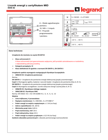 Licznik energii z certyfikatem MID 0046 82 A – Dioda sygnalizacyjna pomiaru: 0,1 Wh = 1 impuls B – Przyciski programowania i pomiaru Dane techniczne Urządzenie do montażu na szynie EN 60715 • • • Klasa ochronności II II klasa ochronności jest gwarantowana wyłącznie, jeśli produkt zainstalowano w rozdzielnicy z odpowiednią pokrywą przednią. Kategoria przepięcia: III Klasa dokładności B zgodnie z normami EN 50470-1, EN 50470-3 Urządzenie spełnia wymagania następujących Dyrektyw Europejskich: • 2004/22 EC: Urządzenia pomiarowe Normy: EN 50470-1 – Urządzenia do pomiarów energii elektrycznej (prądu przemiennego) Część 1: Wymagania ogólne, badania i warunki badań. Urządzenia do pomiarów (klas A, B i C). EN 50470-3 – Urządzenia do pomiarów energii elektrycznej (prądu przemiennego) Część 3: Wymagania szczegółowe. Liczniki statyczne energii czynnej (klas A, B i C) • 2006/95 EC: Dyrektywa niskiego napięcia • 2004/108 EC: Dyrektywa EMC Normy: EN 55022 +A1 + A2 i EN 61000-4-2, -3, -4, -5, -6, -12 Wejścia • Linia trójfazowa, 4 przewodowa • Napięcia znamionowe: 3 x 190/328…3 x 277/480 V~ • Pobór energii na wejściu napięciowym: ≤ 1 VA (na fazę) • Zakres częstotliwości: 50…60 Hz • Minimalny prąd, Imin: 0,05 A • Prąd znamionowy, Iref: 10 A • Prąd maksymalny, Imax: 63 A • Pobór energii na wejściu prądowym: ≤ 0,5 VA (na fazę) Zasilanie obwodów pomocniczych z obwodu pomiarowego (samozasilanie) Warunki środowiskowe • Miernik wewnętrzny • Stopień zanieczyszczenia 2 • Temperatura magazynowania: -25°C…60°C • Zakres temperatur pracy: -25°C…55°C • Temperatura znamionowa: 23°C ± 2°C • Wilgotność względna: 95% bez kondensacji • Stopień ochrony (EN 60529): IP51 przód, IP20 zaciski, (IP51, jeśli miernik jest montowany w rozdzielnicy IP51) • Maks. straty mocy: ≤ 5 W (przy bilansie termicznym rozdzielnicy) Wyjście impulsowe • Interfejs: Wyjście impulsowe SO zgodne z EN 62053-31, bezpotencjałowe przez transoptor • Maks. obciążenie styków: 115 V – 50 mA • Wyjście impulsowe dla energii czynnej lub biernej Wartość impulsu: 1 impuls = 1, 10, 100, 1000 Wh/varh Czas trwania impulsu: 50, 100, 150, 200, 300, 400, 500 ms Moc średnia Średni czas dla mocy wybierany z zakresu: 5, 8, 10, 15, 20, 30, 60 minut Miejsca do plombowania CodE CrC tIME Znaczenie Hasło Oprogramowanie CRC Czas integracji mocy średniej MD PMD PLSU PLSd Zapotrzebowanie na moc czynną Maks. zapotrzebowanie na moc czynną Wartość impulsu Czas trwania impulsu Podłączenie WEJŚCIE WYJŚCIE Programowanie Hasło = 1000 (niezmienne) Czas integracji mocy średniej Przyporządkowanie wyjścia impulsowego dla energii czynnej lub biernej (Wh/varh) Wartość impulsu Czas trwania impulsu Odczyt mierzonych wartości Energia czynna zmierzona na zaciskach wejściowych urządzenia (400 V, 63 A) Całkowita energia bierna Częściowa dodatnia energia czynna Częściowa dodatnia energia bierna Czas pracy licznika Etykieta danych Menu napięć i prądów Menu mocy Współczynnik mocy Aby wykonać Reset, przytrzymaj przycisk przez 2 sekundy Odczyt mierzonych wartości Czas integracji średniej mocy Prąd L1 Energia powiązana Prąd L2 Wartość impulsu (=1 impuls) Prąd L3 Napięcie fazowe L1-N Czas trwania impulsu Napięcie fazowe L2-N Oprogramowanie CRC Napięcie fazowe L3-N Napięcie międzyfazowe L1-L2 Napięcie międzyfazowe L2-L3 Napięcie międzyfazowe L2-L3 Odczyt mierzonych wartości Całkowita moc czynna Moc czynna fazy L1 Współczynnik mocy L = IND C = POJ Częstotliwość Moc czynna fazy L2 Moc czynna fazy L3 Całkowita moc bierna Moc bierna fazy L1 Moc bierna fazy L2 Moc bierna fazy L3 Całkowita moc pozorna Zapotrzebowanie na moc czynną Maksymalne zapotrzebowanie na moc czynną Wyświetlane błędy Błąd odczytu Symbol na wszystkich wyświetlanych ekranach oznacza niewiarygodny odczyt wartości mierzonych. Wyślij urządzenie do producenta Symbol oznacza błąd odczytu podczas wyzwalania nastaw. Wyłącz i ponownie włącz licznik, zweryfikuj dane nastaw. Naciśnij przycisk , odczytaj wartość energii i wyślij urządzenie do producenta. Błąd odczytu podczas wyzwalania stałych metrologicznych i kalibracyjnych. Wyłącz i ponownie włącz licznik. Jeśli problem pozostaje, wyślij urządzenie do producenta. Instrukcje bezpieczeństwa Ten produkt powinien być instalowany przez wykwalifikowany personel. Nieodpowiednia instalacja i użycie może grozić porażeniem lub pożarem. Przed przystąpieniem do instalacji przeczytaj instrukcję i zastosuj się do wymagań dotyczących miejsca montażu. Nie otwieraj, nie demontuj, nie modyfikuj urządzenia, jeśli takie czynności nie są określone w instrukcji. Wszystkie produkty Legranda powinny być naprawiane przez przeszkolony i zatwierdzony personel firmy Legrand. Jakiekolwiek nieautoryzowane otwarcie lub naprawa urządzenia całkowicie unieważnia wszystkie postanowienia gwarancyjne. Używaj akcesoriów wyłącznie firmy Legrand. Przed instalacją produktu porównaj tabliczkę znamionową z parametrami zasilania (napięcie, prąd, częstotliwość). Nie używaj ostrych narzędzi (takich jak śrubokręt) do wciskania przycisków na mierniku.