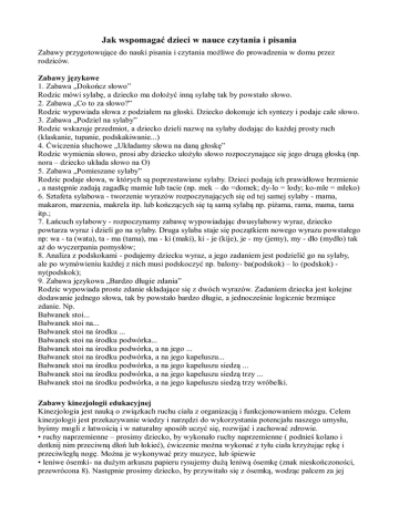 Jak wspomagać dzieci w nauce czytania i pisania Zabawy przygotowujące do nauki pisania i czytania możliwe do prowadzenia w domu przez rodziców. Zabawy językowe 1. Zabawa „Dokończ słowo” Rodzic mówi sylabę, a dziecko ma dołożyć inną sylabę tak by powstało słowo. 2. Zabawa „Co to za słowo?” Rodzic wypowiada słowa z podziałem na głoski. Dziecko dokonuje ich syntezy i podaje całe słowo. 3. Zabawa „Podziel na sylaby” Rodzic wskazuje przedmiot, a dziecko dzieli nazwę na sylaby dodając do każdej prosty ruch (klaskanie, tupanie, podskakiwanie...) 4. Ćwiczenia słuchowe „Układamy słowa na daną głoskę” Rodzic wymienia słowo, prosi aby dziecko ułożyło słowo rozpoczynające się jego drugą głoską (np. nora – dziecko układa słowo na O) 5. Zabawa „Pomieszane sylaby” Rodzic podaje słowa, w których są poprzestawiane sylaby. Dzieci podają ich prawidłowe brzmienie , a następnie zadają zagadkę mamie lub tacie (np. mek – do =domek; dy-lo = lody; ko-mle = mleko) 6. Sztafeta sylabowa - tworzenie wyrazów rozpoczynających się od tej samej sylaby - mama, makaron, marzenia, makrela itp. lub kończących się tą samą sylabą np. piżama, rama, mama, tama itp.; 7. Łańcuch sylabowy - rozpoczynamy zabawę wypowiadając dwusylabowy wyraz, dziecko powtarza wyraz i dzieli go na sylaby. Druga sylaba staje się początkiem nowego wyrazu powstałego np: wa - ta (wata), ta - ma (tama), ma - ki (maki), ki - je (kije), je - my (jemy), my - dło (mydło) tak aż do wyczerpania pomysłów; 8. Analiza z podskokami - podajemy dziecku wyraz, a jego zadaniem jest podzielić go na sylaby, ale po wymówieniu każdej z nich musi podskoczyć np. balony- ba(podskok) – lo (podskok) ny(podskok); 9. Zabawa językowa „Bardzo długie zdania” Rodzic wypowiada proste zdanie składające się z dwóch wyrazów. Zadaniem dziecka jest kolejne dodawanie jednego słowa, tak by powstało bardzo długie, a jednocześnie logicznie brzmiące zdanie. Np. Bałwanek stoi... Bałwanek stoi na... Bałwanek stoi na środku ... Bałwanek stoi na środku podwórka... Bałwanek stoi na środku podwórka, a na jego ... Bałwanek stoi na środku podwórka, a na jego kapeluszu... Bałwanek stoi na środku podwórka, a na jego kapeluszu siedzą ... Bałwanek stoi na środku podwórka, a na jego kapeluszu siedzą trzy ... Bałwanek stoi na środku podwórka, a na jego kapeluszu siedzą trzy wróbelki. Zabawy kinezjologii edukacyjnej Kinezjologia jest nauką o związkach ruchu ciała z organizacją i funkcjonowaniem mózgu. Celem kinezjologii jest przekazywanie wiedzy i narzędzi do wykorzystania potencjału naszego umysłu, byśmy mogli z łatwością i w naturalny sposób uczyć się, rozwijać i zachować zdrowie. • ruchy naprzemienne – prosimy dziecko, by wykonało ruchy naprzemienne ( podnieś kolano i dotknij nim przeciwną dłoń lub łokieć), ćwiczenie można wykonać z tyłu ciała krzyżując rękę i przeciwległą nogę. Można je wykonywać przy muzyce, lub śpiewie • leniwe ósemki- na dużym arkuszu papieru rysujemy dużą leniwą ósemkę (znak nieskończoności, przewrócona 8). Następnie prosimy dziecko, by przywitało się z ósemką, wodząc palcem za jej konturami. Dziecko może tez same rysować leniwe ósemki rożnymi kolorami, rysować je w powietrzu rękami, nogami – raz jedną, raz drugą. • kołyska usiądź na podłodze, odchyl się do tylu, ręce ugięte w łokciach, podeprzyj się na przedramionach. Wykonuj ruchy zgiętymi w kolanach nogami z jednej strony na drugą • oddychanie brzuszkiem połóż ręce na brzuchu, weź wdech przez nos i rozpocznij długi wydech, wypuszczając powietrze krótkimi dmuchnięciami przez lekko otwarte usta. Oddychaj powoli, nadmuchując brzuch, jak balon. • zginanie stopy usiądź, zegnij nogę w kolanie i połóż ją na kolanie drugiej nogi. Chwyć przyczepy początkowe i końcowe mięsni łydki i trzymaj je. Powoli poruszaj stopą zginaj ją i prostuj. Powtórz to samo drugą nogą. Zabawy literkami 1. Zabawa „Czyje to imię?” – przygotowanie kartoników z imionami najbliższych osób (mama, tata, brat, siostra, babcia, kolega itp.) wyszukanie imion podanych przez rodzica. 2. Zabawa „Litery w imionach” - przygotowanie kartoników z imionami najbliższych osób (mama, tata, brat, siostra, babcia, kolega itp.) wyszukanie w nich liter podanych przez rodzica. Np. wyszukaj imię na literkę M, na literkę T, podaj karteczkę z imieniem, w którym są dwie literki „a”, podaj karteczkę z imieniem, które kończy się na „k” itp. 3. Zabawa „ Podpisz przedmioty” – przygotowanie kartoników z nazwami przedmiotów z najbliższego otoczenia (stół, okno, łóżko, miś, lalka, auto, klocki itp.). wspólne z dzieckiem odszukanie przedmiotów i „podpisanie”. W kolejnych zabawach dziecko samo „podpisuje” wybrane przez rodzica przedmioty 4. Zabawa „Moje imię” – ułożenie imion z liter znajdujących się na małych kartkach 5. Zabawa „Takie same wyrazy” – zadaniem dziecka jest odnalezienie dwóch takich samych wyrazów (imiona, nazwy przedmiotów) 6. Zabawa „Układanie nazw obrazków”- dziecko układa wyraz z pojedynczych liter. Na początek można dać wzór w postaci takiego samego wyrazu. UWAGI DLA RODZICÓW 1. Litera jest znakiem graficznym, a głoska jej odpowiednikiem słuchowym. Litery widzimy i piszemy, głoski słyszymy i wymawiamy (liter w wyrazie może być więcej niż głosek, np.: sz, cz, dz). 2. Spółgłoski należy wymawiać w miarę możliwości bez przygłosu w postaci „y” który w późniejszym okresie może utrudniać dziecku naukę czytania. 3. Przy wyodrębnianiu pierwszej i ostatniej głoski w wyrazie najlepiej jest zaczynać od wyrazów rozpoczynających i kończących się samogłoskami. 4. Stopień trudności materiału językowego do analizy i syntezy głoskowej i sylabowej: • jednosylabowe wyrazy 2-głoskowe typu ul, • jednosylabowe