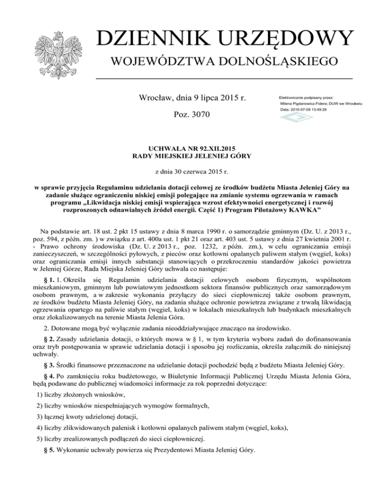 DZIENNIK URZĘDOWY WOJEWÓDZTWA DOLNOŚLĄSKIEGO Wrocław, dnia 9 lipca 2015 r. Elektronicznie podpisany przez: Milena Pigdanowicz-Fidera; DUW we Wrocławiu Poz. 3070 Data: 2015-07-09 13:49:28 UCHWAŁA NR 92.XII.2015 RADY MIEJSKIEJ JELENIEJ GÓRY z dnia 30 czerwca 2015 r. w sprawie przyjęcia Regulaminu udzielania dotacji celowej ze środków budżetu Miasta Jeleniej Góry na zadanie służące ograniczeniu niskiej emisji polegające na zmianie systemu ogrzewania w ramach programu „Likwidacja niskiej emisji wspierająca wzrost efektywności energetycznej i rozwój rozproszonych odnawialnych źródeł energii. Część 1) Program Pilotażowy KAWKA” Na podstawie art. 18 ust. 2 pkt 15 ustawy z dnia 8 marca 1990 r. o samorządzie gminnym (Dz. U. z 2013 r., poz. 594, z późn. zm. ) w związku z art. 400a ust. 1 pkt 21 oraz art. 403 ust. 5 ustawy z dnia 27 kwietnia 2001 r. - Prawo ochrony środowiska (Dz. U. z 2013 r., poz. 1232, z późn. zm.), w celu ograniczania emisji zanieczyszczeń, w szczególności pyłowych, z pieców oraz kotłowni opalanych paliwem stałym (węgiel, koks) oraz ograniczania emisji innych substancji stanowiących o przekroczeniu standardów jakości powietrza w Jeleniej Górze, Rada Miejska Jeleniej Góry uchwala co następuje: § 1. 1. Określa się Regulamin udzielania dotacji celowych osobom fizycznym, wspólnotom mieszkaniowym, gminnym lub powiatowym jednostkom sektora finansów publicznych oraz samorządowym osobom prawnym, a w zakresie wykonania przyłączy do sieci ciepłowniczej także osobom prawnym, ze środków budżetu Miasta Jeleniej Góry, na zadania służące ochronie powietrza związane z trwałą likwidacją ogrzewania opartego na paliwie stałym (węgiel, koks) w lokalach mieszkalnych lub budynkach mieszkalnych oraz zlokalizowanych na terenie Miasta Jelenia Góra. 2. Dotowane mogą być wyłącznie zadania nieoddziaływujące znacząco na środowisko. § 2. Zasady udzielania dotacji, o których mowa w § 1, w tym kryteria wyboru zadań do dofinansowania oraz tryb postępowania w sprawie udzielania dotacji i sposobu jej rozliczania, określa załącznik do niniejszej uchwały. § 3. Środki finansowe przeznaczone na udzielanie dotacji pochodzić będą z budżetu Miasta Jeleniej Góry. § 4. Po zamknięciu roku budżetowego, w Biuletynie Informacji Publicznej Urzędu Miasta Jelenia Góra, będą podawane do publicznej wiadomości informacje za rok poprzedni dotyczące: 1) liczby złożonych wniosków, 2) liczby wniosków niespełniających wymogów formalnych, 3) łącznej kwoty udzielonej dotacji, 4) liczby zlikwidowanych palenisk i kotłowni opalanych paliwem stałym (węgiel, koks), 5) liczby zrealizowanych podłączeń do sieci ciepłowniczej. § 5. Wykonanie uchwały powierza się Prezydentowi Miasta Jeleniej Góry. Dziennik Urzędowy Województwa Dolnośląskiego –2– Poz. 3070 § 6. 1. Traci moc uchwała Nr 560.LX.2014 Rady Miejskiej Jeleniej Góry z dnia 30 września 2014 r. w sprawie przyjęcia Regulaminu udzielania dotacji celowej ze środków budżetu Miasta Jeleniej Góry na zadanie służące ograniczeniu niskiej emisji polegające na zmianie systemu ogrzewania w ramach programu „Likwidacja niskiej emisji wspierająca wzrost efektywności energetycznej i rozwój rozproszonych odnawialnych źródeł. Część I Program Pilotażowy KAWKA”. 2. W sprawach zakończonych zawarciem umów o udzielenie dotacji w terminie przed wejściem w życie niniejszej uchwały stosuje się przepisy uchwały nr 560.LX.2014 Rady Miejskiej Jeleniej Góry z dnia 30 września 2014 r. § 7. Uchwała wchodzi w życie po upływie 14 dni od dnia ogłoszenia w Dzienniku Urzędowym Województwa Dolnośląskiego. Przewodniczący Rady Miejskiej: L. Wrotniewski Dziennik Urzędowy Województwa Dolnośląskiego –3– Poz. 3070 Załącznik do Uchwały Nr 92.XII.2015 Rady Miejskiej Jeleniej Góry z dnia 30 czerwca 2015 r. Regulamin udzielania dotacji celowej ze środków budżetu Miasta Jeleniej Góry na zadanie służące ograniczeniu niskiej emisji polegające na zmianie systemu ogrzewania w ramach programu „Likwidacja niskiej emisji wspierająca wzrost efektywności energetycznej i rozwój rozproszonych odnawialnych źródeł energii Część I.) Program Pilotażowy KAWKA” Rozdział 1. Postanowienia ogólne 1. Regulamin określa zasady udzielania dotacji celowej ze środków budżetu Miasta Jeleniej Góry, zwanej dalej dotacją, na realizację zadań z zakresu ochrony środowiska obejmujących: 1) trwałą zmianę systemu ogrzewania opartego na paliwie stałym (węgiel, koks), w lokalach mieszkalnych lub w budynkach mieszkalnych, na ekologiczne w postaci: a) podłączenia do sieci ciepłowniczej, b) ogrzewania gazowego, c) ogrzewania elektrycznego, 2) podłączenie ciepłej wody użytkowej związane z trwałą zmianą systemu ogrzewania na ekologiczne, 3) termomodernizację budynków mieszkalnych. 2. Likwidacja pieca kaflowego może nastąpić poprzez trwałe usunięcie połączenia pieca z przewodem kominowym, poświadczone opinią kominiarską. 3. Ilekroć w niniejszym Regulaminie jest mowa o: 1) zadaniu – należy przez to rozumieć działania polegające na likwidacji lokalnych źródeł ciepła, tj.: indywidualnych kotłowni lub palenisk opalanych paliwem stałym (węgiel/koks), kotłowni zasilających kilka budynków mieszkalnych oraz kotłowni lokalnych i ich zastąpienie przez źródło o wyższej niż dotychczas sprawności wytwarzania ciepła, tj.: instalacji gazowej lub elektrycznej centralnego ogrzewania i centralnej wody użytkowej lub podłączenie obiektów do miejskiej sieci ciepłowniczej, 2) dotowanym – należy przez to rozumieć ostatecznego odbiorcę korzyści, który uzyska dotację z tytułu wykonania zadania na podstawie umowy z dotującym, 3) dotującym – należy przez to rozumieć Miasto Jelenia Góra, 4) wykazie zadań – należy przez to rozumieć uzupełnianą w porozumieniu z Wojewódzkim Funduszem Ochrony Środowiska i 
