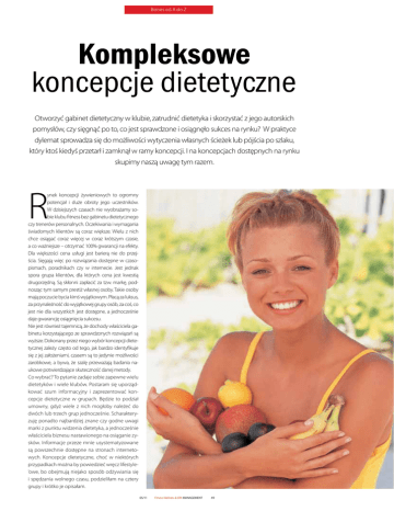 Biznes od A do Z Kompleksowe koncepcje dietetyczne Otworzyć gabinet dietetyczny w klubie, zatrudnić dietetyka i skorzystać z jego autorskich pomysłów, czy sięgnąć po to, co jest sprawdzone i osiągnęło sukces na rynku? W praktyce dylemat sprowadza się do możliwości wytyczenia własnych ścieżek lub pójścia po szlaku, który ktoś kiedyś przetarł i zamknął w ramy koncepcji. I na koncepcjach dostępnych na rynku skupimy naszą uwagę tym razem. R ynek koncepcji żywieniowych to ogromny potencjał i duże obroty jego uczestników. W dzisiejszych czasach nie wyobrażamy sobie klubu fitness bez gabinetu dietetycznego czy trenerów personalnych. Oczekiwania i wymagania świadomych klientów są coraz większe. Wielu z nich chce osiągać coraz więcej w coraz krótszym czasie, a co ważniejsze – otrzymać 100% gwarancji na efekty. Dla większości cena usługi jest barierą nie do przejścia. Sięgają więc po rozwiązania dostępne w czasopismach, poradnikach czy w internecie. Jest jednak spora grupa klientów, dla których cena jest kwestią drugorzędną. Są skłonni zapłacić za tzw. markę, podnosząc tym samym prestiż własnej osoby. Takie osoby mają poczucie bycia kimś wyjątkowym. Płacą za luksus, za przynależność do wyjątkowej grupy osób, za coś, co jest nie dla wszystkich jest dostępne, a jednocześnie daje gwarancję osiągnięcia sukcesu. Nie jest również tajemnicą, że dochody właściciela gabinetu korzystającego ze sprawdzonych rozwiązań są wyższe. Dokonany przez niego wybór koncepcji dietetycznej zależy często od tego, jak bardzo identyfikuje się z jej założeniami, czasem są to jedynie możliwości zarobkowe, a bywa, że szalę przeważają badania naukowe potwierdzające skuteczność danej metody. Co wybrać? To pytanie zadaje sobie zapewne wielu dietetyków i wiele klubów. Postaram się uporządkować szum informacyjny i zaprezentować koncepcje dietetyczne w grupach. Będzie to podział umowny, gdyż wiele z nich mogłoby należeć do dwóch lub trzech grup jednocześnie. Scharakteryzuję ponadto najbardziej znane czy godne uwagi marki z punktu widzenia dietetyka, a jednocześnie właściciela biznesu nastawionego na osiąganie zysków. Informacje przeze mnie usystematyzowane są powszechnie dostępne na stronach internetowych. Koncepcje dietetyczne, choć w niektórych przypadkach można by powiedzieć wręcz lifestyle’owe, bo obejmują niejako sposób odżywiania się i spędzania wolnego czasu, podzieliłam na cztery grupy i krótko je opisałam. 05/11 Fitness Wellness & SPA MANAGEMENT 49 Biznes od A do Z Licencja, czyli pakiet z zyskiem Na czym polega? Właściciel gabinetu wnosi opłatę licencyjną jednorazową, a następnie roczne lub miesięczne składki. Musi wziąć udział w seminarium szkoleniowym/licencyjnym, na którym pozna zasady współpracy, zasady żywieniowe i/lub treningowe, na których opiera się dana koncepcja. Każda z koncepcji oferuje inny system szkoleń. Niektóre wymagają regularnego uczestnictwa w seminariach doszkalających, inne są mniej restrykcyjne. Ta metoda współpracy wymaga względnie małego zaangażowania czasowego właściciela gabinetu, natomiast profity finansowe, które obiecują licencjodawcy, są dość wysokie. Właściciel gabinetu dietetycznego nie bierze praktycznie udziału w procesie przygotowywania diety. Jego zadaniem jest wspieranie swoich podopiecznych, motywowane, ustalanie planów treningowych oraz dokonywanie drobnych korekt w diecie wg wskazówek licencjodawcy. Gabinet korzystający z takiej koncepcji, kupuje gotowe pakiety lub diety indywidualnie przygotowane dla klienta i odsprzedaje je swoim klientom z zyskiem. Tutaj chciałabym zwrócić uwagę na trzy firmy. Wszystkie osiągnęły ogromy sukces, są firmami międzynarodowymi, odchudziły na całym świecie ponad 1,5 mln osób. Każda z tych firm może się pochwalić badaniami naukowymi dowodzącymi skuteczności swojej metody. Nazwy tych programów są zastrzeżone i prawnie chronione. Jedyna koncepcja dostępna obecnie w Polsce. Twórcą jej jest lekarz i specjalista w zakresie przemiany materii i medycyny żywienia dr Wolf Funfack. W wyniku długoletniej pracy badawczej w dziedzinie odżywiania, nadwagi i związanych z nimi chorób przemiany materii, wspólnie z mgr. inż. technologii żywienia Sylvią Bürkle w 2001 roku opracował program żywienia i przemiany materii, który zaowocował założeniem rok później Metabolic Balance GmbH z siedzibą w Isen. W ciągu 10 lat program ten został sprzedany na zasadzie licencji do 30 krajów na całym świecie. Metabolic Balance nie jest dietą, lecz kompleksowym programem żywienia i regulacji przemiany materii. Wychodzi z założenia, że każdy organizm jest w stanie samodzielnie wyprodukować wystarczającą ilość hormonów, niezbędnych dla swojego metabolizmu. Na podstawie własnych informacji klientów (wywiad wstępny prowadzony przez dietetyka) oraz analizy krwi, obejmującej około 40 wskaźników, sporządzany jest indywidualny plan żywienia. Służy on przywróceniu przemiany materii do stanu jej naturalnej równowagi, co w niektórych przypadkach może oznaczać schudnięcie, w innych przyrost wagi (jeśli mamy do czynienia z niedowagą), a jeszcze w innej sytuacji nie nastąpi zmiana wagi, lecz zdecydowana poprawa jakości życia. W jaki sposób można przystąpić do programu? Przede wszystkim Metabolic Balance jest ofertą dla dietetyków, lekarzy oraz diabetologów. Każda osoba chcąca zostać opiekunem, czyli osobą posiadającą licencję Metabolic Balance, musi wziąć udział w seminarium licencyjnym. Po zaliczeniu czterodniowego szkolenia oraz zdaniu egzaminu może rozpocząć współpracę. Instytut Hochrhein w grudniu 2010 roku opublikował badania dotyczące skuteczności programu przemiany materii Metabolic Balance. Studium zostało przeprowadzone we współpracy z Instytutem Zarządzania Jakością i Medycyny Społecznej K