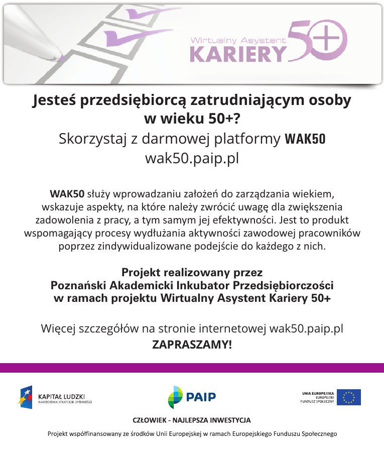 Jesteœ przedsiêbiorc¹ zatrudniaj¹cym osoby w wieku 50+? Skorzystaj z darmowej platformy WAK50 wak50.paip.pl WAK50 s³u¿y wprowadzaniu za³o¿eñ do zarz¹dzania wiekiem, wskazuje aspekty, na które nale¿y zwróciæ uwagê dla zwiêkszenia zadowolenia z pracy, a tym samym jej efektywnoœci. Jest to produkt wspomagaj¹cy procesy wyd³u¿ania aktywnoœci zawodowej pracowników poprzez zindywidualizowane podejœcie do ka¿dego z nich. Projekt realizowany przez Poznañski Akademicki Inkubator Przedsiêbiorczoœci w ramach projektu Wirtualny Asystent Kariery 50+ Wiêcej szczegó³ów na stronie internetowej wak50.paip.pl ZAPRASZAMY!