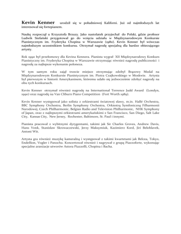Kevin Kenner urodził się w południowej Kaliforni. Już od najmłodszych lat interesował się fortepianem. Naukę rozpoczął u Krzysztofa Brzuzy. Jako nastolatek przyjechał do Polski, gdzie profesor Ludwik Stefański przygotował go do wzięcia udziału w Międzynarodowym Konkursie Pianistycznym im. Fryderyka Chopina w Warszawie (1980). Kevin Kenner był wówczas najmłodszym uczestnikiem konkursu. Otrzymał nagrodę specjalną dla bardzo obiecującego artysty. Rok 1990 był przełomowy dla Kevina Kennera. Pianista wygrał XII Międzynarodowy Konkurs Pianistyczny im. Fryderyka Chopina w Warszawie otrzymując również nagrodę publiczności i nagrodę za najlepsze wykonanie poloneza. W tym samym roku zajął trzecie miejsce otrzymując zdobył Brązowy Medal na Międzynarodowym Konkursie Pianistycznym im. Piotra Czajkowskiego w Moskwie. Artysta był pierwszym w historii Amerykaninem, któremu udało się jednocześnie zdobyć nagrody na obu tych konkursach. Kevin Kenner otrzymał również nagrodę na International Terrence Judd Award (Londyn, 1990) oraz nagrodę na Van Cliburn Piano Competition (Fort Worth 1989). Kevin Kenner występował jako solista z orkiestrami światowej sławy, m.in. Hallé Orchestra, BBC Symphony Orchestra, Berlin Symphony Orchestra, Orkiestrą Symfoniczną Filharmonii Narodowej, Czech Philharmonic, Belgian Radio and Television Philharmonic, NHK Symphony of Japan, oraz z najlepszymi orkiestrami amerykańskimi z San Francisco, San Diego, Salt Lake City, Kansas City, New Jersey, Rochester, Baltimore, St. Paul i innymi. Pianista pracował z wybitnymi dyrygentami, takimi jak Sir Charles Groves, Andrew Davis, Hans Vonk, Stanislaw Skrowaczewski, Jerzy Maksymiuk, Kazimierz Kord, Jiri Belohlavek, Antoni Wit. Artysta gra również muzykę kameralną i występował z takimi kwartetami jak Belcea, Tokyo, Endellion, Vogler i Panocha. Koncertował również i nagrywał z grupą Piazzoforte, wykonując specjalne aranżacje utworów Astora Piazzolli, Chopina i Bacha.