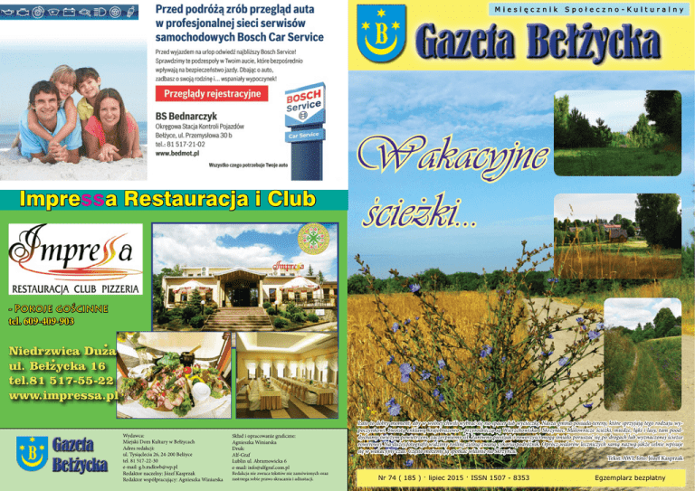 Miesięcznik Impressa Restauracja i Club Społeczno-Kulturalny Wakacyjne sciezki... ′ ● - Pokoje gościnne tel. 609-409-903 • Niedrzwica Duza • ul. Bełzycka 16 tel.81 517-55-22 www.impressa.pl Wydawca: Miejski Dom Kultury w Bełżycach Adres redakcji: ul. Tysiąclecia 26, 24-200 Bełżyce tel. 81 517-22-30 e-mail: [email protected] Redaktor naczelny: Józef Kasprzak Redaktor współpracujący: Agnieszka Winiarska Skład i opracowanie graficzne: Agnieszka Winiarska Druk: Alf-Graf Lublin ul. Abramowicka 6 e-mail: [email protected] Redakcja nie zwraca tekstów nie zamówionych oraz zastrzega sobie prawo skracania i adiustacji. Lato to dobry moment, aby w wolnej chwili wybrać się na spacer lub wycieczkę. Nasza gmina posiada tereny, które sprzyjają tego rodzaju wypoczynkowi. Swoistą enklawą krajobrazowo - przyrodniczą są Wierzchowiska i Skrzyniec. Malownicze ścieżki, miedze, łąki i lasy, tam pooddychamy świeżym powietrzem, zaczerpniemy sił. Zarówno piesi jak i rowerzyści mogą śmiało poruszać się po drogach lub wyznaczonej ścieżce rowerowej. Na dużej fotografii widzimy roślinę zielną zwaną cykoria podróżnik. Oprócz walorów leczniczych samą nazwą jakże celnie wpisuje się w wakacyjny czas. Często możemy ją spotkać właśnie na Skrzyńcu. Tekst: AWI, foto: Józef Kasprzak Nr 74 ( 185 ) · lipiec 2015 · ISSN 1507 - 8353 Egzemplarz bezpłatny Burmistrz nagrodził wybitnie uzdolnionych Foto: Agnieszka Winiarska, czytaj str.3 Uniwersytet Dziecięcy UMCS od września w Bełżycach Oficjalne logo 600-lecia Bełżyc . Zawody Wedkarskie z okazji Dni Belzyc ¯ , → Więcej na ten temat piszemy na str.2 Foto: Marcin Markowski 1 Gazeta Bełżycka Rada Miejska uchwaliła Uchwała Nr IX/44/15 Rady Miejskiej w Bełżycach z dnia 17 czerwca 2015 roku w sprawie rozpatrzenia i zatwierdzenia sprawozdania finansowego wraz ze sprawozdaniem Burmistrza Bełżyc z wykonania budżetu za 2014r. i udzielenia absolutorium Burmistrzowi Bełżyc z tytułu wykonania budżetu za 2014 rok. Po rozpatrzeniu przedłożonego przez Burmistrza Bełżyc sprawozdania finansowego wraz ze sprawozdaniem z wykonania budżetu za 2014 rok zatwierdza się sprawozdanie finansowe wraz ze sprawozdaniem z wykonania budżetu za 2014 rok. Po zapoznaniu się ze - sprawozdaniem z wykonania budżetu za 2014 rok, - sprawozdaniem finansowym, - opiniami Regionalnej Izby Obrachunkowej o: sprawozdaniu z wykonania budżetu za 2014 r. oraz o wniosku Komisji Rewizyjnej o udzielenie absolutorium, - informacją o stanie mienia jednostki samorządu terytorialnego, oraz stanowiskiem Komisji Rewizyjnej Rady Miejskiej udziela się absolutorium Burmistrzowi Bełżyc z tytułu wykonania budżetu za 2014 rok. Za podjęciem uchwały głosowało czternastu, obecnych na sesji, radnych. ▪ Uchwalony przez Radę Miejską budżet, po uwzględnieniu zmian w ciągu roku, przewidywał realizację dochodów w kwocie 37 989 797,89zł. Dochody wykonano w kwocie 36 648 339,58zł., co stanowiło 96,47% planu, w tym planowane dochody własne na kwotę 32 462 521,84 zł., wykonanie w kwocie 31 321 381,34 zł., co stanowi 97% planu. ▪ Uchwalony przez Radę Miejską plan wydatków budżetowych po zmianach dokonanych w ciągu roku przewidywał kwotę 39 689 797,89 zł. Wydatki zrealizowano w kwocie 38 642 918,79 zł., co stanowi 97,36% ogółu planu. ▪ Na realizację inwestycji zaplanowano w budżecie Gminy kwotę 6 063 547,17zł., co stanowiło 16% ogółu planu wydatków. Wydatkowano kwotę 5 953 090,36 zł., co stanowi 98,18% planowanych wydatków na inwestycje. ▪ Na wydatki bieżące budżetu zaplanowano kwotę 33 626 250,72 zł., zrealizowano wydatki w kwocie 32 689 828,43 zł., co stanowi 98% ogółu planu. Z czego 27 362 870,19 zł. to wydatki na zadania własne, a 5 326 958,24 zł. wydatki na zadania zlecone. ▪ Deficyt budżetu Gminy na koniec 2014 r. roku wyniósł kwotę 1 994 579,21 zł. Źródło sfinansowania deficytu budżetu stanowiły Wydanie internetowe gazety do pobrania na stronie www.mdk-belzyce.pl przychody z emisji obligacji i wolne środki. Budżet Gminy zamknął się za 2014 rok wynikiem ujemnym w wysokości 14 254 261,68 zł. ▪ Ze środków budżetu Gminy w 2014 roku spłacono w całości pożyczkę zaciągniętą w WFOŚiGW w kwocie 75 000 zł. oraz wykupiono obligacje na kwotę 400 000 zł. Umorzona została Gminie pożyczka w wysokości 25 000 zł., przypadająca do spłaty w 2014 roku. ▪ Zadłużenie Gminy na koniec 2014 roku z tytułu zaciągniętych kredytów i pożyczek wyniosło kwotę 17 100 000 zł. z terminem spłaty w 2016 roku i latach następnych. ▪ Gmina na 31 grudnia 2014 r. nie posiadała wymagalnych zobowiązań z terminem płatności do 31 grudnia 2014 r. ▪ Skutki obniżenia górnych stawek podatków za 2014 r. rok wyniosły 2 436 174,63zł. Skutki udzielonych ulg, umorzeń, zwolnień z podatków za 2014 rok wyniosły 1 134 900,78zł. Łącznie stanowi to kwotę 3 571 075,41 zł., tj. 10% zrealizowanych dochodów. ▪ Regionalna Izba Obrachunkowa w Lublinie wyraziła pozytywną opinię o sprawozdaniu z wykonania budżetu. Gazeta Bełżycka - Miesięcznik Samorządowy 3 2 Gazeta Bełżycka Gazeta Bełżycka Mamy oficjalne logo 600-lecia Bełżyc W związku ze zbliżającymi się obchodami 600-lecia Bełżyc Burmistrz Bełżyc ogłosił konkurs na opracowanie projektu graficznego logo z okazji 600-lecia nadania prawa miejskiego Bełżycom, które stanie się znakiem rozpoznawczym obchodów jubileuszu przypadającego na 2017 rok. Projekty konkursowe, z których jeden startujący mógł zgłosić maksymalnie dwa, przyjmowano zgodnie z regulaminem do 4 maja 2015 roku. Decyzją Komisji Konkursowej z dnia 14 maja 2015 r. pani Małgorzata Biernacka została laureatką konkursu na opracowanie tegoż projektu graficznego. Zwycięska grafika została oficjalnie zaprezentowana i nagrodzona na tegorocznych Dniach Bełżyc. Od tego momentu będzie wykorzystywana do celów marketingowych 
