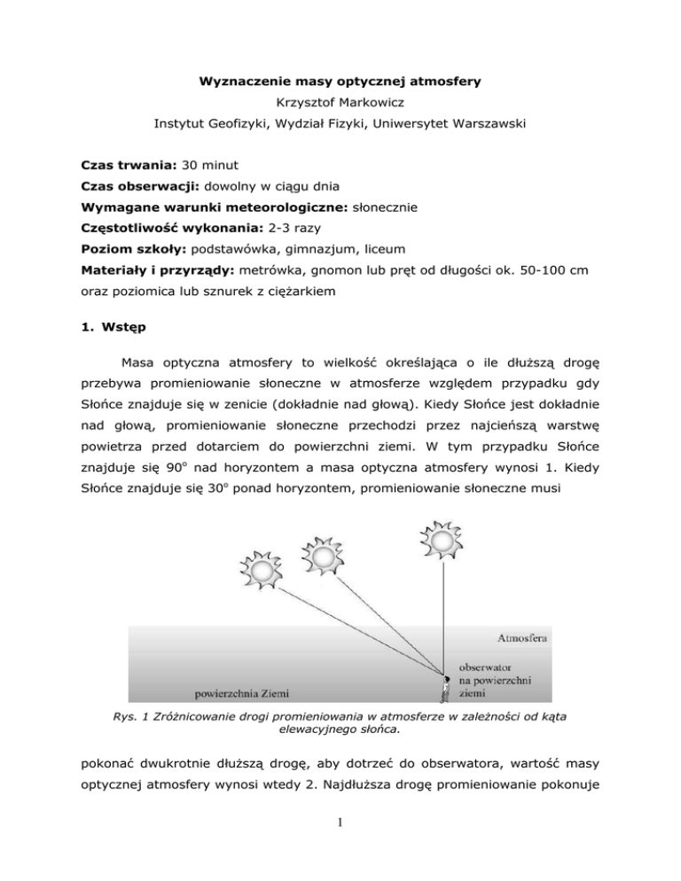 Wyznaczenie masy optycznej atmosfery Krzysztof Markowicz Instytut Geofizyki, Wydział Fizyki, Uniwersytet Warszawski Czas trwania: 30 minut Czas obserwacji: dowolny w ciągu dnia Wymagane warunki meteorologiczne: słonecznie Częstotliwość wykonania: 2-3 razy Poziom szkoły: podstawówka, gimnazjum, liceum Materiały i przyrządy: metrówka, gnomon lub pręt od długości ok. 50-100 cm oraz poziomica lub sznurek z ciężarkiem 1. Wstęp Masa optyczna atmosfery to wielkość określająca o ile dłuższą drogę przebywa promieniowanie słoneczne w atmosferze względem przypadku gdy Słońce znajduje się w zenicie (dokładnie nad głową). Kiedy Słońce jest dokładnie nad głową, promieniowanie słoneczne przechodzi przez najcieńszą warstwę powietrza przed dotarciem do powierzchni ziemi. W tym przypadku Słońce znajduje się 90o nad horyzontem a masa optyczna atmosfery wynosi 1. Kiedy Słońce znajduje się 30o ponad horyzontem, promieniowanie słoneczne musi Rys. 1 Zróżnicowanie drogi promieniowania w atmosferze w zależności od kąta elewacyjnego słońca. pokonać dwukrotnie dłuższą drogę, aby dotrzeć do obserwatora, wartość masy optycznej atmosfery wynosi wtedy 2. Najdłuższa drogę promieniowanie pokonuje 1 podczas wschodu lub zachodu Słońca (jest ona blisko 38 razy dłuższa, niż gdy Słońce jest w zenicie). Natężenie promieniowania słonecznego docierającego do instrumentu pomiarowego w bezchmurny dzień zależy od jego drogi w atmosferze, jak również od zawartości aerozoli, pary wodnej w pionowej kolumnie powietrza. Tak, więc, masa optyczna atmosfery, jaką będziemy wyznaczać w czasie wykonywania niniejszego ćwiczenia ma istotne znaczenie przy interpretacji danych uzyskanych przy użyciu fotometru słonecznego. Do tego wyliczenia potrzebna jest znajomość optycznej masy atmosfery w momencie dokonywania obserwacji. Masę optyczną możemy zmierzyć lub obliczyć korzystając z odpowiedniego programu [1][2]. Ze zmianą masy optycznej w ciągu dnia związane jest zmiana barwy tarczy słonecznej. Podczas wschodu lub zachodu Słońca droga pokonywana przez promienie słoneczne przez atmosferę jest najdłuższa, co powoduje, że światło w tym przypadku jest najsilniej modyfikowane przed atmosferę. Gazy zawarte w atmosferze najsilniej rozpraszają światło niebieskie stąd też najmniej promieni o tej barwie dociera do oka obserwatora. Z tego powodu barwa tarczy słonecznej jest pomarańczowa lub czerwona gdyż tylko światło w tych długościach fali zostało najmniej rozproszone podczas swojej długiej wędrówki w atmosferze. Aby zrozumieć, w jaki sposób kąt elewacyjny słońca wpływa na optyczną masę atmosfery należy narysować na tablicy kilka poglądowych schematów, takich jak ten widoczny na rys. 1. Następnie przy pomocy metrowej linii mierzymy odległość pomiędzy górną granicą warstwy atmosfery a obserwatorem dla kątów elewacyjnych Słońca wynoszących 90, 45 i 30 stopni. Zauważamy, że w miarę jak kąt elewacyjny Słońca zmniejsza się, długość drogi, jaką muszą przebyć promienie słoneczne przez atmosferę wydłuża się. Optyczna masa atmosfery może być wyliczona w terenie na podstawie długości cienia rzucanego przez pionowy pręt (gnomon). Na rys. 2 długość drogi promieniowania słonecznego przez atmosferę (p) jest funkcją kąta elewacyjnego Słońca (e). Odległość od powierzchni Ziemi do górnej granicy warstwy atmosfery (d) może być przyjęta, jako stała. Jak ukazuje rys. 3 światło słoneczne padające na gnomon rzuca cień, tworząc w ten sposób trójkąt prostokątny. Trzy boki tego trójkąta są tworzone przez: wysokość gnomonu (h), długość cienia rzucanego przezeń na powierzchni ziemi (r) i umowną przeciwprostokątną łączącą koniec gnomonu z końcem cienia (c). Kąt elewacyjny Słońca (e) jest taki sam w trójkątach prostokątnych na obu rycinach, co czyni je trójkątami podobnymi, w 2 których stosunek przyprostokątnej do boku przeciwległego kątowi e jest taki sam w obu przypadkach. W związku z tym, można określić optyczną masę atmosfery (p/d) poprzez pomiar boków trójkąta utworzonego przez gnomon i jego cień. Jest kilka sposobów wyznaczenia optycznej masy atmosfery w zależności od sprawności matematycznej uczniów. Jeśli znają oni jedynie arytmetykę, powinni zmierzyć przeciwprostokątną (c) bezpośrednio, tak jak sugerują poniższe kroki, a następnie zastosować następujące równanie Masa optyczna atmosfery c/ h (1) Jeśli uczniowie znają już podstawy geometrii i pierwiastki kwadratowe, mogą zmierzyć długość cienia (r) i wysokość gnomonu (h), a następnie wykorzystać równanie: h2 r2 h2 Masa optyczna atmosfery 1 r2 h2 (2) Jeśli uczniowie znają juz funkcje trygonometryczne, mogą zmierzyć wartość kąta elewacyjnego Słońca e i wykonać następujące obliczenia: sin e h c (3) Masa optyczna atmosfery h c 1 . sin e (4) Rys. 2 Droga promieniowania słonecznego w atmosferze. Przedstawione powyżej obliczenia dotyczą płaskiej powierzchni ziemi. W rzeczywistości powierzchnia ziemi ulega zakrzywieniu i przy małych katach elewacyjnych (po niżej 20 stopni) należy uwzględnić krzywiznę Ziemi. W takim 3 przypadku stosuje się bardziej skomplikowane równania lub używa specjalnych programów do wyznaczania masy optycznej atmosfery [1],[2]. Rys. 3 Układ doświadczalny do pomiaru kąta elewacyjnego słońca. 2. Przyrządy pomiarowe Nasz układ doświadczalny będzie składał się z gnomonu zbudowanego z drewnianego koła lub metalowego pręta, metrówki, poziomicy lub nitki z ciężarkiem. Ponadto wykorzystamy programy komputerowe do obliczania położenia Słońca oraz masy optycznej atmosfery. 3. Przeprowadzenie obserwacji. 1. W słoneczny dzień wybieramy płaskie miejsce w terenie, które nie będzie zacienione w trakcie wykonywania 2. Umieścić pionowo w ziemi gnomon (np. drewniany kołek lub inny prosty 3. słupek) o długo