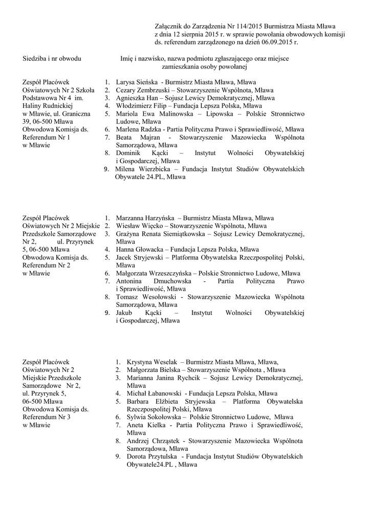 Załącznik do Zarządzenia Nr 114/2015 Burmistrza Miasta Mława z dnia 12 sierpnia 2015 r. w sprawie powołania obwodowych komisji ds. referendum zarządzonego na dzień 06.09.2015 r. Imię i nazwisko, nazwa podmiotu zgłaszającego oraz miejsce zamieszkania osoby powołanej Siedziba i nr obwodu Zespół Placówek Oświatowych Nr 2 Szkoła Podstawowa Nr 4 im. Haliny Rudnickiej w Mławie, ul. Graniczna 39, 06-500 Mława Obwodowa Komisja ds. Referendum Nr 1 w Mławie 1. 2. 3. 4. 5. 6. 7. 8. 9. Zespół Placówek Oświatowych Nr 2 Miejskie Przedszkole Samorządowe Nr 2, ul. Przyrynek 5, 06-500 Mława Obwodowa Komisja ds. Referendum Nr 2 w Mławie Zespół Placówek Oświatowych Nr 2 Miejskie Przedszkole Samorządowe Nr 2, ul. Przyrynek 5, 06-500 Mława Obwodowa Komisja ds. Referendum Nr 3 w Mławie Larysa Sieńska - Burmistrz Miasta Mława, Mława Cezary Zembrzuski – Stowarzyszenie Wspólnota, Mława Agnieszka Han – Sojusz Lewicy Demokratycznej, Mława Włodzimierz Filip – Fundacja Lepsza Polska, Mława Mariola Ewa Malinowska – Lipowska – Polskie Stronnictwo Ludowe, Mława Marlena Radzka - Partia Polityczna Prawo i Sprawiedliwość, Mława Beata Majran - Stowarzyszenie Mazowiecka Wspólnota Samorządowa, Mława Dominik Kącki – Instytut Wolności Obywatelskiej i Gospodarczej, Mława Milena Wierzbicka – Fundacja Instytut Studiów Obywatelskich Obywatele 24.PL, Mława 1. Marzanna Harzyńska – Burmistrz Miasta Mława, Mława 2. Wiesław Więcko – Stowarzyszenie Wspólnota, Mława 3. Grażyna Renata Siemiątkowska – Sojusz Lewicy Demokratycznej, Mława 4. Hanna Głowacka – Fundacja Lepsza Polska, Mława 5. Jacek Stryjewski – Platforma Obywatelska Rzeczpospolitej Polski, Mława 6. Małgorzata Wrzeszczyńska – Polskie Stronnictwo Ludowe, Mława 7. Antonina Dmuchowska Partia Polityczna Prawo i Sprawiedliwość, Mława 8. Tomasz Wesołowski - Stowarzyszenie Mazowiecka Wspólnota Samorządowa, Mława 9. Jakub Kącki – Instytut Wolności Obywatelskiej i Gospodarczej, Mława 1. Krystyna Weselak – Burmistrz Miasta Mława, Mława, 2. Małgorzata Bielska – Stowarzyszenie Wspólnota , Mława 3. Marianna Janina Rychcik – Sojusz Lewicy Demokratycznej, Mława 4. Michał Łabanowski - Fundacja Lepsza Polska, Mława 5. Barbara Elżbieta Stryjewska – Platforma Obywatelska Rzeczpospolitej Polski, Mława 6. Sylwia Sokołowska – Polskie Stronnictwo Ludowe, Mława 7. Aneta Kielka - Partia Polityczna Prawo i Sprawiedliwość, Mława 8. Andrzej Chrząstek - Stowarzyszenie Mazowiecka Wspólnota Samorządowa, Mława 9. Dorota Przytulska - Fundacja Instytut Studiów Obywatelskich Obywatele24.PL , Mława Zespół Szkół Nr 2 w Mławie, ul. Zuzanny Morawskiej 29B, 06-500 Mława Obwodowa Komisja ds. Referendum Nr 4 w Mławie 1. 2. 3. 4. 5. 6. 7. 8. 9. Zespół Placówek Oświatowych Nr 3 w Mławie Szkoła Podstawowa Nr 7 im. Zuzanny Morawskiej, ul. Ordona 14, 06-500 Mława Obwodowa Komisja ds. Referendum Nr 5 w Mławie 1. 2. 3. 4. 5. 6. 7. 8. 9. Zespół Placówek Oświatowych Nr 3 w Mławie Szkoła Podstawowa Nr 7 im. Zuzanny Morawskiej, ul. Ordona 14, 06-500 Mława Obwodowa Komisja ds. Referendum Nr 6 w Mławie 1. 2. 3. 4. 5. 6. 7. 8. 9. Bożena Maria Majewska - Burmistrz Miasta Mława, Mława Milena Radzymińska – Stowarzyszenie Wspólnota, Mława Irena Biegaj - Sojusz Lewicy Demokratycznej, Mława Robert Grabowski – Fundacja Lepsza Polska, Mława Izabela Kanigowska- Żwir – Platforma Obywatelska Rzeczpospolitej Polski, Mława Przemysław Olczak – Polskie Stronnictwo Ludowe, Mława Andrzej Porzeziński – Partia Polityczna Prawo i Sprawiedliwość, Mława Elżbieta Komorowska - Stowarzyszenie Mazowiecka Wspólnota Samorządowa, Mława Kamil Robert Przybyszewski – Instytut Wolności Obywatelskiej i Gospodarczej, Mława Anna Robaczewska – Burmistrz Miasta Mława, Mława Edyta Śmigelska - Łachacz – Stowarzyszenie Wspólnota, Mława Jolanta Olszewska – Fundacja Lepsza Polska, Mława Agnieszka Monika Puzio- Dębska – Platforma Obywatelska Rzeczpospolitej Polski, Mława Katarzyna Burchacka – Polskie Stronnictwo Ludowe, Mława Bożena Wrzyszcz - Partia Polityczna Prawo i Sprawiedliwość, Mława Monika Angelika Piotrkowska - Stowarzyszenie Mazowiecka Wspólnota Samorządowa, Mława Katarzyna Emilia Olszewska – Instytut Wolności Obywatelskiej i Gospodarczej, Mława Malwina Kobielska – Fundacja Instytut Studiów Obywatelskich Obywatele24.PL, Mława Emilia Dębska – Burmistrz Miasta Mława, Mława Krystyna Kołakowska – Sojusz Lewicy Demokratycznej, Mława Mariusz Dziubiński – Fundacja Lepsza Polska, Mława Tomasz Dębski – Platforma Obywatelska Rzeczpospolitej Polski, Mława Barbara Wilamowska – Polskie Stronnictwo Ludowe, Mława Ilona Gajur - Partia Polityczna Prawo i Sprawiedliwość, Mława Maria Staniszewska- Stowarzyszenie Mazowiecka Wspólnota Samorządowa, Mława Ewa Barbara Kępińska – Instytut Wolności Obywatelskiej i Gospodarczej, Mława Wioletta Brzozowska – Fundacja Instytut Studiów Obywatelskich, Mława Zespół Szkół Nr 1 w Mławie, ul. Zuzanny Morawskiej 29, 06-500 Mława Obwodowa Komisja ds. Referendum Nr 7 w Mławie 1. Bożena Wyszczelska – Burmistrz Miasta Mława, Mława 2. Zdzisława Jankowska- Stowarzyszenie Wspólnota, Mława 3. Barbara Długokęcka – Piotrowska - Sojusz Lewicy Demokratycznej, Mława 4. Krzysztof Kwiatek – Fundacja Lepsza Polska, Mława 5. Hanna Kanigowska – Platforma Obywatelska Rzeczpospolitej Polski, Mława 6. Marta Wysocka – Polskie Stronnictwo Ludowe, Mława 7. Tadeusz Staniszewski – Partia Polityczna Prawo i Sprawiedliwość, Mława 8. Grażyna Koczkowska - Stowarzyszenie Mazowiecka Wspólnota Samorządowa, Mława Miejski Ośrodek Sportu i Rekreacji w Mławie, ul. Mikołaja Kopernika 38, 06-500 Mława Obwodowa Komisja ds. Referendum Nr 8 w Mławie 1. Anna Chrobot – Burmistrz Miasta Mława, Mława 2. Sandra Kurpiel – Stowarzyszenie Wspólnota, Mława 3. Stefan Bernard Radomski – Soj