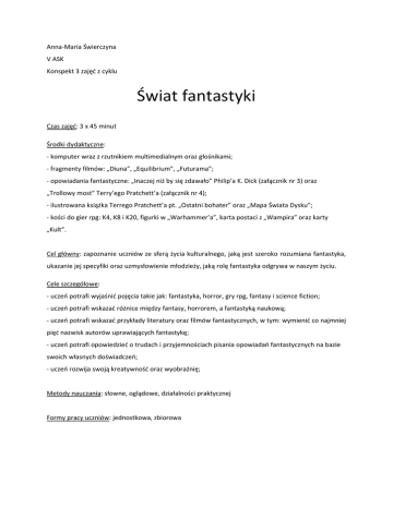 Anna‐Maria Świerczyna V ASK Konspekt 3 zajęć z cyklu Świat fantastyki Czas zajęć: 3 x 45 minut Środki dydaktyczne: ‐ komputer wraz z rzutnikiem multimedialnym oraz głośnikami; ‐ fragmenty filmów: „Diuna”, „Equilibrium”, „Futurama”; ‐ opowiadania fantastyczne: „Inaczej niż by się zdawało” Philip’a K. Dick (załącznik nr 3) oraz „Trollowy most” Terry’ego Pratchett’a (załącznik nr 4); ‐ ilustrowana książka Terrego Pratchett’a pt. „Ostatni bohater” oraz „Mapa Świata Dysku”; ‐ kości do gier rpg: K4, K8 i K20, figurki w „Warhammer’a”, karta postaci z „Wampira” oraz karty „Kult”. Cel główny: zapoznanie uczniów ze sferą życia kulturalnego, jaką jest szeroko rozumiana fantastyka, ukazanie jej specyfiki oraz uzmysłowienie młodzieży, jaką rolę fantastyka odgrywa w naszym życiu. Cele szczegółowe: ‐ uczeń potrafi wyjaśnić pojęcia takie jak: fantastyka, horror, gry rpg, fantasy i science fiction; ‐ uczeń potrafi wskazać różnice między fantasy, horrorem, a fantastyką naukową; ‐ uczeń potrafi wskazać przykłady literatury oraz filmów fantastycznych, w tym: wymienić co najmniej pięć nazwisk autorów uprawiających fantastykę; ‐ uczeń potrafi opowiedzieć o trudach i przyjemnościach pisania opowiadań fantastycznych na bazie swoich własnych doświadczeń; ‐ uczeń rozwija swoją kreatywność oraz wyobraźnię; Metody nauczania: słowne, oglądowe, działalności praktycznej Formy pracy uczniów: jednostkowa, zbiorowa Lekcja 1 1. Wprowadzenie do zajęć (przywitanie, sprawdzenie listy obecności). 2. Przedstawienie tematu zajęć. (slajd nr 2) 3. Nauczyciel rozdaje uczniom krzyżówkę (załącznik nr 1) oraz notatkę z lekcji (załącznik nr 2), które uczniowie będą wypełniać przez resztę zajęć. 4. Rozmowa nauczyciela z uczniami odnośnie tematu lekcji (co rozumieją pod pojęciem „fantastyka”), na zasadzie „burzy mózgów”. 5. Przytoczenie definicji słowa „fantastyka” (slajd nr 3 i 4). 6. Rozmowa nauczyciela z uczniami na temat różnic między poszczególnymi rodzajami fantastyki. 7. Przybliżenie uczniom pojęcia „fantastyka naukowa” oraz wskazanie jej cech. Prośba nauczyciela o podanie przez uczniów przykładów dzieł literackich, filmowych, muzycznych etc. (slajdy nr 5‐7). 8. Zapoznanie uczniów z pięciorgiem wielkich twórców literatury sci‐fi (slajdy nr 8‐23). 9. Swobodna dyskusja na temat siedmiu przedstawionych filmów sci‐fi wraz z muzyką (slajdy nr 25‐33). 10. Podsumowanie przez nauczyciela nowych wiadomości na zasadzie wyrywkowych odpowiedzi oraz rozdanie uczniom dwóch opowiadań: „Trollowy most” Terry’ego Pratchett’a oraz „Inaczej niż by się zdawało” Philip’a K. Dick 11. Pokazanie uczniom fragmentu filmu pt. „Equilibrium” oraz bajki pt. „Futurama”. Zadanie domowe: poszukać własnych (innych!) przykładów dzieł z zakresu fantastyki naukowej oraz przeczytać opowiadania. Lekcja 2 1. Wprowadzenie do zajęć (przywitanie, sprawdzenie listy obecności). 2. Sprawdzenie zadania domowego. 3. Przedstawienie tematu zajęć (slajd nr 34). 4. Krótkie podsumowanie zdobytych dotychczas wiadomości. 5. Przybliżenie uczniom pojęcia „fantasy” oraz wskazanie jej cech. Prośba nauczyciela o podanie przez uczniów przykładów dzieł literackich, filmowych, muzycznych etc (slajdy nr 35‐36). 6. Przedstawienie uczniom trzech pisarzy fantasy (slajdy nr 37‐44), pięciu filmów (slajdy nr 45‐ 50) oraz utworu muzycznego grupy Nightwish pt. Wishmaster (slajd nr 52). W trakcie – dyskusja oraz oglądanie przez uczniów dzieł Terrego Pratchett’a pt. „Ostatni bohater” oraz „Mapa Świata Dysku”. 7. Wytłumaczenie uczniom, dlaczego „horror” jest częścią fantastyki (slajdy nr 53‐54). 8. Przykłady literatury oraz filmów grozy (slajdy nr 55‐72). 9. Podsumowanie przez nauczyciela nowych wiadomości na zasadzie wyrywkowych odpowiedzi. 10. Pokazanie uczniom fragmentu filmu pt. „Diuna”. Zadanie domowe: napisać krótkie opowiadanie utrzymane w konwencji fantastyki (do wyboru: sci‐fi, fantasy, horror). Lekcja 3 1. Wprowadzenie do zajęć (przywitanie, sprawdzenie listy obecności). 2. Sprawdzenie i zebranie przez nauczyciela zadania domowego. 3. Krótkie podsumowanie zdobytych dotychczas wiadomości. 4. Przedstawienie tematu zajęć (slajd nr 73). 5. Wyjaśnienie uczniom, czym jest „gra fabularna” i „jak to działa” (slajdy nr 73‐74), plus przykłady gier rpg (slajdy nr 75‐77). 6. Pokazanie uczniom akcesoriów przydatnych w grze. 7. Przypomnienie i podsumowanie zdobytej wiedzy, sprawdzenie krzyżówek oraz notatek z lekcji (slajdy nr 78‐87).