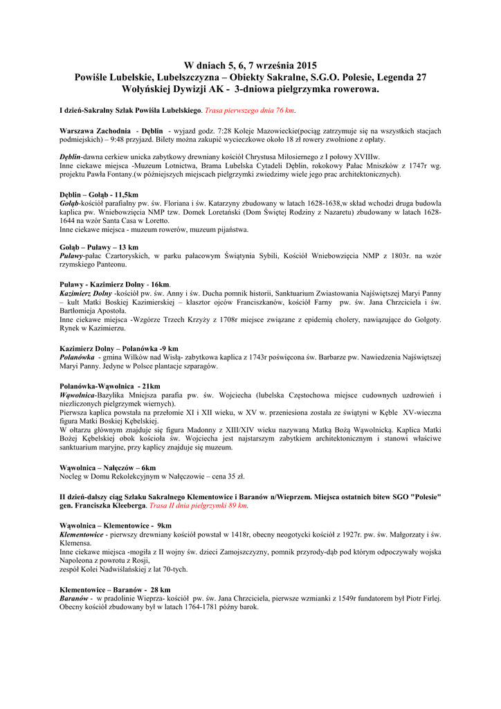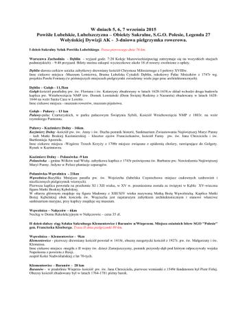 W dniach 5, 6, 7 września 2015 Powiśle Lubelskie, Lubelszczyzna – Obiekty Sakralne, S.G.O. Polesie, Legenda 27 Wołyńskiej Dywizji AK - 3-dniowa pielgrzymka rowerowa. I dzień-Sakralny Szlak Powiśla Lubelskiego. Trasa pierwszego dnia 76 km. Warszawa Zachodnia - Dęblin - wyjazd godz. 7:28 Koleje Mazowieckie(pociąg zatrzymuje się na wszystkich stacjach podmiejskich) – 9:48 przyjazd. Bilety można zakupić wycieczkowe około 18 zł rowery zwolnione z opłaty. Dęblin-dawna cerkiew unicka zabytkowy drewniany kościół Chrystusa Miłosiernego z I połowy XVIIIw. Inne ciekawe miejsca -Muzeum Lotnictwa, Brama Lubelska Cytadeli Dęblin, rokokowy Pałac Mniszków z 1747r wg. projektu Pawła Fontany.(w późniejszych miejscach pielgrzymki zwiedzimy wiele jego prac architektonicznych). Dęblin – Gołąb - 11,5km Gołąb-kościół parafialny pw. św. Floriana i św. Katarzyny zbudowany w latach 1628-1638,w skład wchodzi druga budowla kaplica pw. Wniebowzięcia NMP tzw. Domek Loretański (Dom Świętej Rodziny z Nazaretu) zbudowany w latach 16281644 na wzór Santa Casa w Loretto. Inne ciekawe miejsca - muzeum rowerów, muzeum pijaństwa. Gołąb – Puławy – 13 km Puławy-pałac Czartoryskich, w parku pałacowym Świątynia Sybili, Kościół Wniebowzięcia NMP z 1803r. na wzór rzymskiego Panteonu. Puławy - Kazimierz Dolny - 16km. Kazimierz Dolny -kościół pw. św. Anny i św. Ducha pomnik historii, Sanktuarium Zwiastowania Najświętszej Maryi Panny – kult Matki Boskiej Kazimierskiej – klasztor ojców Franciszkanów, kościół Farny pw. św. Jana Chrzciciela i św. Bartłomieja Apostoła. Inne ciekawe miejsca -Wzgórze Trzech Krzyży z 1708r miejsce związane z epidemią cholery, nawiązujące do Golgoty. Rynek w Kazimierzu. Kazimierz Dolny – Polanówka -9 km Polanówka - gmina Wilków nad Wisłą- zabytkowa kaplica z 1743r poświęcona św. Barbarze pw. Nawiedzenia Najświętszej Maryi Panny. Jedyne w Polsce plantacje szparagów. Polanówka-Wąwolnica - 21km Wąwolnica-Bazylika Mniejsza parafia pw. św. Wojciecha (lubelska Częstochowa miejsce cudownych uzdrowień i niezliczonych pielgrzymek wiernych). Pierwsza kaplica powstała na przełomie XI i XII wieku, w XV w. przeniesiona została ze świątyni w Kęble XV-wieczna figura Matki Boskiej Kębelskiej. W ołtarzu głównym znajduje się figura Madonny z XIII/XIV wieku nazywaną Matką Bożą Wąwolnicką. Kaplica Matki Bożej Kębelskiej obok kościoła św. Wojciecha jest najstarszym zabytkiem architektonicznym i stanowi właściwe sanktuarium maryjne, przy kaplicy znajduje się muzeum. Wąwolnica – Nałęczów – 6km Nocleg w Domu Rekolekcyjnym w Nałęczowie – cena 35 zł. II dzień-dalszy ciąg Szlaku Sakralnego Klementowice i Baranów n/Wieprzem. Miejsca ostatnich bitew SGO "Polesie" gen. Franciszka Kleeberga. Trasa II dnia pielgrzymki 89 km. Wąwolnica – Klementowice - 9km Klementowice - pierwszy drewniany kościół powstał w 1418r, obecny neogotycki kościół z 1927r. pw. św. Małgorzaty i św. Klemensa. Inne ciekawe miejsca -mogiła z II wojny św. dzieci Zamojszczyzny, pomnik przyrody-dąb pod którym odpoczywały wojska Napoleona z powrotu z Rosji, zespół Kolei Nadwiślańskiej z lat 70-tych. Klementowice – Baranów - 28 km Baranów - w pradolinie Wieprza- kościół pw. św. Jana Chrzciciela, pierwsze wzmianki z 1549r fundatorem był Piotr Firlej. Obecny kościół zbudowany był w latach 1764-1781 późny barok. Baranów - Wola Gułowska - 21 km Wola Gułowska - klasztor oo. Karmelitów. Miejsce honorowej kapitulacji z braku amunicji Samodzielnej Grupy Operacyjnej "Polesie" gen. Franciszka Kleeberga. W miejscowym Domu Kultury znajduje się muzeum "kleeberczyków" żołnierzy gen. Kleeberga. Również tam rozgrywały się ostatnie walki SGO "Polesie" ,tu odbywają się rekonstrukcje bitwy. Wola Gułowska-Syrokomla-Kock - szlak ostatniej operacji SGO "Polesie" - 20 km Kock - Izba pamięci gen. Franciszka Kleeberga w miejscowym Domu Kultury, pomnik gen. F. Kleeberga i cmentarz wojenny na którym spoczywają żołnierze SGO "Polesie" Kościół pw. Wniebowzięcia NMP, wybudowany w latach 1778-1782; pierwszy budynek w Polsce z portykiem kolumnowym w elewacji. Inne ciekawe miejsca - zespół pałacowo-parkowy księżnej Anny z Sapiehów Jabłonowskiej. Rabinówka charakterystyczny budynek w którym mieszkał rabin Józef Morgersztern twórca chasydyzmu kockiego, za jego czasów miejsce pielgrzymek społeczności żydowskiej z całego świata. Kock-Firlej - 11 km. Nocleg w ośrodku wypoczynkowym Wodnik w Firleju, przewidziane wieczorne ognisko (wskazany śpiewnik w bagażu) – cena 35 zł – możliwość zamówienia posiłków.. III dzień - zabytkowe kościoły, Zespół pałacowo-parkowy Zamoyskich w Kozłówce, galeria socrealizmu w Kozłówce, legenda Wołyńskiej 27 Dywizji Piechoty Armii Krajowej, Lubartów, zabytki Lublina. Trasa III dnia pielgrzymki 66 km. Firlej - drewniany kościół z 1880r (w świątyni przechowywany jest ołtarz polowy I Pułku Ułanów dyw. gen. Chrzanowskiego z 1831r.) Firlej - Kamionka - 11 km Kamionka - zabytkowy kościół z XV wieku. Kamionka - Kozłówka - 2km Kozłówka - zespół pałacowo-parkowy Zamoyskich w Kozłówce pomnik historii, polski Wersal, galeria socrealizmu (w niedzielę zwiedzanie pałacu jest bezpłatne). Kozłówka - Skrobów - 7 km. Skrobów - tutaj znajdują się tablice poświęcone 27 Wołyńskiej Dywizji AK, cmentarz wojenny oraz niemiecki obóz jeniecki żołnierzy Armii Czerwonej. Po wyzwoleniu przez wspólne oddziały Armii Krajowej i 27 Wołyńskiej Dywizji AK powiatu lubartowskiego i wkroczeniu Armii Czerwonej, dywizja została zaproszona przez Armię Czerwoną do defilady w Skrobowie gdzie podstępnie została otoczona w tzw. worek i zmuszona do złożenia broni, aby uniknąć zbytecznego rozlewu krwi dowództwo zwolniło żołnierzy z przysięgi i oddział został rozwiązany. Skrobów - Lubartów - 6 km. Lubartów - Bazylika M