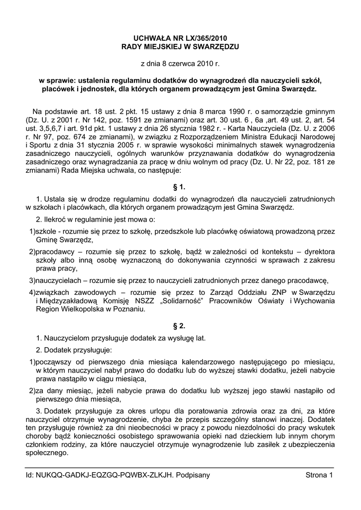 UCHWAŁA NR LX/365/2010 RADY MIEJSKIEJ W SWARZĘDZU z dnia 8 czerwca 2010 r. w sprawie: ustalenia regulaminu dodatków do wynagrodzeń dla nauczycieli szkół, placówek i jednostek, dla których organem prowadzącym jest Gmina Swarzędz. Na podstawie art. 18 ust. 2 pkt. 15 ustawy z dnia 8 marca 1990 r. o samorządzie gminnym (Dz. U. z 2001 r. Nr 142, poz. 1591 ze zmianami) oraz art. 30 ust. 6 , 6a ,art. 49 ust. 2, art. 54 ust. 3,5,6,7 i art. 91d pkt. 1 ustawy z dnia 26 stycznia 1982 r. - Karta Nauczyciela (Dz. U. z 2006 r. Nr 97, poz. 674 ze zmianami), w związku z Rozporządzeniem Ministra Edukacji Narodowej i Sportu z dnia 31 stycznia 2005 r. w sprawie wysokości minimalnych stawek wynagrodzenia zasadniczego nauczycieli, ogólnych warunków przyznawania dodatków do wynagrodzenia zasadniczego oraz wynagradzania za pracę w dniu wolnym od pracy (Dz. U. Nr 22, poz. 181 ze zmianami) Rada Miejska uchwala, co następuje: § 1. 1. Ustala się w drodze regulaminu dodatki do wynagrodzeń dla nauczycieli zatrudnionych w szkołach i placówkach, dla których organem prowadzącym jest Gmina Swarzędz. 2. Ilekroć w regulaminie jest mowa o: 1)szkole - rozumie się przez to szkołę, przedszkole lub placówkę oświatową prowadzoną przez Gminę Swarzędz, 2)pracodawcy – rozumie się przez to szkołę, bądź w zależności od kontekstu – dyrektora szkoły albo inną osobę wyznaczoną do dokonywania czynności w sprawach z zakresu prawa pracy, 3)nauczycielach – rozumie się przez to nauczycieli zatrudnionych przez danego pracodawcę, 4)związkach zawodowych – rozumie się przez to Zarząd Oddziału ZNP w Swarzędzu i Międzyzakładową Komisję NSZZ „Solidarność” Pracowników Oświaty i Wychowania Region Wielkopolska w Poznaniu. § 2. 1. Nauczycielom przysługuje dodatek za wysługę lat. 2. Dodatek przysługuje: 1)począwszy od pierwszego dnia miesiąca kalendarzowego następującego po miesiącu, w którym nauczyciel nabył prawo do dodatku lub do wyższej stawki dodatku, jeżeli nabycie prawa nastąpiło w ciągu miesiąca, 2)za dany miesiąc, jeżeli nabycie prawa do dodatku lub wyższej jego stawki nastąpiło od pierwszego dnia miesiąca, 3. Dodatek przysługuje za okres urlopu dla poratowania zdrowia oraz za dni, za które nauczyciel otrzymuje wynagrodzenie, chyba że przepis szczególny stanowi inaczej. Dodatek ten przysługuje również za dni nieobecności w pracy z powodu niezdolności do pracy wskutek choroby bądź konieczności osobistego sprawowania opieki nad dzieckiem lub innym chorym członkiem rodziny, za które nauczyciel otrzymuje wynagrodzenie lub zasiłek z ubezpieczenia społecznego. Id: NUKQQ-GADKJ-EQZGQ-PQWBX-ZLKJH. Podpisany Strona 1 4. Potwierdzenie nabycia prawa do dodatku za wysługę lat oraz wysokość tego dodatku określa nauczycielowi dyrektor szkoły, a dyrektorowi burmistrz. 5. Dodatek wypłaca się z góry w terminie wypłaty wynagrodzenia. § 3. 1. Ogólne warunki przyznawania nauczycielom dodatku motywacyjnego określa Rozporządzenie Ministra Edukacji Narodowej i Sportu z dnia 31 stycznia 2005 r.w sprawie wysokości minimalnych stawek wynagrodzenia zasadniczego nauczycieli, ogólnych warunków przyznawania dodatków do wynagrodzenia zasadniczego oraz wynagradzania za pracę w dniu wolnym od pracy (Dz. U. Nr 22, poz. 181 ze zmianami). 2. Dodatek motywacyjny nauczycielom przyznaje się uwzględniając: 1)osiągnięcia dydaktyczne, wychowawcze i opiekuńcze, 2)jakość świadczonej pracy, w tym związanej z powierzonym dodatkowym zadaniem lub zajęciem, 3)ocenę pracy nauczyciela lub ocenę dorobku zawodowego, a w przypadku nauczycieli stażystów informację o zaangażowaniu i jakości pracy, 4)zaangażowanie w realizację czynności i zajęć, które zawarte są w art. 42 ust. 2 pkt 2 i Karty Nauczyciela,a dyrektorom uwzględniając dodatkowo: a) planowanie i realizację gospodarki finansowej kierowanej placówki, b) wypełnianie obowiązków pracodawcy, c) organizowanie działalności dydaktycznej, wychowawczej i opiekuńczej szkoły, d) dbanie o stan techniczny i estetyczny bazy szkolnej, e) realizowanie założeń polityki oświatowej gminy. 3. Burmistrz przyznaje dodatek dyrektorowi, a dyrektor nauczycielom, określając jego wysokość. 4. Dodatek przyznaje się nauczycielowi na czas określony, nie krótszy niż trzy miesiące i nie dłuższy niż jeden rok. 5. Ustala się stawkę kalkulacyjną / średnio na 1 etat / w wysokości 3,5% wynagrodzenia zasadniczego nauczyciela mianowanego w: 1)szkołach podstawowych, 2)gimnazjach, 3)przedszkolach, 4)oddziałach przedszkolnych w szkołach podstawowych. 6. Wysokość miesięcznych środków finansowych przeznaczonych na dodatki motywacyjne nauczycieli dla poszczególnych jednostek, wylicza się mnożąc kwotę 3,5% wynagrodzenia zasadniczego nauczyciela mianowanego przez ilość zatrudnionych nauczycieli w przeliczeniu na pełne etaty. 7. Szczegółowe kryteria przyznawania w porozumieniu ze związkami zawodowymi. dodatku motywacyjnego ustala dyrektor 8. Ustala się dodatek motywacyjny dla dyrektorów w wysokości 27% wynagrodzenia zasadniczego nauczyciela mianowanego. Id: NUKQQ-GADKJ-EQZGQ-PQWBX-ZLKJH. Podpisany Strona 2 9. Środki przeznaczone na dodatek motywacyjny dla dyrektora wlicza się dodatkowo w środki przeznaczone dla danej szkoły. § 4. 1. Wykaz stanowisk i funkcji, których zajmowanie bądź pełnienie uprawnia do dodatku funkcyjnego określa § 5 rozporządzenia ,o którym mowa w § 3 ust.1 Regulaminu. 2. Dodatek funkcyjny dla dyrektorów uzależniony jest od wielkości szkoły, jej warunków organizacyjnych, złożoności zadań wynikających ze stanowiska kierowniczego lub pełnionej funkcji, liczby stanowisk kierowniczych w szkole, określony procentowo od stawki wynagrodzenia zasadniczego nauczyciela mianowanego, a jego wysokość określa tabela. - dyrektor szkoły/zespołu - dodatek funkcyjny dyrektora do 7 oddziałów 25% - 34% od 8 do 16 oddziałów 29% - 38% od 17 do 