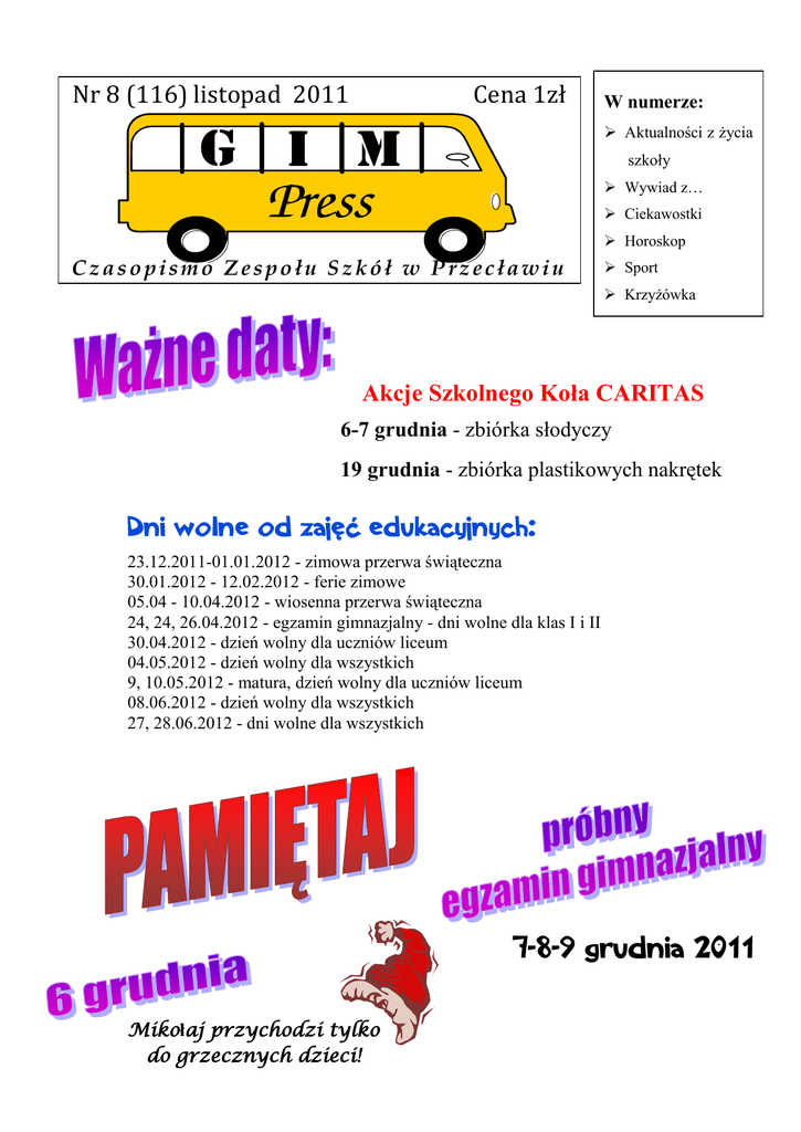 Nr 8 (116) listopad 2011 Cena 1zł W numerze: Aktualności z życia szkoły Wywiad z… Ciekawostki Horoskop Czasopismo Zespołu Szkół w Przecławiu Sport Krzyżówka Akcje Szkolnego Koła CARITAS 6-7 grudnia - zbiórka słodyczy 19 grudnia - zbiórka plastikowych nakrętek 23.12.2011-01.01.2012 - zimowa przerwa świąteczna 30.01.2012 - 12.02.2012 - ferie zimowe 05.04 - 10.04.2012 - wiosenna przerwa świąteczna 24, 24, 26.04.2012 - egzamin gimnazjalny - dni wolne dla klas I i II 30.04.2012 - dzień wolny dla uczniów liceum 04.05.2012 - dzień wolny dla wszystkich 9, 10.05.2012 - matura, dzień wolny dla uczniów liceum 08.06.2012 - dzień wolny dla wszystkich 27, 28.06.2012 - dni wolne dla wszystkich Mikołaj przychodzi tylko do grzecznych dzieci! Str. 2 Czasopismo Zespołu Szkół w Przecławiu 93. rocznica odzyskania przez Polskę niepodległości Naród, który nie szanuje swej przeszłości, nie zasługuje na szacunek teraźniejszości i nie ma prawa do przyszłości. Józef Piłsudski W piątek, 11 listopada, przypadała 93. rocznica odzyskania przez Polskę niepodległości. Święto jest obchodzone dla upamiętnienia 11 listopada 1918 r., kiedy to Polska odrodziła się po 123 latach niewoli. 10 listopada nauczyciele, pracownicy szkoły oraz my, uczniowie, elegancko ubrani przyszliśmy wspólnie świętować. O godzinie 9.35 wszyscy zebraliśmy się w sali gimnastycznej, aby wziąć udział w uroczystej akademii, przygotowanej przez uczniów pracujących pod kierunkiem p. S.Wilczyńskiego, p. D.Skrzypka, p. P.Wolaka i p. W.Kaszuba. Program artystyczny uświetniły recytacje naszych koleżanek z pierwszych klas: Klaudii Knap, Moniki Patyk, Weroniki Wilczyńskiej oraz Moniki Wacławskiej. Nie zawiedliśmy się też na naszym szkolnym chórze, który jak zawsze pięknie wykonał wszystkie utwory pod batutą zastępcy dyrygenta, Krystiana Lewandowskiego. Recytacje, scenografia, występ chóru przybliżyły społeczności szkolnej czas niewoli narodowej i odzyskanie niepodległości. Po zakończeniu części artystycznej odbyło się również ślubowanie uczniów pierwszych klas, którzy rozpoczęli naukę w gimnazjum. To oni przez najbliższe trzy lata będą tworzyć wizerunek szkoły, biorąc aktywny udział w konkursach, olimpiadach, zawodach sportowych i wypełniając swoje obowiązki. Uroczystość podsumowała p. dyrektor Barbara Dybska, która zwróciła uwagę na istotną rolę upamiętniania ważnych dla narodu wydarzeń. Kasia Uczniowie Szkolnego Koła Caritas w najbliższych dniach przeprowadzą kilka akcji, które świadczą o chęci pomocy innym i ich wielkich sercach. Najpierw z okazji dnia św. Mikołaja pozbierają prezenty - słodycze od społeczności naszej szkoły i prześlą je do Szpitala Dziecięcego w Prokocimiu. W ten sposób, obdarowując innych, każdy z nas będzie miał okazję stać się naśladowcą św. Mikołaja. Następnie uczniowie SKC przeprowadzą akcję rozprowadzania kalendarzy na 2012 rok. Znajdują się na nich zdjęcia uczennicy LO, Katarzyny Tabor; będą stanowić cegiełkę na leczenie naszej koleżanki. W najbliższym czasie planowana jest także zbiórka plastikowych nakrętek. Pomagać bowiem można nawet zbierając nakrętki. Nagrody otrzymają ci, którzy przekażą największą ich ilość. Wszystkim, którzy włączą się w jakikolwiek sposób w pomoc innym, już dziś składamy serdeczne Bóg zapłać. SKC GIMPRESS 8 (116) listopad 2011 Czasopismo Zespołu Szkół w Przecławiu Str. 3 Wywiad z przewodniczącą Samorządu Uczniowskiego, Agatą Słombą -Na początek przedstaw się, powiedz, ile masz lat i do której klasy chodzisz. -Nazywam się Agata Słomba. Mam 15 lat i chodzę do klasy 3d gimnazjum. -Jak się czujesz w roli przewodniczącej szkoły? -Jako przewodnicząca czuję się bardzo dobrze, lecz niesie to ze sobą dużo obowiązków. Na szczęście pełnienie tej funkcji ma również plusy -A jakie plany ma SU na najbliższą przyszłość? -W najbliższym czasie mamy zamiar przeprowadzić akcję "GÓRA GROSZA", do której wszystkich serdecznie zapraszamy. Poza tym w styczniu będzie prawdopodobnie zorganizowana dyskoteka, a w lutym poczta walentynkowa. -A teraz kilka słów o sobie. Czym się interesujesz? -Interesuję się muzyką oraz tańcem. Uwielbiam oglądać komedie romantyczne, czytać książki, surfować po Internecie i spotykać się z przyjaciółmi -Do jakiej szkoły wybierasz się po ukończeniu gimnazjum? -Dotychczas myślałam o kierunku związanym z kosmetologią, ale moje plany mogą ulec zmianie, ponieważ mam jeszcze trochę czasu do wybrania szkoły. Na pewno trudno będzie mi się rozstać z naszym gimnazjum. -To znaczy, że lubisz naszą szkołę? -Tak, panuje tutaj bardzo miła atmosfera. Nauczyciele są wyrozumiali i cierpliwi, a uczniowie sympatyczni -Jaka jest Twoja ulubiona lekcja w szkole? -Religia -Co sądzisz o zmianach w egzaminie gimnazjalnym? -Wydaje mi się, że są one niepotrzebne, gdyż uczniowie jeszcze bardziej będą się stresować. Tak naprawdę nie wiemy, czego możemy się dokładnie spodziewać. -Dziękuję za rozmowę. -Ja również dziękuję. Wywiad przeprowadziła Marcelina Kubek Pamięć o zmarłych w różnych kulturach "Zdałem sobie sprawę, że prawdziwą wartość drugiego człowieka odkrywamy dopiero wtedy, kiedy już go nie ma. Jak skarb, który trzymało się w dłoni, ale bezwiednie pozwoliło mu się wyślizgnąć przez palce" Jonathan Carroll Pamięć o zmarłych kultywowana jest w różnych miejscach na świecie, w najróżniejszy sposób i o różnej porze roku. Dla katolików zamieszkujących Europę Dzień Wszystkich Świętych jest dniem zadumy i refleksji nad śmiercią, sensem ludzkiego życia i jego przemijaniem. W wielu kulturach, np. w Meksyku, święto zmarłych trwa kilka dni. Na Filipinach refleksji nad śmiercią najbliższych towarzyszą huczne biesiady w namiotach zapełniających cmentarze. Powszechnie znanym świętem związanym ze zmar