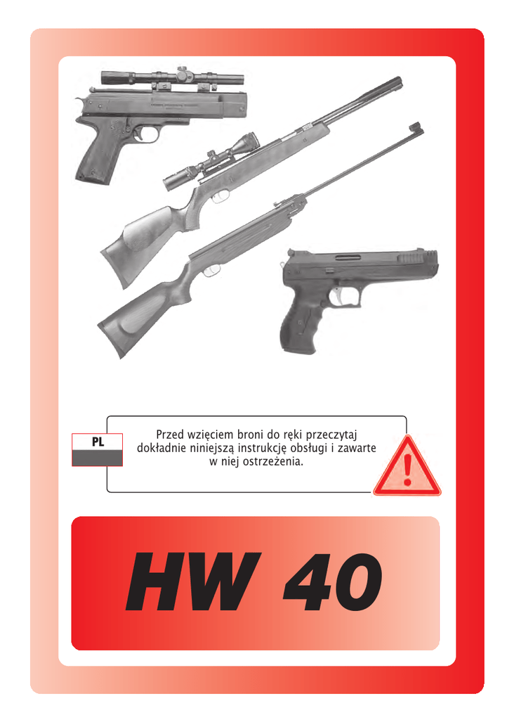 PL Przed wzięciem broni do ręki przeczytaj dokładnie niniejszą instrukcję obsługi i zawarte w niej ostrze�enia. HW 40 Treść 2 PL Wa�ne wskazówki . . . . . . . . . . . . . . . . . . . . . . . . . . . . . . . . . . . . . . . . . . . . . . . . . Zalecenia . . . . . . . . . . . . . . . . . . . . . . . . . . . . . . . . . . . . . . . . . . . . . . . . . . . . . . . . Obsługa . . . . . . . . . . . . . . . . . . . . . . . . . . . . . . . . . . . . . . . . . . . . . . . . . . . . . . . . . Regulacja twardości spustu . . . . . . . . . . . . . . . . . . . . . . . . . . . . . . . . . . . . . . . . . . Konserwacja . . . . . . . . . . . . . . . . . . . . . . . . . . . . . . . . . . . . . . . . . . . . . . . . . . . . . . Gwarancja . . . . . . . . . . . . . . . . . . . . . . . . . . . . . . . . . . . . . . . . . . . . . . . . . . . . . . . . Ładowanie (rys.) . . . . . . . . . . . . . . . . . . . . . . . . . . . . . . . . . . . . . . . . . . . . . . . . . . . Konserwacja (rys.) . . . . . . . . . . . . . . . . . . . . . . . . . . . . . . . . . . . . . . . . . . . . . . . . . Zabezpieczanie (rys.) . . . . . . . . . . . . . . . . . . . . . . . . . . . . . . . . . . . . . . . . . . . . . . . Regulacja twardości spustu (rys.). . . . . . . . . . . . . . . . . . . . . . . . . . . . . . . . . . . . . . . Regulacja czujnika mikrometrycznego (rys.). . . . . . . . . . . . . . . . . . . . . . . . . . . . . . Pojęcia (rys.) . . . . . . . . . . . . . . . . . . . . . . . . . . . . . . . . . . . . . . . . . . . . . . . . . . . . . . Celowanie (rys.) . . . . . . . . . . . . . . . . . . . . . . . . . . . . . . . . . . . . . . . . . . . . . . . . . . . Strona 3 6 7 8 8 9 11 12 13 13 14 14 15 Gratulujemy zakupu pistoletu pneumatycznego. WaCne wskazówki Broń pneumatyczna Weihrauch sprawdziła się w milionach egzemplarzy, dzięki precyzyjnemu wykonaniu jest ona niezawodną bronią sportową. Jej konstrukcja spełnia wysokie wymagania, stawiane współcześnie broni pneumatycznej. KaHda broń pneumatyczna WEIHRAUCH strzela precyzyjnie pociskami Diabolo z odległości dziesięciu metrów. Prawidłowa obsługa tej broni sportowej i treningowej daje wiele radości i zapewnia odniesienie sukcesu. Przestrzegać obowiązujących w kraju uCytkowania przepisów ustawowych oraz wymogów bezpieczeństwa w zakresie strzelania z broni pneumatycznej. NaleHy obowiązkowo spełnić wszystkie wymogi ustawowe odnośnie nabywania, posiadania i posługiwania się bronią. Broń pneumatyczną naleHy obowiązkowo traktować z takim samym respektem, jak broń palną. Nieprawidłowe uHytkowanie bądź naduHywanie broni moHe być przyczyną powaHnych obraHeń, a nawet śmierci. Przed wzięciem broni do rąk naleCy najpierw zapoznać się na podstawie niniejszej instrukcji z jego działaniem i obsługą. Przed uCyciem broni upewnić się, Ce instrukcja i ostrzeCenia zostały zrozumiane. Specjalista powinien poinstruować w zakresie prawidłowej obsługi i obchodzenia się z bronią. Tych instrukcji i wskazówek naleCy bezwzględnie przestrzegać dla bezpieczeństwa posługiwania się bronią. Zadbać o to, Ceby niniejsza instrukcja znajdowała się stale razem z bronią, szczególnie w przypadku sprzedaCy, wypoCyczenia czy innego rodzaju przekazania jej osobom trzecim. UHytkownik otrzymuje bezpłatny egzemplarz niniejszego podręcznika na załączony adres. W razie problemów z bezpiecznym uHytkowaniem i prawidłową obsługą czy teH pytań uzupełniających naleHy się zwrócić do specjalisty-rusznikarza, do sklepu z bronią bądź bezpośrednio do nas. Przywilej posiadania i utrzymywania broni wiąHe się z osobistą odpowiedzialnością. Nie wolno tego lekcewaHyć. Przestrzeganie zawartych w niniejszej instrukcji zasad i wskazówek bezpieczeństwa podczas strzelania pozwoli uniknąć wypadków. OstrzeCenie: Biorąc broń do rąk upewnij się zawsze, czy broń jest nabita, czy nienabita. Nigdy nie naleCy się w tej kwestii zdawać na kontrolę innych – zawsze naleCy to sprawdzić samodzielnie. Broń naleCy trzymać zawsze skierowaną w bezpieczną stronę! Jedną ręką przytrzymać mocno uchwyt, drugą – trzymać część górną za celownikiem mikrometrycznym tak, aby nie przemieściła się gwałtownie do góry. Teraz odciągnąć kciukiem kurek do tyłu i lekko unieść część górną (patrz Obsługa, str. 7). Teraz naleCy sprawdzić i upewnić się, Ce w gnieździe nie znajduje się pocisk, a lufa jest całkowicie wolna. W tym celu naleCy zajrzeć do lufy. Obsługa broni sportowej wymaga zawsze najwyCszej staranności i skrupulatności wszystkich osób uczestniczących w strzelaniu. Nie dawać broni do rąk dzieciom! Broń i amunicję naleCy przechowywać osobno, pod zamknięciem, poza zasięgiem dzieci. Broń naleCy przechowywać nienabitą. Bezpieczne przechowywanie broni i amunicji jest jedną z najwaCniejszych spraw, za którą 3 WaCne wskazówki uCytkownik jest odpowiedzialny. Aby zapewnić bezpieczne przechowywanie broni równieC w zamkniętej szafie, zaleca się dodatkowy zamek na język spustowy. Broń kusi dzieci, które mogą ją obsługiwać, powodując zagroCenie odniesieniem obraCeń bądź nawet śmiercią. NaleCy uniemoCliwić dostęp do broni, przechowując ją nienabitą pod zamknięciem. Nigdy nie celować do osób ani teC nie obchodzić się z bronią sportową niedbale, bez względu na to, czy broń jest nabita, czy teC – jak sądzisz - nienabita. Nigdy nie kieruj broni w stronę, gdzie moCna spowodować obraCenia czy szkody materialne. Nigdy nie przekazywać broni innej osobie bez uprzedniego upewnienia się, Ce broń jest nienabita i nienapięta. Nie dopuszczać do sytuacji, w której broń dostałaby się do rąk osoby, nie rozumiejącej zasad jej uCytkowania ani bezpiecznej obsługi. Broń naleCy trzymać zawsze skierowaną w bezpieczną stronę! Wylot lufy musi być zawsze skierowany w stronę bezpiecznego kulochwytu. Pamiętaj, Ce nawet najbezpieczniejsza broń moCe być niebezpieczna d