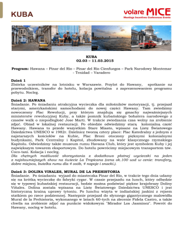 KUBA KUBA 02.03 – 11.03.2015 Program: Hawana – Pinar del Rio – Pinar del Rio Cienfuegos – Park Narodowy Montemar - Trnidad – Varadero Dzień 1 Zbiórka uczestników na lotnisku w Warszawie. Przylot do Hawany, spotkanie nz przewodnikiem, transfer do hotelu, kolacja powitalna z zaprezenowaniem programu pobytu. Nocleg. Dzień 2: HAWANA Śniadanie. Po śniadaniu atrakcyjna wycieczka dla miłośników motoryzacji, tj. przejazd starymi, amerykańskimi samochodami do nowej części Hawany. Tam zwiedzimy nowoczesny Plac Rewolucji, przy którym znajdują się gmachy najważniejszych ministerstw rewolucyjnej Kuby, a także pomnik kubańskiego bohatera narodowego z czasów walk o niepodległość Jose Marti. W trakcie zwiedzania czas wolny na zrobienie zdjęć. Obiad w lokalnej restauracji. Po obiedzie odwiedzimy starą kolonialną część Hawany. Hawana to przede wszystkim Stare Miasto, wpisane na Listę Światowego Dziedzictwa UNESCO w 1982r. Dzielnicę tworzą cztery place: Plac Katedralny z jednym z najstarszych kościołów na Kubie, Plac Broni otoczony pięknymi kolonialnymi budynkami, Park Centralny i Kapitol, zbudowany na wzór klasycznego rzymskiego Kapitolu. Odwiedzimy także muzeum rumu Havana Club, który jest symbolem Kuby i jej największym towarem eksportowym. Do hotelu powrócimy miejscowym transportem tzw. Coco-taxi. Kolacja i nocleg. Dla chętnych możliwość skorzystania z dodatkowo płatnej wycieczki na jeden z najsławniejszych show na świecie La Tropicana (cena ok.100 usd w cenie: transfery, dobre miejsca, butelka rumu dla 4 osób, 4 napoje i snacki.). Dzień 3: DOLINA VINALES, MURAL DE LA PREHISTORIA Śniadanie. Po śniadaniu wyjazd do miasteczka Pinar del Río, w trakcie tego dnia udamy się na krótką wycieczkę do fabryki cygar. W czasie przejazdu na lunch, który odbędzie się w typowej kubańskiej restauracji, będzie można podziwiać piękne krajobrazy Doliny Viñales. Dolina została wpisana na Listę Światowego Dziedzictwa UNESCO i jest historyczną krainą uprawy tytoniu. Po lunchu wizyta w indiańskiej jaskini z rejsem statkiem po rzece podziemnej. Następnie przejazd do słynnego gigantycznego malowidła Mural de la Prehistoria, wykonanego w latach 60-tych na zlecenie Fidela Castro, a także chwila na zrobienie zdjęć na punkcie widokowym "Mirador Los Jasminez". Powrót do Hawany, nocleg w hotelu. KUBA Dzień 4: FARMA KROLODYLI, LAGUNA SKARBÓW Śniadanie. Wykwaterowanie z hotelu. Wyjazd do Cienfuegos. Po drodze zwiedzanie Parku Narodowego Montemar w Cienaga de Zapata. Wycieczkę rozpoczyna wizyta na farmie krokodyli. Następnie po zwiedzeniu farmy udamy się szybką łodzią, która przepływa się przez jezioro "Laguna Skarbów" do repliki wioski indiańskiej Guama. Obiad. Przejazd nad Morze Karaibskie do Ancon, półwyspu położonego obok pięknego miasta Trinidad, do hotelu all inclusive. Kolacja i nocleg. Dzień 5: TRYNIDAD, MUZEUM CHE GUEVARY Śniadanie. Przejazd do Trynidadu. Miasto było jedną z pierwszych siedmiu osad, założonych przez Diego Valazqueza na początku XVI wieku. Trynidad jest jednym z najlepiej zachowanych na świecie miasteczek kolonialnych i znajduje się na liście UNESCO. Przewidziany jest spacer po miasteczku wśród brukowanych uliczek, Plaza Mayor i kościół Świętej Trójcy, a na końcu wizyta w Muzeum La Canchànchara, gdzie skosztować będzie można słynnego drinka z rumu, miodu i limonki. Krótkie zwiedzanie Santa Clara - kolebki rewolucji kubańskiej. Obiad w restauracji, po którym rozpocznie się zwiedzanie miasteczka z głównym punktem programu: Muzeum i Mauzoleum Che Guevary. Przejazd do najsławniejszego kubańskiego kurortu Varadero, do hotelu All inclusive położonego bezpośrednio przy plaży. Dni 6-8: ALL INCLUSIVE Odpoczynek all inclusive. Opcjonalnie: Katamaran na Cayo Blanco z pływaniem z delfinami, plażą, open bar na katamaranie i podczas obiadu – 120 usd/osoba Dzień 9 Ostatnie chwile wypoczynku, transfer na lotnisko w Hawanie i wylot do Europy. CENA: 31/35 osób – 6890 pln w pokoju dbl Dopłata do SGL - 1490 pln Przelot: AF 1247 02 AF 946 02 AF 943 10 AF 1046 11 Marzec Warszawa (WAW) 06:40 Paryż(Charles De Gaulle Intl)(CDG) 09:05 Marzec Paryż (Charles De Gaulle Intl)(CDG) 13:40 Hawana(HAV) 18:05 Marzec Hawana (HAV) 21:25 Paryż(Charles De Gaulle Intl)(CDG) 11:15 Marzec Paryż (Charles De Gaulle Intl)(CDG) 15:30 Warszawa(WAW)17:40 KUBA CENA OBEJMUJE: - hotele 3-4* według lokalnej kategorii - 3 posiłki dziennie, all w Ancon/Trinidad i w Varadero - napoje do obiadów - bilety wstępu - transport klimatyzowanym busem - przewodnika w języku polskim na całej trasie - opiekę organizatora - ubezpieczenie KL, NNW i bagaż CENA NIE OBEJMUJE: - napojów do kolacji (ok. 3 usd/pax) - wizy na Kubę (ok 25 usd) - opłat lotniskowych w Hawanie (ok 30 usd) - napiwków dla kierowcy i przewodnika Zakwaterowanie: Hawana: hotel Copacabana*** Położenie:hotel położony w Hawanie, w prestiżowej dzielnicy placówek dyplomatycznych Miramar, 5 km od centrum konferencyjnego, 6 km od starego miasta, 20 km od międzynarodowego lotniska Jose Marti w Hawanie. Obiekt należy do znanej sieci Cubanacan Hotels. Skromny kompleks wypoczynkowy składaja się z trzypiętrowego budynku głównego oraz dwupiętrowej willi, oferuje 103 pokoi standardowe. Oficjalna kategoria kubańska ***.Copacabana to miejsce idealne dla miłośników aktywnego wypoczynku i miejskiego stylu życia, w okolicy znajdują się liczne sklepy, kawiarnie, bary oraz dyskoteki. Do dyspozycji gości: recepcja, kantor wymiany walut, fax, sejf, restauracja (kuchnia międzynarodowa), pizzeria, lobby bar (czynny całą dobę), wypożyczalnia samochodów, sklep (pamiątki, rum, cygara), sala konferencyjna, codzienna prasa, dostęp do internetu (płatny dodatkowo), pralnia (płatna dodatkowo), informacja turystyczna, opieka medyczna 24h (na życzenie, płatna dodatkowo). KUBA Sport i rozrywki: 2 baseny odkryte (jeden ze słodką, drugi ze słon