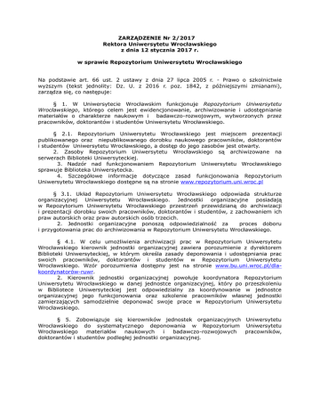 ZARZĄDZENIE Nr 2/2017 Rektora Uniwersytetu Wrocławskiego z dnia 12 stycznia 2017 r. w sprawie Repozytorium Uniwersytetu Wrocławskiego Na podstawie art. 66 ust. 2 ustawy z dnia 27 lipca 2005 r. - Prawo o szkolnictwie wyższym (tekst jednolity: Dz. U. z 2016 r. poz. 1842, z późniejszymi zmianami), zarządza się, co następuje: § 1. W Uniwersytecie Wrocławskim funkcjonuje Repozytorium Uniwersytetu Wrocławskiego, którego celem jest ewidencjonowanie, archiwizowanie i udostępnianie materiałów o charakterze naukowym i badawczo-rozwojowym, wytworzonych przez pracowników, doktorantów i studentów Uniwersytetu Wrocławskiego. § 2.1. Repozytorium Uniwersytetu Wrocławskiego jest miejscem prezentacji publikowanego oraz niepublikowanego dorobku naukowego pracowników, doktorantów i studentów Uniwersytetu Wrocławskiego, a dostęp do jego zasobów jest otwarty. 2. Zasoby Repozytorium Uniwersytetu Wrocławskiego są archiwizowane na serwerach Biblioteki Uniwersyteckiej. 3. Nadzór nad funkcjonowaniem Repozytorium Uniwersytetu Wrocławskiego sprawuje Biblioteka Uniwersytecka. 4. Szczegółowe informacje dotyczące zasad funkcjonowania Repozytorium Uniwersytetu Wrocławskiego dostępne są na stronie www.repozytorium.uni.wroc.pl § 3.1. Układ Repozytorium Uniwersytetu Wrocławskiego odpowiada strukturze organizacyjnej Uniwersytetu Wrocławskiego. Jednostki organizacyjne posiadają w Repozytorium Uniwersytetu Wrocławskiego przestrzeń przewidzianą do archiwizacji i prezentacji dorobku swoich pracowników, doktorantów i studentów, z zachowaniem ich praw autorskich oraz praw autorskich osób trzecich. 2. Jednostki organizacyjne ponoszą odpowiedzialność za proces doboru i przygotowania prac do archiwizowania w Repozytorium Uniwersytetu Wrocławskiego. § 4.1. W celu umożliwienia archiwizacji prac w Repozytorium Uniwersytetu Wrocławskiego kierownik jednostki organizacyjnej zawiera porozumienie z dyrektorem Biblioteki Uniwersyteckiej, w którym określa zasady deponowania i udostępniania prac swoich pracowników, doktorantów i studentów w Repozytorium Uniwersytetu Wrocławskiego. Wzór porozumienia dostępny jest na stronie www.bu.uni.wroc.pl/dlakoordynatorów-ruwr. 2. Kierownik jednostki organizacyjnej powołuje koordynatora Repozytorium Uniwersytetu Wrocławskiego w danej jednostce organizacyjnej, który po przeszkoleniu w Bibliotece Uniwersyteckiej jest odpowiedzialny za koordynowanie w jednostce organizacyjnej jego funkcjonowania oraz szkolenie pracowników własnej jednostki zamierzających samodzielnie deponować swoje prace w Repozytorium Uniwersytetu Wrocławskiego. § 5. Zobowiązuje się kierowników jednostek organizacyjnych Uniwersytetu Wrocławskiego do systematycznego deponowania w Repozytorium Uniwersytetu Wrocławskiego materiałów naukowych i badawczo-rozwojowych pracowników, doktorantów i studentów podległej jednostki organizacyjnej. § 6. Nadzór nad wykonaniem niniejszego zarządzenia powierza się Prorektorowi ds. nauki. § 7. Zarządzenie wchodzi w życie z dniem podpisania. prof. dr hab. Adam Jezierski REKTOR