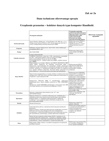 Zał. nr 2a Dane techniczne oferowanego sprzętu Urządzenie przenośne – kolektor danych typu komputer Handheld. Wymagania minimalne System operacyjny Programy Pamięć Gniazda rozszerzeń Porty WE/WY Wyświetlacz Klawiatura Dźwięk Zasilanie System Windows Mobile min. v5.0 lub Windows CE .NET min. v.4.2. z obsługą strony kodowej Windows-1250, System operacyjny musi być w wersji z obsługą funkcji transmisji danych przez GPRS Wymagania opcjonalne (preferowane) lub jeżeli sprzęt kupowany będzie w przetargu nieograniczonym, gdzie oprócz zastosowania kryterium ceny będzie stosowane kryterium jakości Preferowany system Windows Mobile min. 5.0, z polską nakładką językową, w wersji z obsługą transmisji danych i głosu Kalkulator, program obsługi poczty, edytor tekstu, arkusz kalkulacyjny przeglądarka plików .pdf, Min. RAM 64MB Compact Flash II lub SD Urządzenie wyposażone w kartę min. 2 GB, o parametrach: w przypadku kart SD – maksymalna prędkość zapisu nie mniej niż 20 MB/s maksymalna prędkość odczytu nie niej niż 20 MB/s; W przypadku kart CF – szybkość zapisu min 16MB/s, szybkość odczytu min. 20MB/s Wyprowadzony na zewnątrz obudowy port RS232 (EIA/TIA574) DB9 Męski (Male). Dopuszcza się zamiennie zastosowanie kabla z identycznym wyprowadzeniem lub przenośnego modułu sprzętowego (adaptera), którego wytrzymałość na uszkodzenia mechaniczne nie będzie stwarzać ograniczeń w wielokrotnym podłączaniu kabla do urządzenia oraz zapewni stabilność połączenia. Używanie takiego połączenia nie może kolidować z równoczesną możliwością ładowania akumulatora. Preferowana większa ilość pamięci RAM (128 MB lub więcej) Preferowany port RS232 (EIA/TIA574) DB9 Męski (Male) wyprowadzony bezpośrednio z obudowy urządzenia Preferowany port USB HOST Wyprowadzony bezpośrednio na zewnątrz obudowy urządzenia lub stacji bezpośrednio w urządzeniu lub dokującej port USB Client (Slave) lub kabel podłączany bezpośrednio do dostępny za pomocą kabla z urządzenia z wyprowadzeniem USB identycznym wyprowadzeniem lub dostępny w stacji dokującej Preferowany dostępny w stacji Zintegrowany Bluetooth class II (umożliwiający jednoczesną dokującej lub wyprowadzony bezkolizyjną pracę. innych urządzeń radiowych tj. WiFi, GSM/GPRS, bezpośrednio na zewnątrz obudowy lub dostępny za GPS ) Wbudowany moduł GSM/GPRS umożliwiający zastosowanie karty SIM pomocą kabla z identycznym dowolnego operatora sieci komórkowej działającego w Polsce wyprowadzeniem port LAN (Ethernet 10/100Base T) Preferowany wbudowany moduł WLAN 802.11b/g Preferowany wyświetlacz full Kolorowy, podświetlany ekran dotykowy min. 3,5" min. VGA min. 480*640 lub 240*320/320*240 pix. 640*480 pix Minimum 50 klawiszy, wydzielona alfanumeryczna, multifunkcyjna, z oddzielnymi klawiszami numerycznymi umożliwiająca wprowadzanie polskich znaków ( w standardzie polski programisty). Możliwość „miękkiego” resetu urządzenia poprzez klawiaturę urządzenia (bez kasowanie pamięci RAM) Preferowany wbudowany Głośnik lub brzęczyk głośnik i mikrofon Preferowane zasilanie zapasowe Ładowalna bateria główna o największej oferowanej przez producenta z zewnętrznych akumulatorów z pojemności. możliwością ładowania i Zapasowa bateria z możliwością ładowania poza urządzeniem za pomocą zasilania komputera oraz innych ładowarki sieciowej (stacji dokującej) lub zestaw akumulatorów urządzeń (np. drukarki zewnętrznych, z możliwością ładowania przy użyciu ładowarki sieciowej termicznej) lub samochodowej, umożliwiający zasilanie (ładowanie) urządzenia. Bateria lub inne urządzenie podtrzymujące RAM co najmniej na czas wymiany baterii lub wymiany karty – czyli przez co najmniej 3 minuty Ładowarka sieciowa i ładowarka samochodowa lub zamiast ładowarki samochodowej - uchwyt samochodowy z możliwością ładowania Masa Maksymalnie 1000g z baterią i wszystkimi wymaganymi wewnętrznymi modułami (kartami) Preferowana waga poniżej 750 g ze wszystkim wymaganymi wewn. kartami (modułami) Oferowane wymagania opcjonalne Wymagania opcjonalne (preferowane) lub jeżeli sprzęt kupowany będzie w przetargu nieograniczonym, gdzie oprócz zastosowania kryterium ceny będzie stosowane kryterium jakości Wymagania minimalne Warunki pracy Akcesoria Certyfikaty Gwarancja Instrukcje Inne wymagania Wytrzymałość na 5 upadków (dowolną płaszczyzną i krawędzią urządzenia) na gładki beton z wysokości 1.2 m, temperatura pracy -20 o +50oC, spełnienie stopnia ochrony min.IP64 wg PN-92/E-08106 lub IEC529 Urządzenie musi pozostawać nieruchome w trakcie wprowadzania danych do urządzenia leżącego na płaskiej powierzchni pasek na rękę (zabezpieczający przed wypadaniem z ręki), pasek na ramię, rysik, min 5 folii ochronnych na ekran, kabel USB do połączeń z PC, torba lub walizka transportowa umożliwiająca przenoszenie urządzenia wraz ze wszystkimi akcesoriami (poza stacją dokującą). Stacja dokująca wraz z możliwością bezpośredniego podłączenia do sieci LAN (Ethernet 10/100 Base T), umożliwiająca jednoczesne ładowanie baterii zapasowej i baterii w urządzeniu wyposażona w porty USB hosta i urządzenia. Zewnętrzna klawiatura podłączana bezpośrednio do urządzenia lub stacji dokującej lub podłączana do urządzenia poprzez łącza bezprzewodowe. Używanie zewnętrznej klawiatury nie może kolidować z jednoczesnym wykorzystaniem zewnętrznego monitora. Urządzenie musi spełniać wszelkie obowiązujące w Polsce wymagania dla tego typu urządzeń, w szczególności określone w Rozporządzeniu Ministra Gospodarki z dnia 27 marca 2007 r. w sprawie szczegółowych wymagań ograniczenia wykorzystywania w sprzęcie elektronicznym i elektrycznym niektórych substancji mogących negatywnie oddziaływać na środowisko. Spełnienie powyższych wymagań musi być potwierdzone w oświadczeniu dostawcy. Minimum 24 miesiące, usunięcie uster