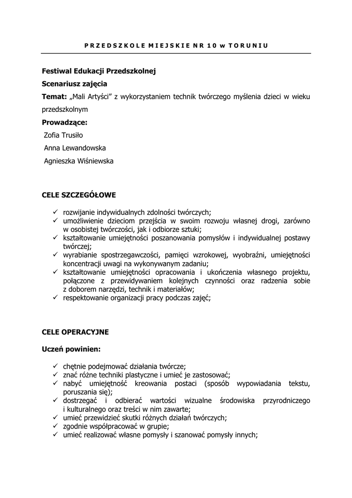 PRZEDSZKOLE MIEJSKIE NR 10 w TORUNIU Festiwal Edukacji Przedszkolnej Scenariusz zajęcia Temat: „Mali Artyści” z wykorzystaniem technik twórczego myślenia dzieci w wieku przedszkolnym Prowadzące: Zofia Trusiło Anna Lewandowska Agnieszka Wiśniewska CELE SZCZEGÓŁOWE rozwijanie indywidualnych zdolności twórczych; umożliwienie dzieciom przejścia w swoim rozwoju własnej drogi, zarówno w osobistej twórczości, jak i odbiorze sztuki; kształtowanie umiejętności poszanowania pomysłów i indywidualnej postawy twórczej; wyrabianie spostrzegawczości, pamięci wzrokowej, wyobraźni, umiejętności koncentracji uwagi na wykonywanym zadaniu; kształtowanie umiejętności opracowania i ukończenia własnego projektu, połączone z przewidywaniem kolejnych czynności oraz radzenia sobie z doborem narzędzi, technik i materiałów; respektowanie organizacji pracy podczas zajęć; CELE OPERACYJNE Uczeń powinien: chętnie podejmować działania twórcze; znać różne techniki plastyczne i umieć je zastosować; nabyć umiejętność kreowania postaci (sposób wypowiadania tekstu, poruszania się); dostrzegać i odbierać wartości wizualne środowiska przyrodniczego i kulturalnego oraz treści w nim zawarte; umieć przewidzieć skutki różnych działań twórczych; zgodnie współpracować w grupie; umieć realizować własne pomysły i szanować pomysły innych; METODY I FORMY Aktywizowanie uczniów i wzbudzanie ich zainteresowania technikami twórczymi odbywać się będzie poprzez stosowanie atrakcyjnych form i metod opartych na : - obserwacji i pokazie, przekazie słownym, audiowizualnym, rozwiązywaniu zadań według własnego pomysłu dziecka, samodzielnym doświadczeniu dziecka, spontanicznej, swobodnej aktywności dziecka, grach dydaktycznych, twórczych zajęciach plastycznych i literackich, zajęciach indywidualnych i zespołowych. Realizacja programu wymaga od nauczyciela dużej elastyczności, a umiejętne wykorzystanie metod i form powinno zaowocować twórczą i prospołeczną postawą dzieci. Przebieg zajęcia 1. Powitanie – prowadzący wita uczestników tak, aby wszyscy czuli się powitani indywidualnie: Witam wszystkich: - którym smakowało śniadanie, - którzy lubią ciekawe zabawy i podróże, - którzy lubią tajemnice i zagadki, itp. 2. „Pokaż, co czujesz” – Prowadzący rozdaje szablony twarzy smutnej, wesołej i złej. Następnie prosi, aby wybrały te, które najbardziej odpowiadają ich nastrojowi (w tle spokojna muzyka). Uczestnicy mają chwilę na zastanowienie i umieszczenie szablonu na wysokości twarzy. Prowadzący przechadza się po sali z dużym lustrem i pozwala przypatrzeć się każdemu dziecku swemu odbiciu. Twarz wesoła Twarz zła Twarz smutna 3. Następnie prowadzący rozdaje uczestnikom zajęć karty pracy i prosi, aby przy użyciu pasteli, ołówka i kredek świecowych zmienili rysunek w coś innego (w tle spokojna muzyka). Zmień rysunek w coś innego. Zmień rysunek w coś innego. Zmień rysunek w coś innego. Zmień rysunek w coś innego. Prezentacja prac i omówienie. 4. Prowadzący zaprasza do zabawy – „MAGICZNY KUFER” Każde dziecko wystąpi indywidualnie przed grupą. Na środku miejsca zabaw leży kufer. Należy go otworzyć i opisać widzom, co zawiera (posługując się przy tym wyobraźnią, bo oczywiście kufer jest pusty). Żadne bariery nie mogą ograniczać wyobraźni dziecka i każdy jego pomysł powinien być zaakceptowany. Tak więc kufer równie dobrze może zawierać „dom, w którym mieszkam”, jak i „miłość mojej mamy” czy „szczoteczkę do zębów”. Można pomóc dziecku, zadając pytania szczegółowe. To, co „widzi” ono w kufrze, powinno być opisane tak sugestywnie, aby niemal „ukazało się widzom przed oczami”. 5. Prowadzący zaprasza uczestników do ćwiczenia p.n. „Jesteś bąbelkiem gazu coca coli” (zał. nr 1 – tekst wprowadzający do ćwiczenia związanego z analogią personalną, rysunki dzieci. a) Zaproszenie uczestników do degustacji „coca-coli” – wyczucie smaku. b) Zapraszam was teraz do rozmowy o bąbelkach gazu w „coca-coli”, jak wyglądają, jak smakują, jakie są duże, czy są lekkie czy ciężkie, czy są widoczne czy nie, jaki mają kształt, jak smakują? c) Zmiana otoczenia obiektu. Łączenie odległych właściwości. Opis wyrażonej sytuacji: przeniesienie siebie w inne środowisko: spróbujcie pomyśleć, w co musimy być wyposażeni, abyśmy mogli dostosować się do nowych warunków życia i przeżyć, jak będziemy teraz wyglądać, co się w nas zmieni, spróbujcie zapamiętać swoje wyobrażenia. d) Synteza pojęciowa – spróbujcie poszukać nowej nazwy dla bąbelków, np.: bąbel – Lizak, Wesoły – bąbelek. e) A teraz zapraszam was do ekspresji plastycznej za pomocą farb, jak wyobrażacie sobie swojego bąbelka w nowym dla niego otoczeniu. f) Podsumowanie pracy – omówienie prac. Zorganizowanie wystawki. 6. Prowadzący zaprasza do zabawy – „MIM” Wszystkie dzieci znajdują się na miejscu zabaw. Jeśli zajdzie taka potrzeba, należy je podzielić na dwie grupy. Dzieci będą naśladować określone czynności bez użycia rekwizytów. Należy skrupulatnie sprawdzić i korygować poszczególne gesty i pozycje. Ruchy zespołów muszą być zsynchronizowane. Oto kilka przykładów czynności do odegrania wskazanych przez Mima: przenoszenie bardzo ciężkiego pianina, wyciąganie z morza sieci pełnej ryb, przeciąganie liny (uczestniczą dwie grupy), podnoszenie ogromnego kamienia, branie ostrego zakrętu samochodem, obserwowanie przelatującego samolotu. 7. Zapraszam do tworzenia wspólnej metafory obrazowo – wizualnej. Wybór obiektu. Wspólnie wybieramy obiekt wyjściowy, np. drzewo. a) Szukamy bliskich analogii Zachęcamy dzieci do wymienienia jak największej liczby skojarzeń związanych z obiektem. Ich duża ilość pozwala na znalezienie najbardziej trafnej analogii. Prosimy też dzieci o uzasadnienie skojarzen