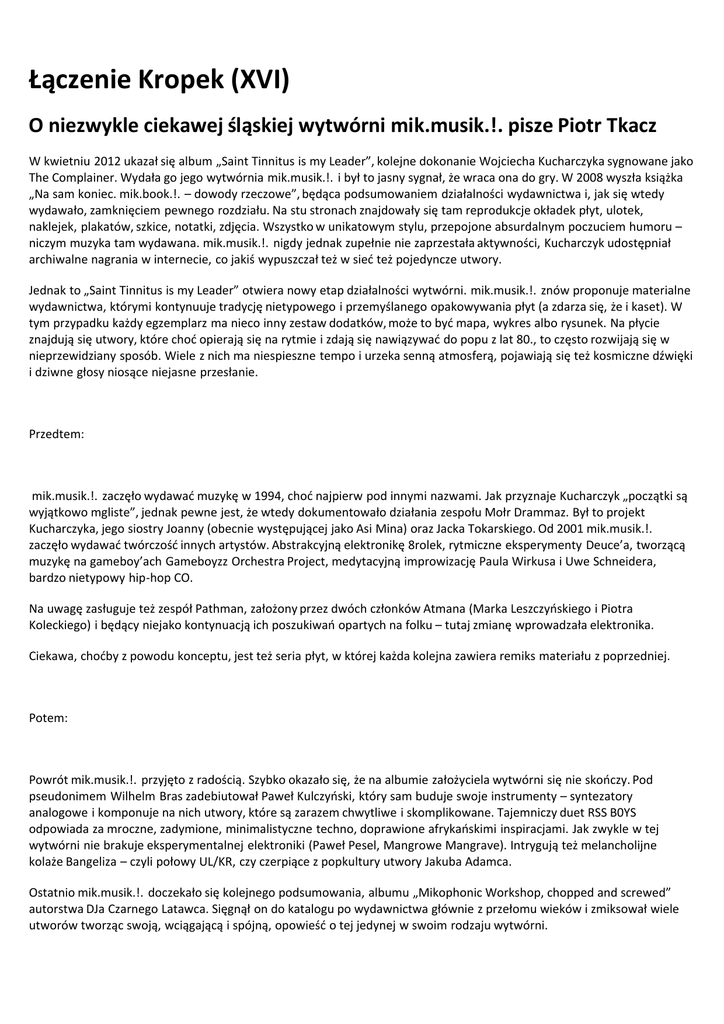 Łączenie Kropek (XVI) O niezwykle ciekawej śląskiej wytwórni mik.musik.!. pisze Piotr Tkacz W kwietniu 2012 ukazał się album „Saint Tinnitus is my Leader”, kolejne dokonanie Wojciecha Kucharczyka sygnowane jako The Complainer. Wydała go jego wytwórnia mik.musik.!. i był to jasny sygnał, że wraca ona do gry. W 2008 wyszła książka „Na sam koniec. mik.book.!. – dowody rzeczowe”, będąca podsumowaniem działalności wydawnictwa i, jak się wtedy wydawało, zamknięciem pewnego rozdziału. Na stu stronach znajdowały się tam reprodukcje okładek płyt, ulotek, naklejek, plakatów, szkice, notatki, zdjęcia. Wszystko w unikatowym stylu, przepojone absurdalnym poczuciem humoru – niczym muzyka tam wydawana. mik.musik.!. nigdy jednak zupełnie nie zaprzestała aktywności, Kucharczyk udostępniał archiwalne nagrania w internecie, co jakiś wypuszczał też w sieć też pojedyncze utwory. Jednak to „Saint Tinnitus is my Leader” otwiera nowy etap działalności wytwórni. mik.musik.!. znów proponuje materialne wydawnictwa, którymi kontynuuje tradycję nietypowego i przemyślanego opakowywania płyt (a zdarza się, że i kaset). W tym przypadku każdy egzemplarz ma nieco inny zestaw dodatków, może to być mapa, wykres albo rysunek. Na płycie znajdują się utwory, które choć opierają się na rytmie i zdają się nawiązywać do popu z lat 80., to często rozwijają się w nieprzewidziany sposób. Wiele z nich ma niespieszne tempo i urzeka senną atmosferą, pojawiają się też kosmiczne dźwięki i dziwne głosy niosące niejasne przesłanie. Przedtem: mik.musik.!. zaczęło wydawać muzykę w 1994, choć najpierw pod innymi nazwami. Jak przyznaje Kucharczyk „początki są wyjątkowo mgliste”, jednak pewne jest, że wtedy dokumentowało działania zespołu Mołr Drammaz. Był to projekt Kucharczyka, jego siostry Joanny (obecnie występującej jako Asi Mina) oraz Jacka Tokarskiego. Od 2001 mik.musik.!. zaczęło wydawać twórczość innych artystów. Abstrakcyjną elektronikę 8rolek, rytmiczne eksperymenty Deuce’a, tworzącą muzykę na gameboy’ach Gameboyzz Orchestra Project, medytacyjną improwizację Paula Wirkusa i Uwe Schneidera, bardzo nietypowy hip-hop CO. Na uwagę zasługuje też zespół Pathman, założony przez dwóch członków Atmana (Marka Leszczyńskiego i Piotra Koleckiego) i będący niejako kontynuacją ich poszukiwań opartych na folku – tutaj zmianę wprowadzała elektronika. Ciekawa, choćby z powodu konceptu, jest też seria płyt, w której każda kolejna zawiera remiks materiału z poprzedniej. Potem: Powrót mik.musik.!. przyjęto z radością. Szybko okazało się, że na albumie założyciela wytwórni się nie skończy. Pod pseudonimem Wilhelm Bras zadebiutował Paweł Kulczyński, który sam buduje swoje instrumenty – syntezatory analogowe i komponuje na nich utwory, które są zarazem chwytliwe i skomplikowane. Tajemniczy duet RSS B0YS odpowiada za mroczne, zadymione, minimalistyczne techno, doprawione afrykańskimi inspiracjami. Jak zwykle w tej wytwórni nie brakuje eksperymentalnej elektroniki (Paweł Pesel, Mangrowe Mangrave). Intrygują też melancholijne kolaże Bangeliza – czyli połowy UL/KR, czy czerpiące z popkultury utwory Jakuba Adamca. Ostatnio mik.musik.!. doczekało się kolejnego podsumowania, albumu „Mikophonic Workshop, chopped and screwed” autorstwa DJa Czarnego Latawca. Sięgnął on do katalogu po wydawnictwa głównie z przełomu wieków i zmiksował wiele utworów tworząc swoją, wciągającą i spójną, opowieść o tej jedynej w swoim rodzaju wytwórni. Posłuchaj wszystkich wydawnictw mik.musik.!.: http://mikmusikarchive.bandcamp.com. Piotr TKACZ