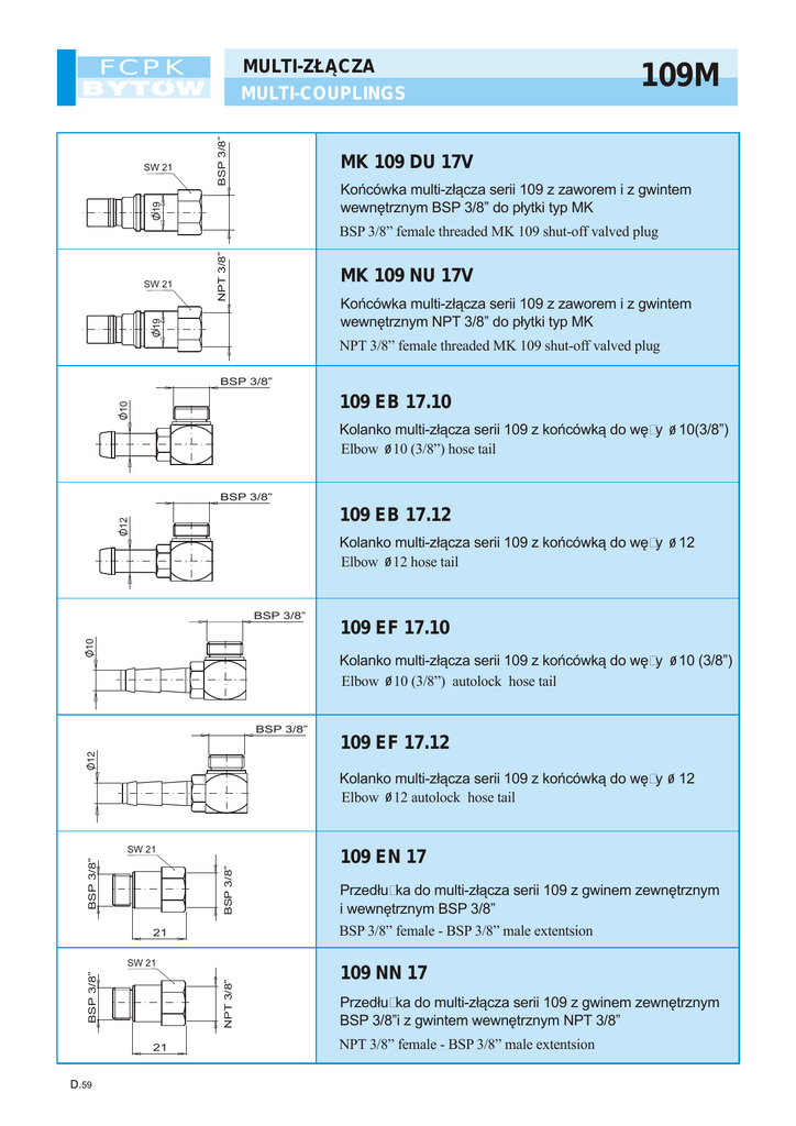 MULTI-ZŁĄCZA MULTI-COUPLINGS 109M MK 109 DU 17V Końcówka multi-złącza serii 109 z zaworem i z gwintem wewnętrznym BSP 3/8” do płytki typ MK O19 SW 21 BSP 3/8” FCPK MK 109 NU 17V Końcówka multi-złącza serii 109 z zaworem i z gwintem wewnętrznym NPT 3/8” do płytki typ MK O19 SW 21 NPT 3/8” BSP 3/8” female threaded MK 109 shut-off valved plug NPT 3/8” female threaded MK 109 shut-off valved plug BSP 3/8” O10 109 EB 17.10 Kolanko multi-złącza serii 109 z końcówką do węży Elbow 10 (3/8”) hose tail 10(3/8”) BSP 3/8” O12 109 EB 17.12 Kolanko multi-złącza serii 109 z końcówką do węży Elbow 12 hose tail O10 BSP 3/8” 12 109 EF 17.10 Kolanko multi-złącza serii 109 z końcówką do węży Elbow 10 (3/8”) autolock hose tail 10 (3/8”) BSP 3/8” O12 109 EF 17.12 Kolanko multi-złącza serii 109 z końcówką do węży Elbow 12 autolock hose tail BSP 3/8” BSP 3/8” SW 21 NPT 3/8” BSP 3/8” SW 21 D.59 109 EN 17 Przedłużka do multi-złącza serii 109 z gwinem zewnętrznym i wewnętrznym BSP 3/8” BSP 3/8” female - BSP 3/8” male extentsion 21 21 12 109 NN 17 Przedłużka do multi-złącza serii 109 z gwinem zewnętrznym BSP 3/8”i z gwintem wewnętrznym NPT 3/8” NPT 3/8” female - BSP 3/8” male extentsion