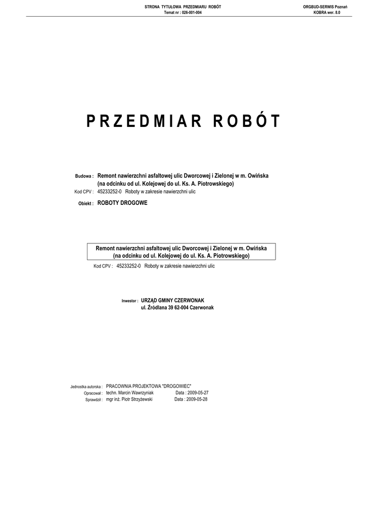 STRONA TYTUŁOWA PRZEDMIARU ROBÓT Temat nr : 026-001-004 PRZEDMIAR ROBÓT Budowa : Remont nawierzchni asfaltowej ulic Dworcowej i Zielonej w m. Owińska (na odcinku od ul. Kolejowej do ul. Ks. A. Piotrowskiego) Kod CPV : 45233252-0 Roboty w zakresie nawierzchni ulic Obiekt : ROBOTY DROGOWE Remont nawierzchni asfaltowej ulic Dworcowej i Zielonej w m. Owińska (na odcinku od ul. Kolejowej do ul. Ks. A. Piotrowskiego) Kod CPV : 45233252-0 Roboty w zakresie nawierzchni ulic Inwestor : URZĄD GMINY CZERWONAK ul. Źródlana 39 62-004 Czerwonak Jednostka autorska : PRACOWNIA PROJEKTOWA "DROGOWIEC" Opracował : techn. Marcin Wawrzyniak Sprawdził : mgr inŜ. Piotr StrzyŜewski Data : 2009-05-27 Data : 2009-05-28 ORGBUD-SERWIS Poznań KOBRA wer. 8.0 PRZEDMIAR ROBÓT Temat nr : 026-001-004 ORGBUD-SERWIS Poznań KOBRA wer. 8.0 Budowa : Remont nawierzchni asfaltowej ulic Dworcowej i Zielonej w m. Owińska (na odcinku od ul. Kolejowej do ul. Ks. A. Piotrowskiego) Obiekt : ROBOTY DROGOWE Remont nawierzchni asfaltowej ulic Dworcowej i Zielonej w m. Owińska (na odcinku od ul. Kolejowej do ul. Ks. A. Piotrowskiego) Data : 2009-05-29 Lp. Str: 1 Podstawa kalkulacji / Opis pozycji Ilość Jedn. miary A. STAN : 01.00.00. ROBOTY PRZYGOTOWAWCZE A.a. ELEMENT : 01.01.01. Odtworzenie (wytyczenie) trasy i punktów wysokościowych Numer specyfikacji : ST 01.01.01. 1. KNR 201-0119-03-00 Roboty pomiarowe przy liniowych robotach ziemnych - trasa dróg w terenie równinnym 1,122 km Numer specyfikacji : ST 01.01.01. A.b. ELEMENT : 01.02.04. Rozbiórki elementów dróg Numer specyfikacji : ST 01.02.04 2. KNR 003-0101-02-00 ATHENASOFT Warszawa Roboty remontowe - cięcie piłą nawierzchni : bitumicznych,na głębokość od 6 do 10 cm (cięcie nawierzchni w celu wbudowania opornika pomiędzy nawierzchnią bitumiczną a warstwą betonu, na łuku w km 0+250) 27,000 m Numer specyfikacji : ST 01.02.04 3. KNR 231-0815-01-00 IGM Warszawa 390,000 m2 [ Wydanie - Warszawa 1991 r.z uwzgl.BI do 9/96 ] Rozebranie chodników, wysepek przystankowych i przejść dla pieszych, z płyt: betonowych 35x35x5 cm, na podsypce piaskowej Rozbiórka chodników na ul. Zielonej w rejonie zatok autobusowych na odcinku od 0+800 do 0+927 oraz wzdłuŜ posesji ul. Zielona 13 w km 0+700 Numer specyfikacji : ST 01.02.04 Opis pozycji obmiaru WyraŜenie arytmetyczne Wynik 288+61+41 = 390,000 Razem obmiar = 390,000 4. KNR 231-0810-02-00 IGM Warszawa 39,000 m2 [ Wydanie - Warszawa 1991 r.z uwzgl.BI do 9/96 ] Rozebranie nawierzchni z klinkieru drogowego na podsypce: cementowo-piaskowej PrzełoŜenie nawierzchni z kostki betonowej na chodniku i zjezdzie przy posesji ul. Zielona 6 Numer specyfikacji : ST 01.02.04 5. KNR 231-0810-05-00 IGM Warszawa 75,000 m2 Rozebranie mechaniczne nawierzchni z betonu zwykłego, o grubości: 12 cm Rozebranie nawierzchni betonowej gr.20cm (zjazd przy posesji ul. Zielona 5 oraz przy skrzyŜowaniu ulic Zielonej i Krótkiej) Numer specyfikacji : ST 01.02.04 6. KNR 231-0810-06-00 IGM Warszawa 75,000 m2 [ Wydanie - Warszawa 1991 r.z uwzgl.BI do 9/96 ] Rozebranie mechaniczne nawierzchni z betonu zwykłego, o grubości: ponad 12 cm - dodatek za kaŜdy dalszy 1 cm Rozebranie nawierzchni betonowej gr.20cm (zjazd przy posesji ul. Zielona 5 oraz przy skrzyŜowaniu ulic Zielonej i Krótkiej) Krotność 8 Numer specyfikacji : ST 01.02.04 7. KNR 231-0815-01-00 IGM Warszawa [ Wydanie - Warszawa 1991 r.z uwzgl.BI do 9/96 ] Rozebranie chodników, wysepek przystankowych i przejść dla pieszych, z płyt: betonowych 35x35x5 cm, na podsypce piaskowej Rozbiórka nawierzchni zatok autobusowych przy ul. 181,000 m2 PRZEDMIAR ROBÓT Temat nr : 026-001-004 ORGBUD-SERWIS Poznań KOBRA wer. 8.0 Remont nawierzchni asfaltowej ulic Dworcowej i Zielonej w m. Owińska (na odcinku od ul. Kolejowej do ul. Ks. A. Piotrowskiego) Data : 2009-05-29 STAN : A. 01.00.00. ROBOTY PRZYGOTOWAWCZE ELEMENT : A.b. 01.02.04. Rozbiórki elementów dróg Lp. Podstawa kalkulacji / Opis pozycji Str: 2 Ilość Jedn. miary Zielonej. Numer specyfikacji : ST 01.02.04 8. KNR 231-0801-03-00 IGM Warszawa Rozebranie mechaniczne podbudowy betonowej o grubości: 12 cm Rozbiórka podbudowy betonowej gr. 20cm zatok autobusowych przy ul. Zielonej. 181,000 m2 Numer specyfikacji : ST 01.02.04 9. KNR 231-0801-04-00 IGM Warszawa 181,000 m2 [ Wydanie - Warszawa 1991 r.z uwzgl.BI do 9/96 ] Rozebranie mechaniczne podbudowy betonowej o grubości: ponad 12 cm - dodatek za kaŜdy dalszy 1 cm Rozbiórka podbudowy betonowej gr. 20cm zatok autobusowych przy ul. Zielonej. Krotność 8 Numer specyfikacji : ST 01.02.04 10. KNR 231-0813-02-00 IGM Warszawa 375,000 m [ Wydanie - Warszawa 1991 r.z uwzgl.BI do 9/96 ] Rozebranie krawęŜników betonowych o wymiarach: 20x30 cm, na podsypce piaskowej WzdłuŜ zabudowy na ul. Zielonej od skrzyŜowania z ul. Krótką do końca opracowania km 0+927 oraz przy zatoce autobusowej po drugiej stronie w km około 0+840 Numer specyfikacji : ST 01.02.04 11. KNR 231-0812-03-00 IGM Warszawa 28,125 m3 [ Wydanie - Warszawa 1991 r.z uwzgl.BI do 9/96 ] Rozebranie ław pod krawęŜniki, przy ławie: z betonu Numer specyfikacji : ST 01.02.04 Opis pozycji obmiaru WyraŜenie arytmetyczne 12. KNR 231-0814-03-00 IGM Warszawa Wynik 375*0,075 = 28,125 Razem obmiar = 28,125 143,000 m [ Wydanie - Warszawa 1991 r.z uwzgl.BI do 9/96 ] Rozebranie krawęŜników wtopionych, o wymiarach: 12x25 cm, na podsypce piaskowej WzdłuŜ ul. Zielonej, po drugiej stronie zabudowy na odcinku od ul. Krótkiej tj. km 0+662 do zatoki autobusowej km 0+800. Numer specyfikacji : ST 01.02.04 13. KNR 231-0814-01-00 IGM Warszawa Rozebranie obrzeŜy trawnikowych na podsypce piaskowej, o wymiarach: 6x20 cm Rozbiórka obrzeŜy przy chodnikach na ul. Zielonej w rejonie zatok autobusowych na odcinku od 0+800 do 0+927 oraz wzdłuŜ posesji ul. Zielona 13 w km 0+700 86,000 m Numer specyfikacji : ST 01.02.04 14. KNR 404-1103-01-00 IGM Warszawa 203,546 m3 [ Wydanie - Warszawa 1994 r.z uwzg.BI do 9/96 ] Załadowanie gruzu koparko
